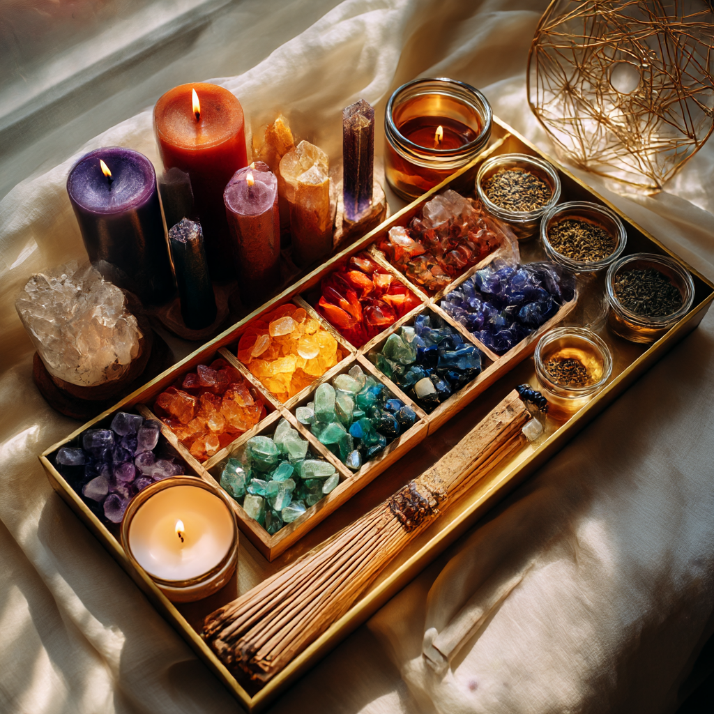 Each kit is curated with intention, featuring crystals, candles, incense, and more to activate and align each energy center.
