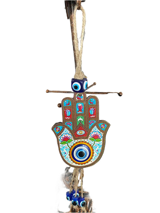 Wooden Hand of Fatima with Rope Hanging Talisman W/Evil Eye Amulet & Wooden Beads