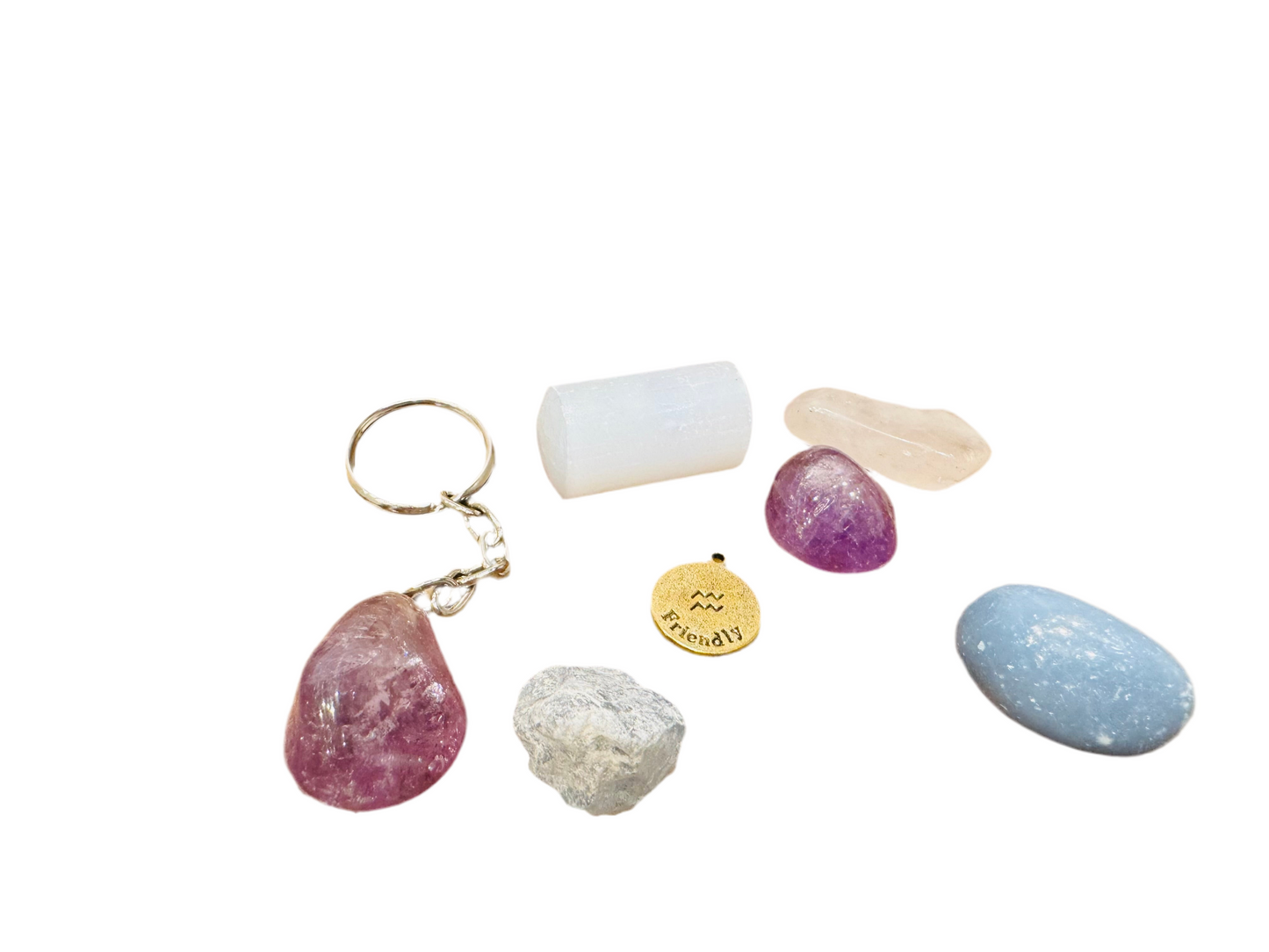 The Aquarius Kit includes Celestite, a crystal that gently calms the mind, releasing stress and inviting inner peace. Rose Quartz radiates pure, unconditional love, encouraging both self-love and harmonious relationships. Amethyst offers spiritual protection, shielding your energy from negativity while enhancing intuition. Angelite serves as a bridge to divine guidance, helping you feel supported by angelic energy. Selenite is your essential crystal for cleansing, clarity, and maintaining a high vibration all year round.