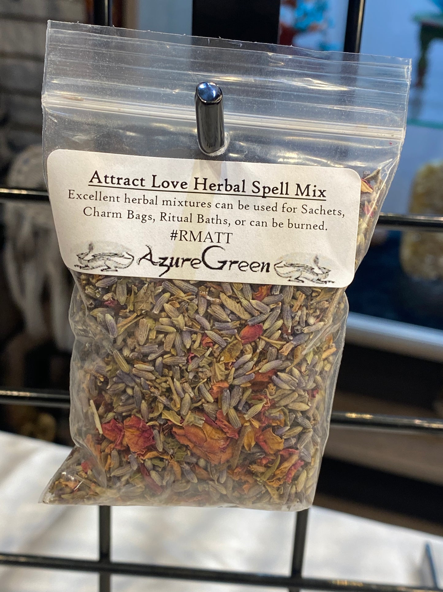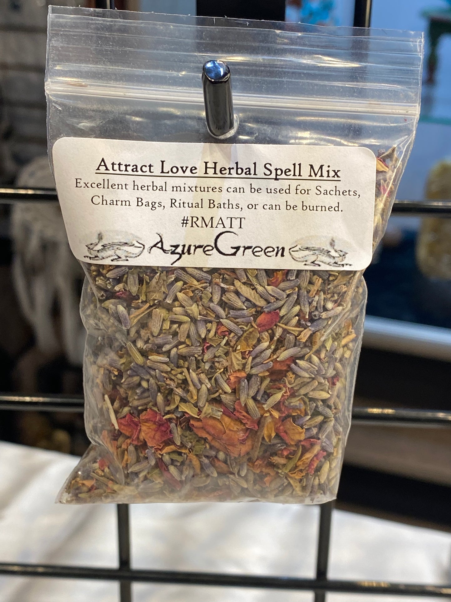 Azure Green Attract Love spell mix is intended to bring love into your life, or help the one that you desire fall for you. Use on charcoal to burn, add to your bath, potpourri or mojo bag.