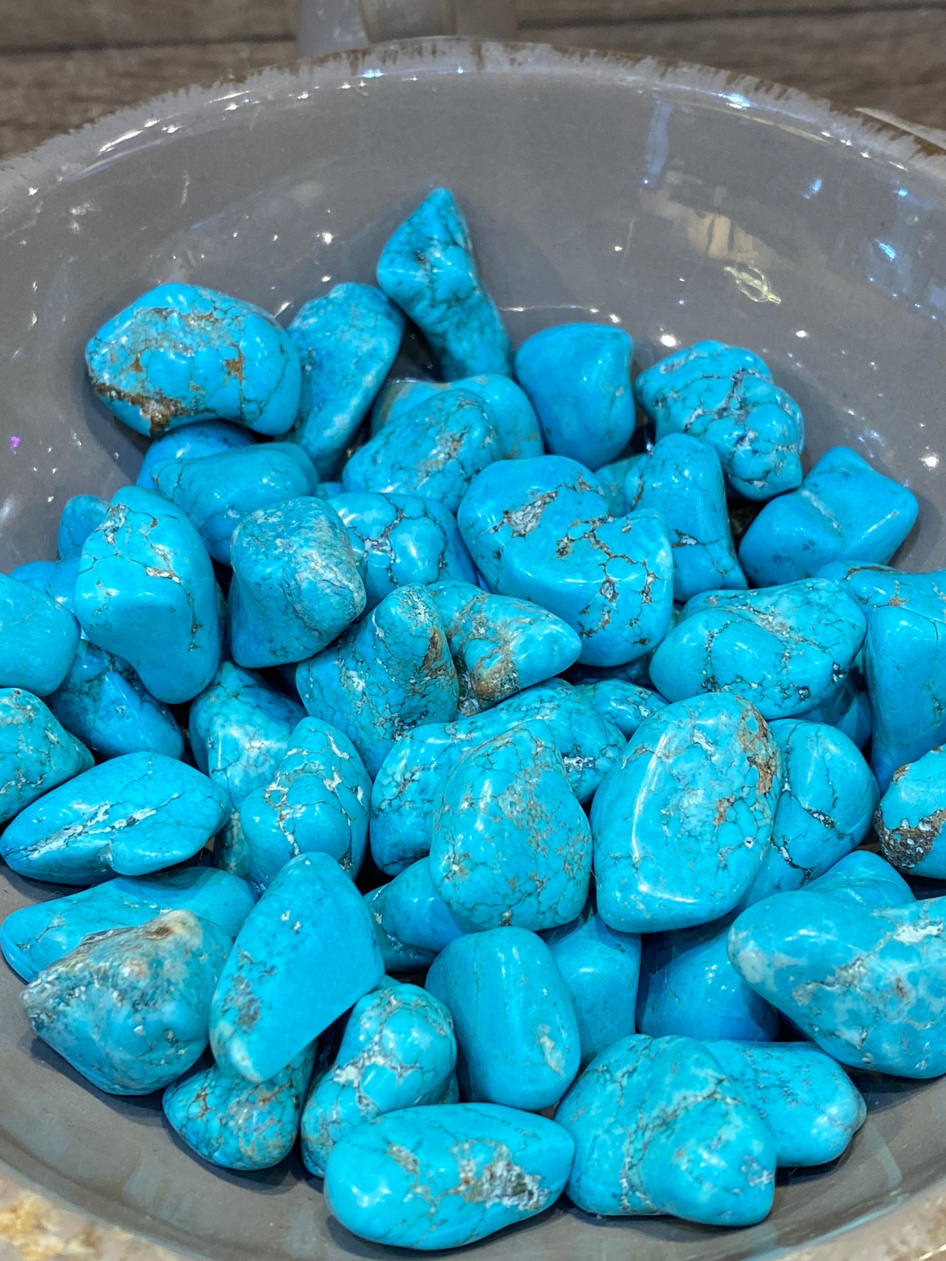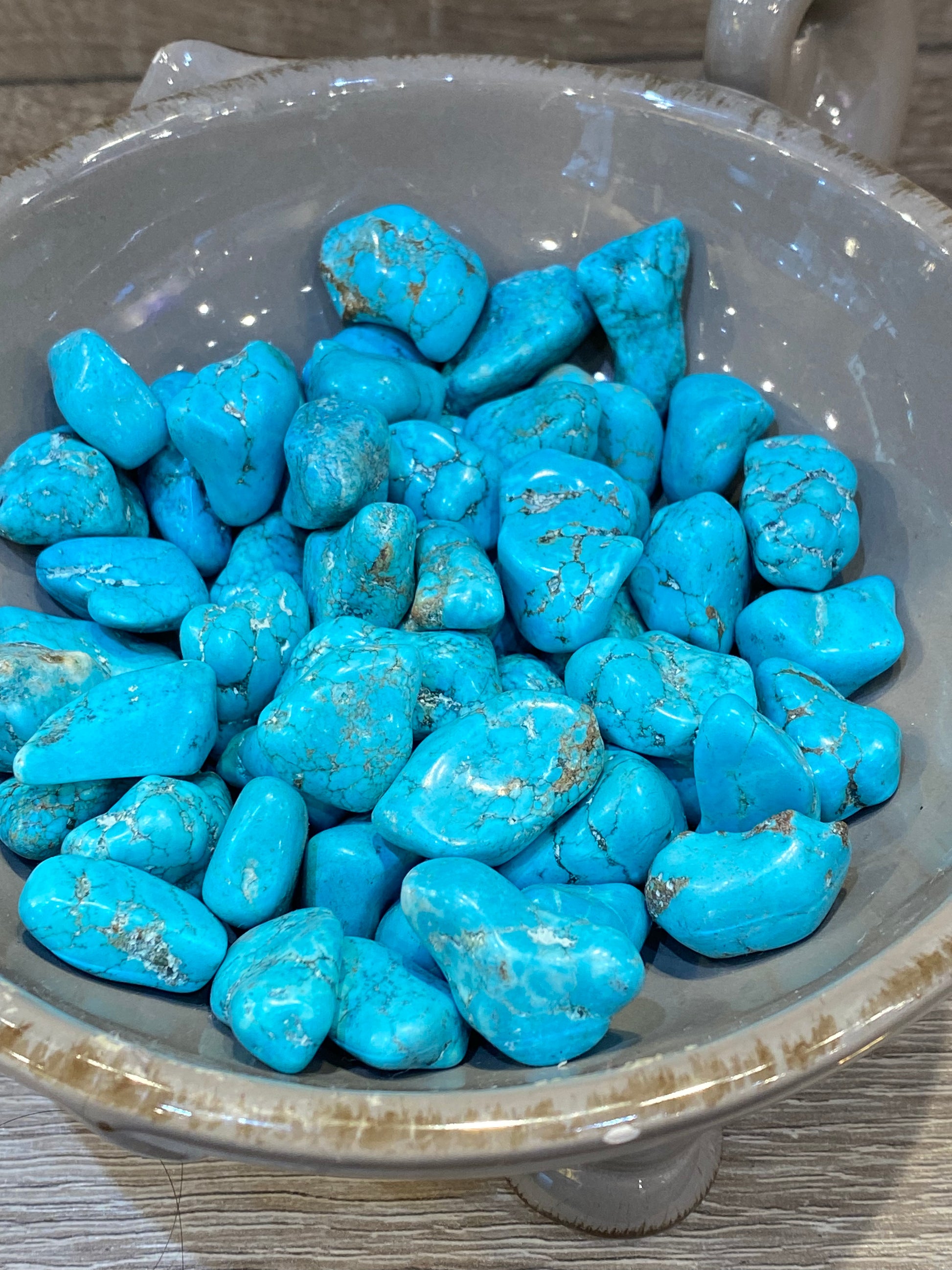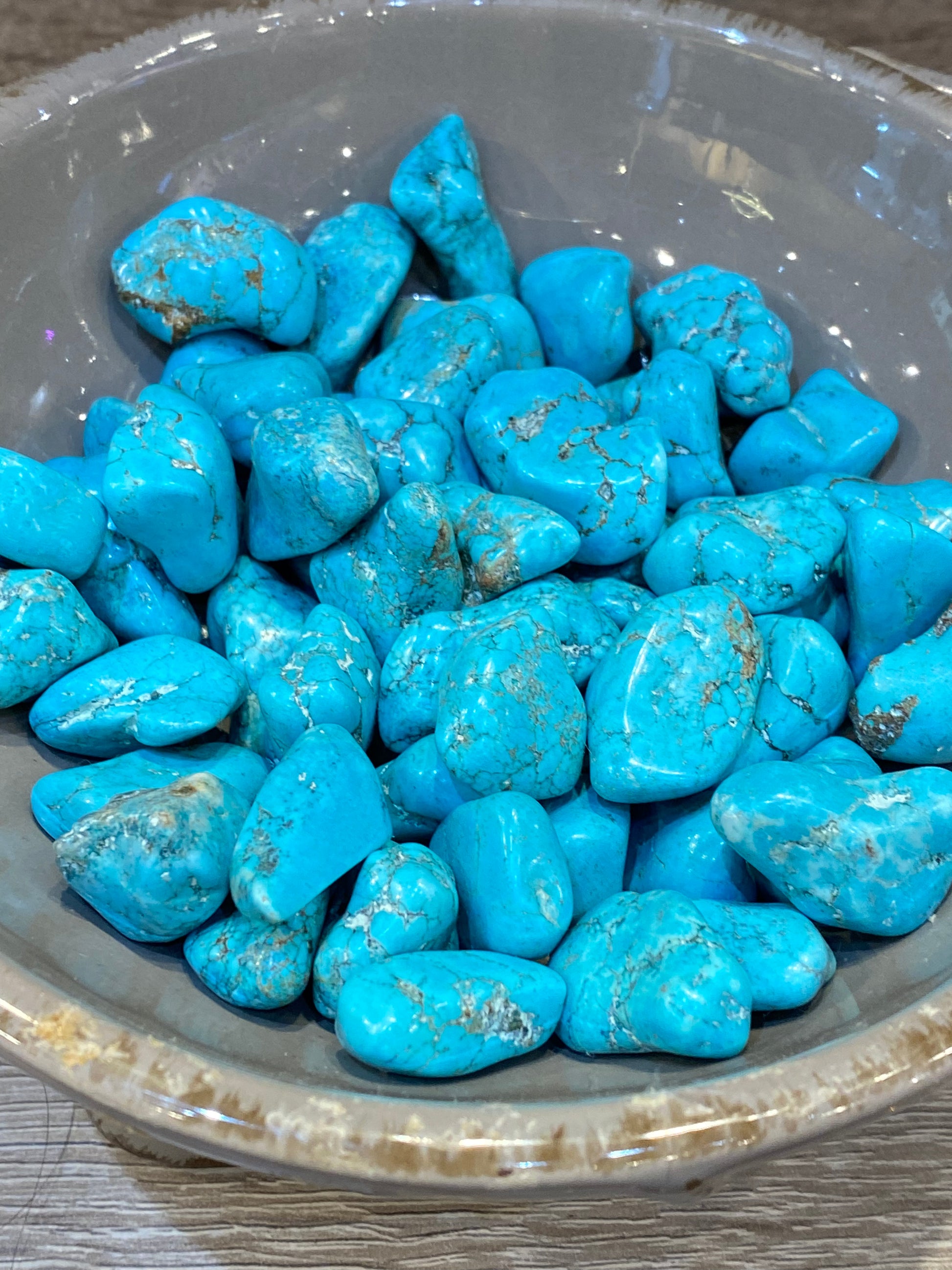 Blue or Turquoise Howlite is a great stone to reduce anxiety, tensions, stress, and anger, it is gentle, soothing, and calms the energy around you. Blue is associated with the throat chakra and communication. It is also good at encouraging emotional expression and it can help in the elimination of pain, and de-fuse stress and anger. I think of Howlite as being like your most simple, warm friend, it’s uncomplicated soothing energy makes you feel calm and hugged.