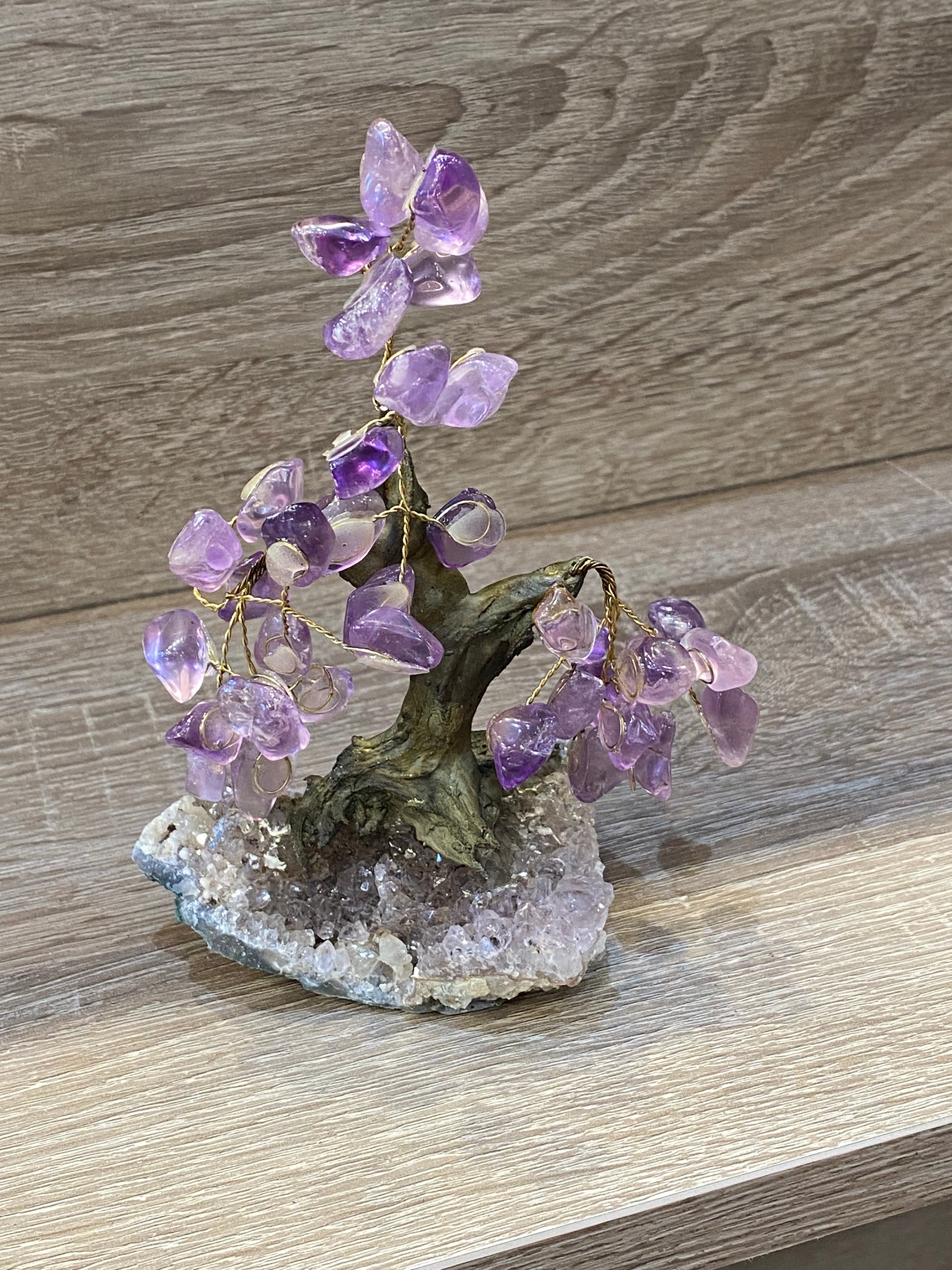 Gemstone Amethyst Bonsai Tree on Amethyst Cluster