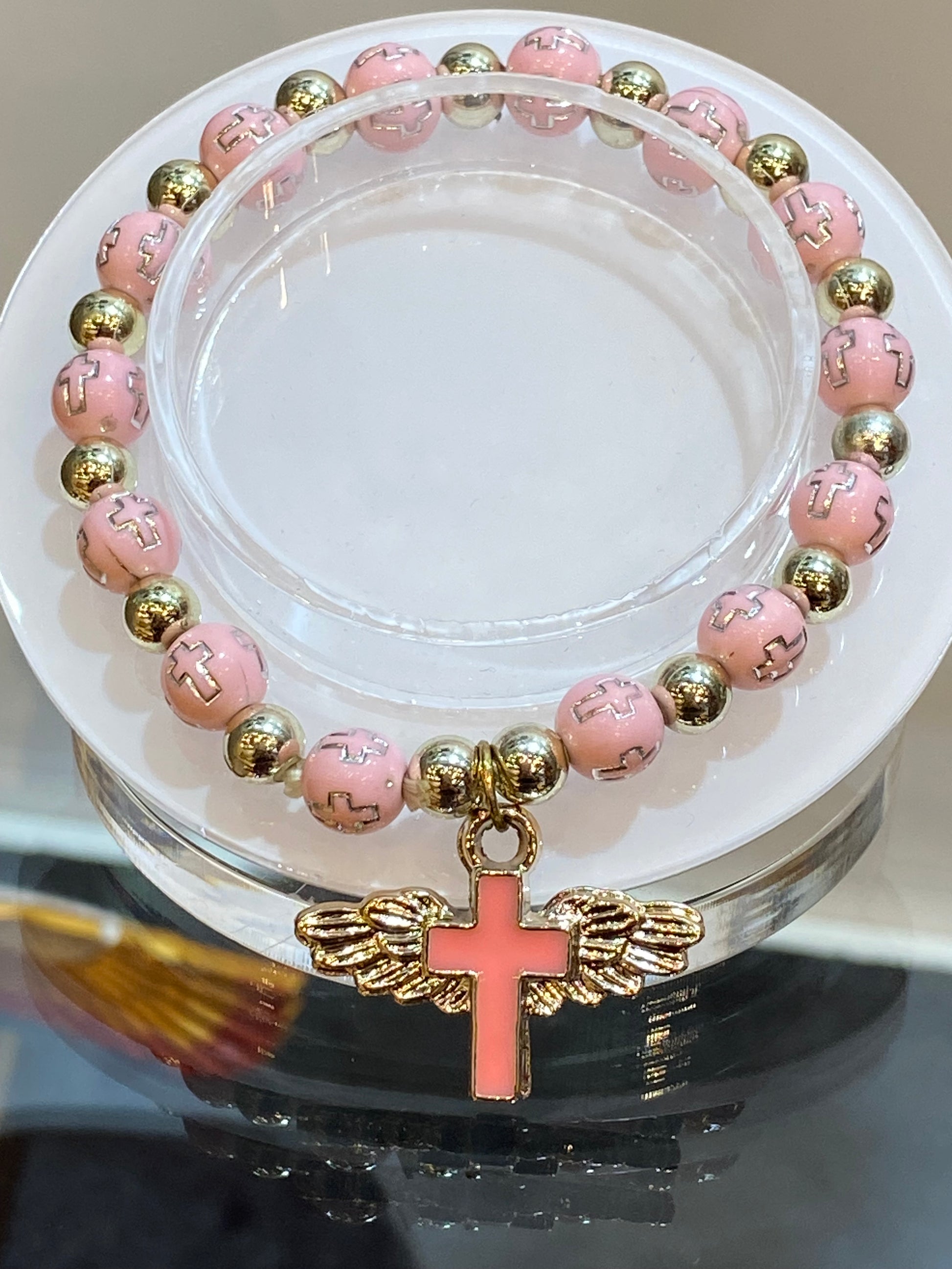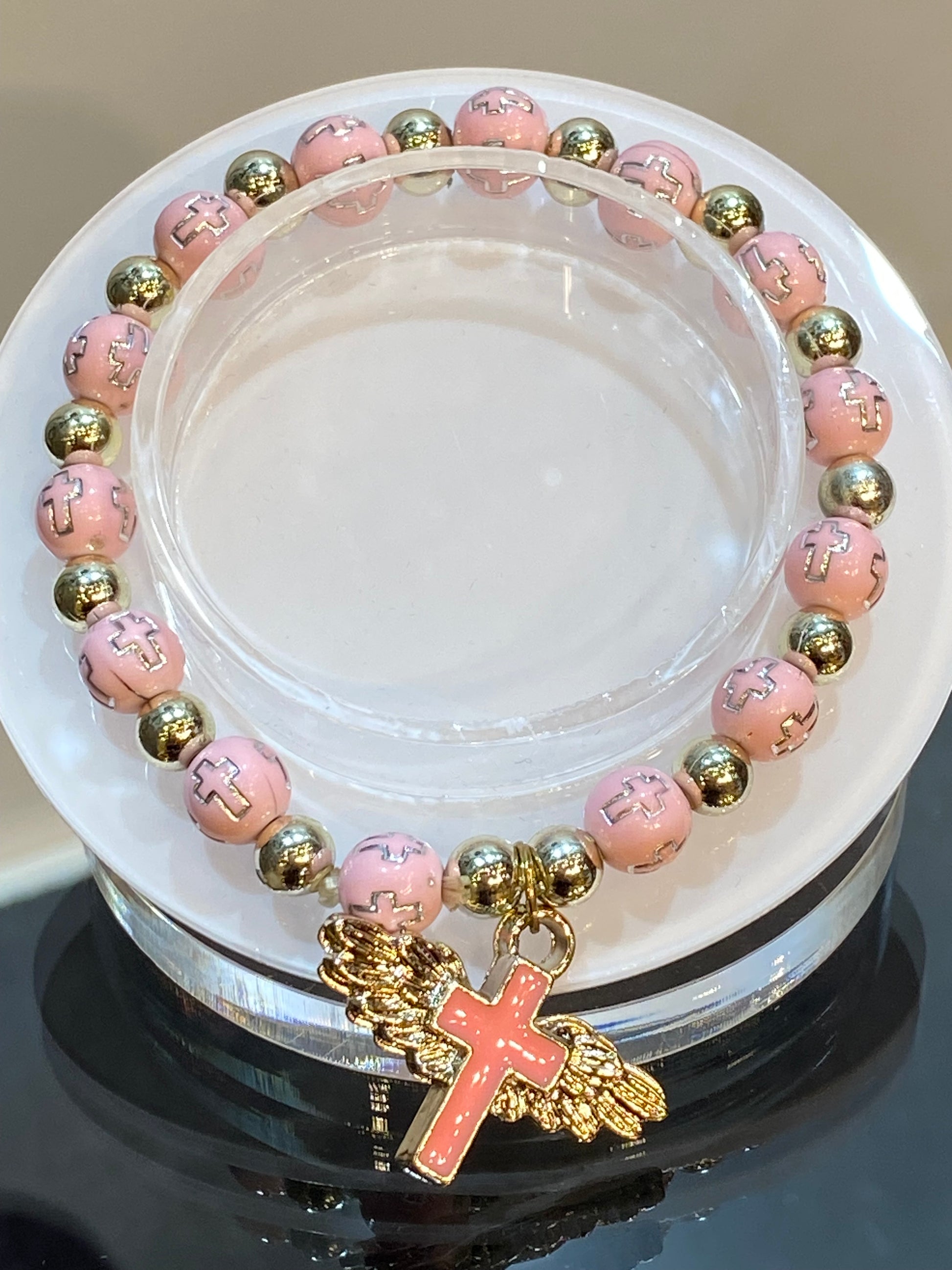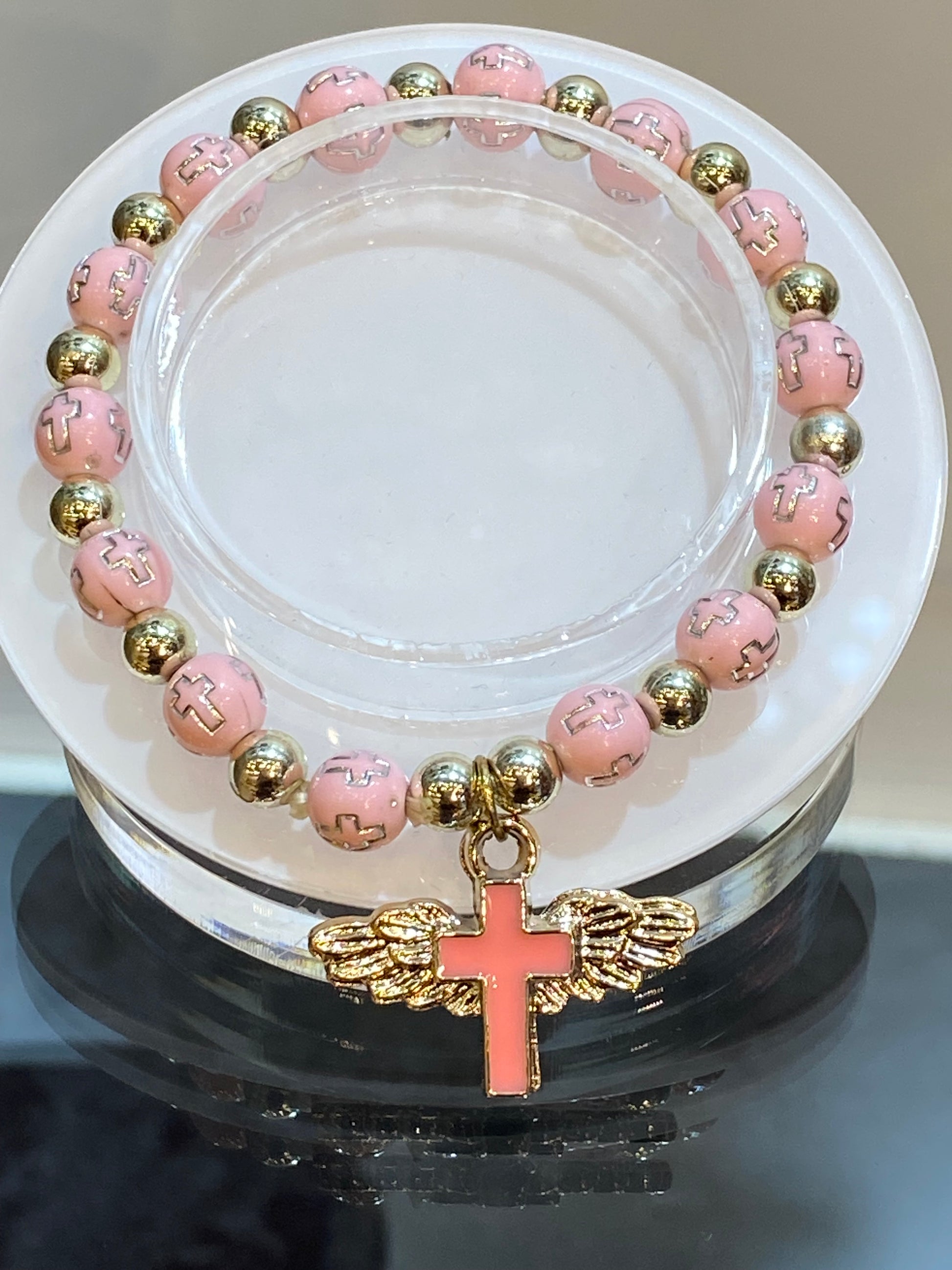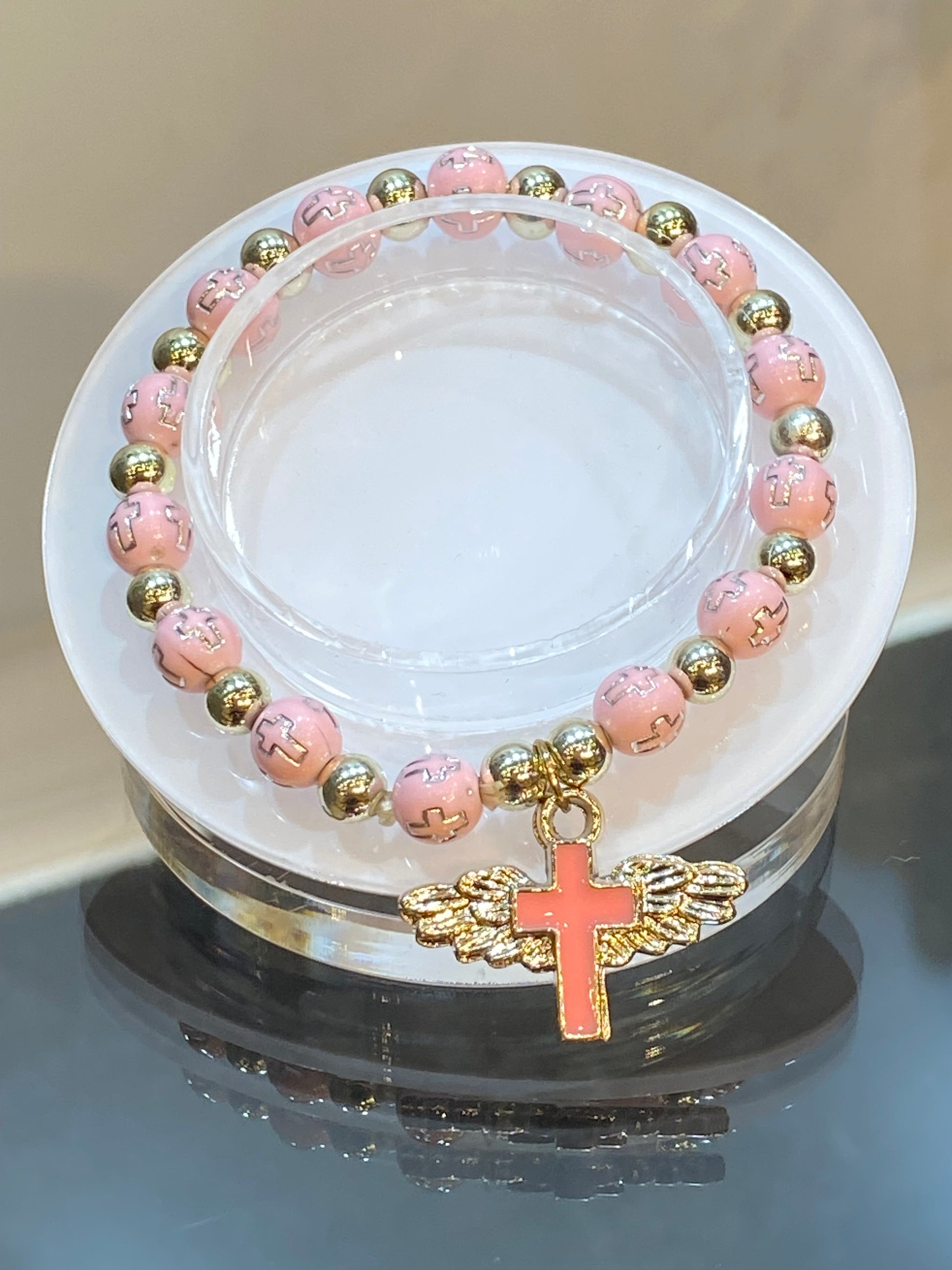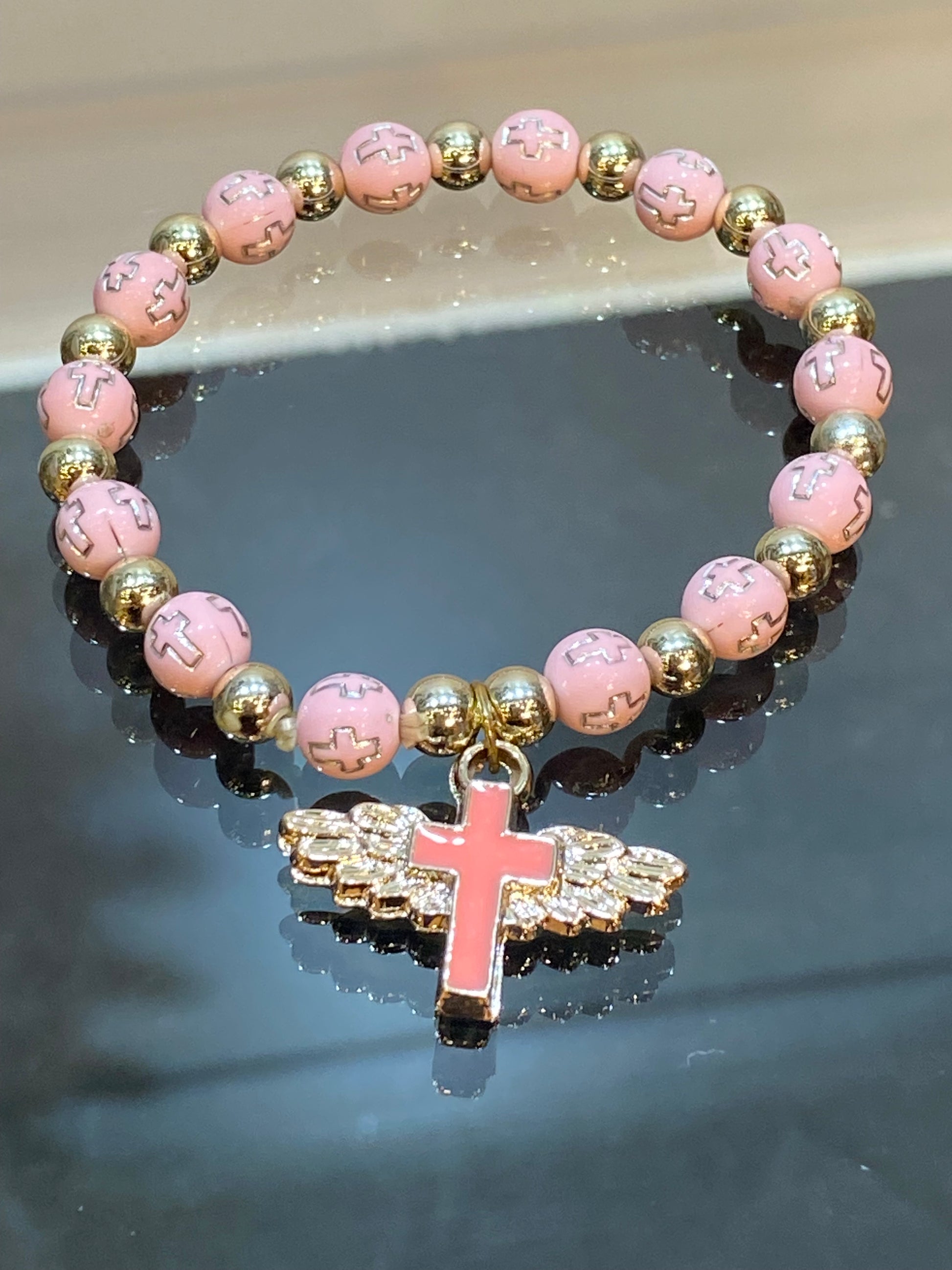 Pink and Silver Engraved Cross Beaded Stretch Bracelet With Hanging Cross Angel Wings Charm