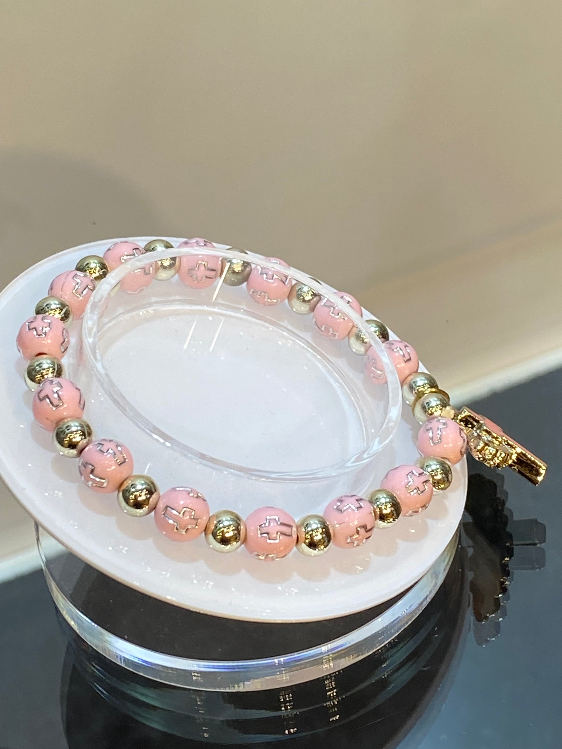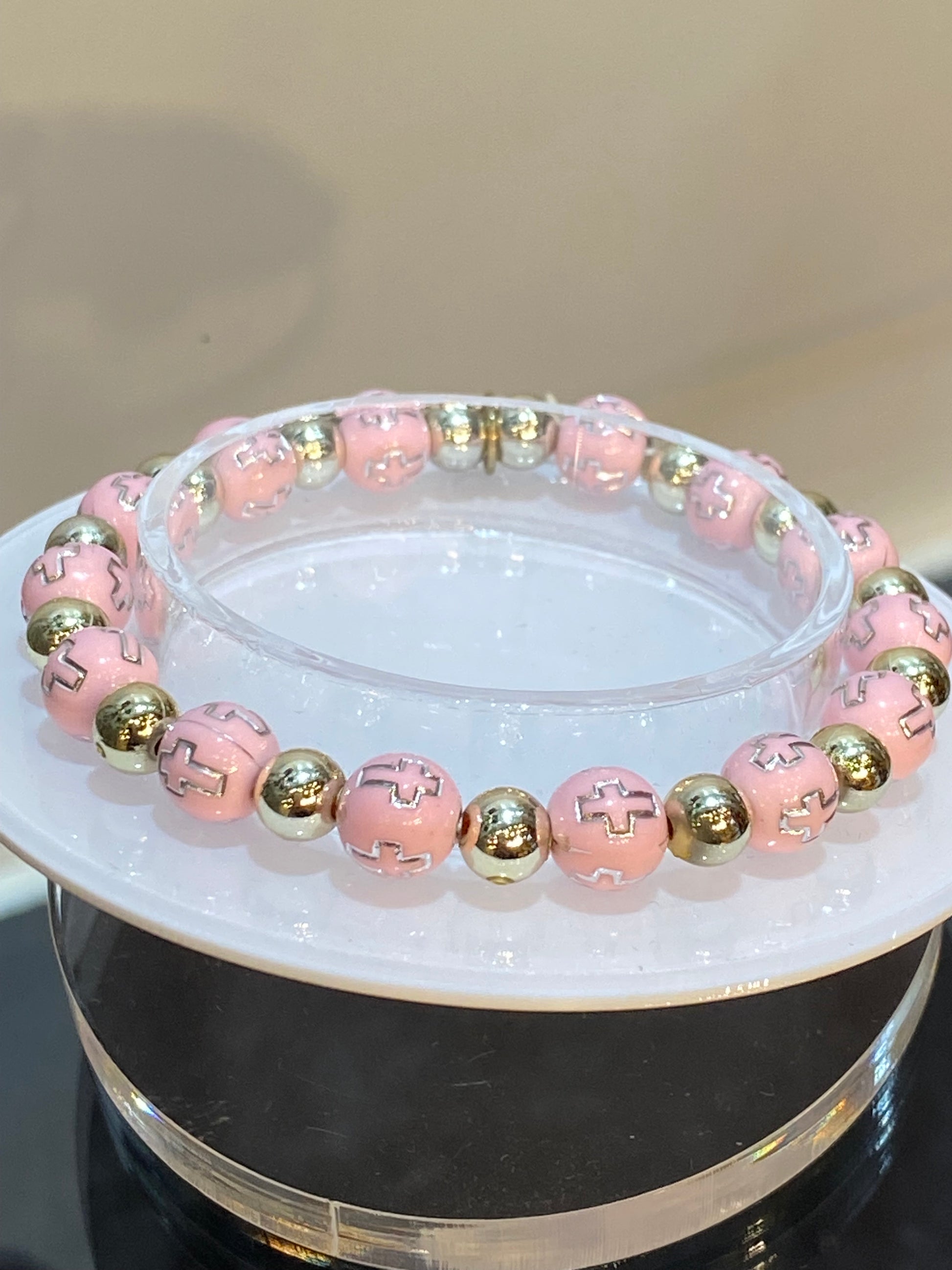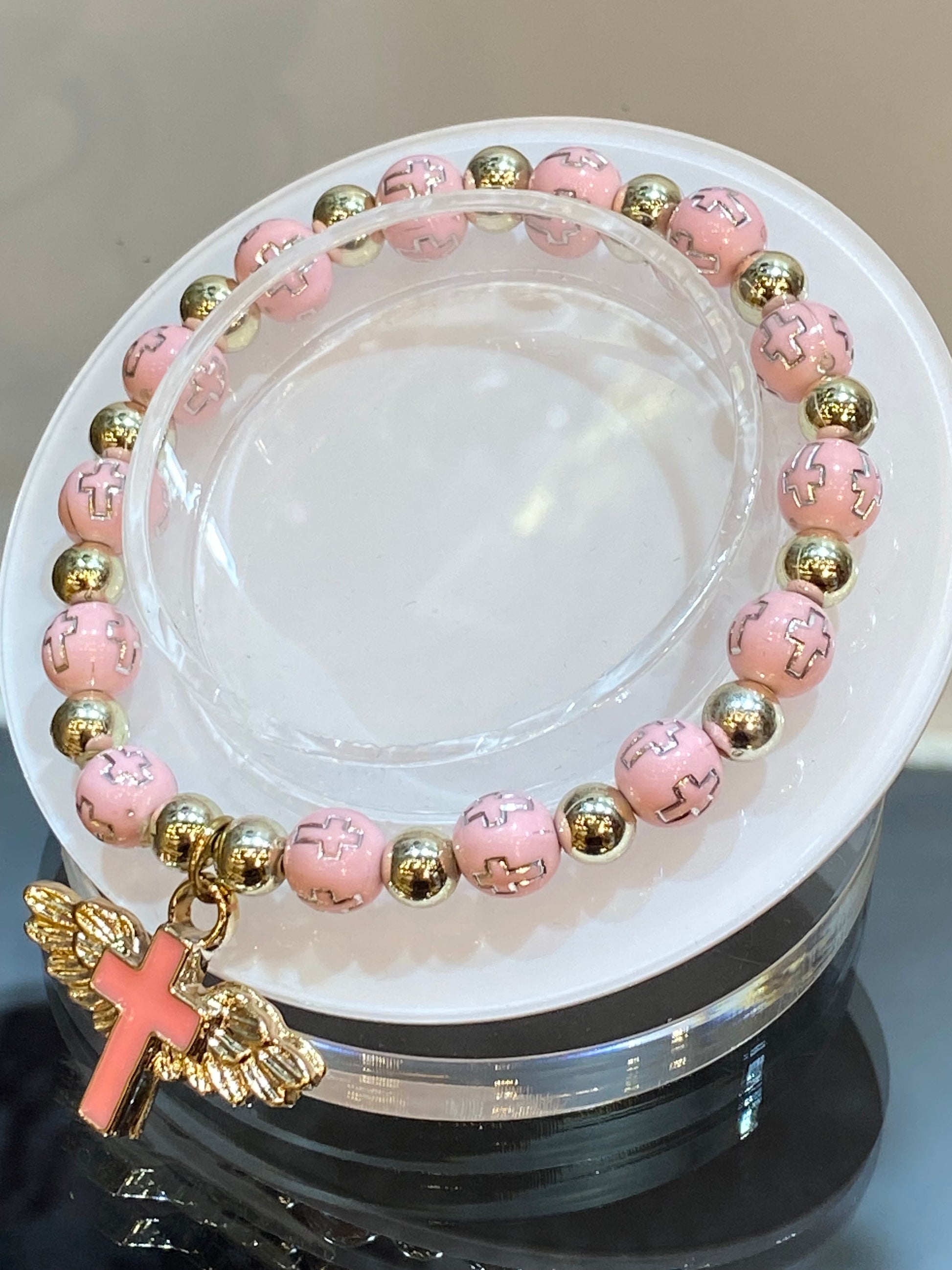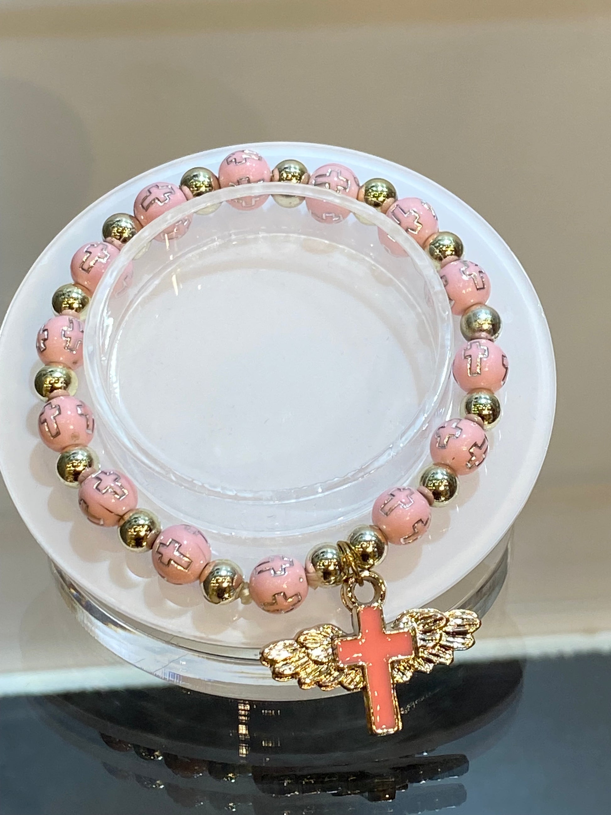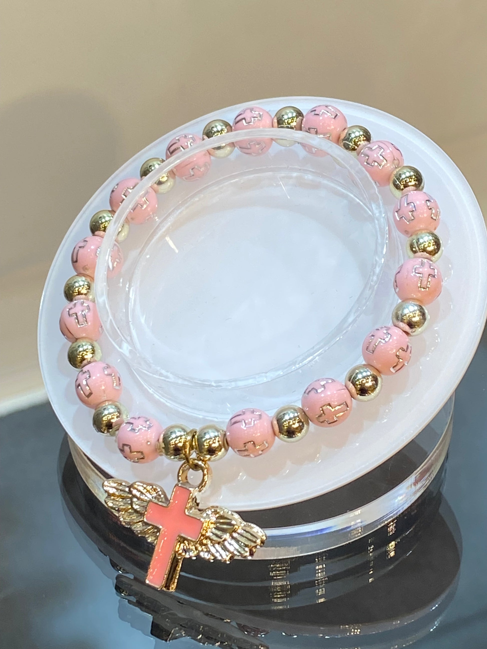 Pink and Silver Engraved Cross Beaded Stretch Bracelet With Hanging Cross Angel Wings Charm