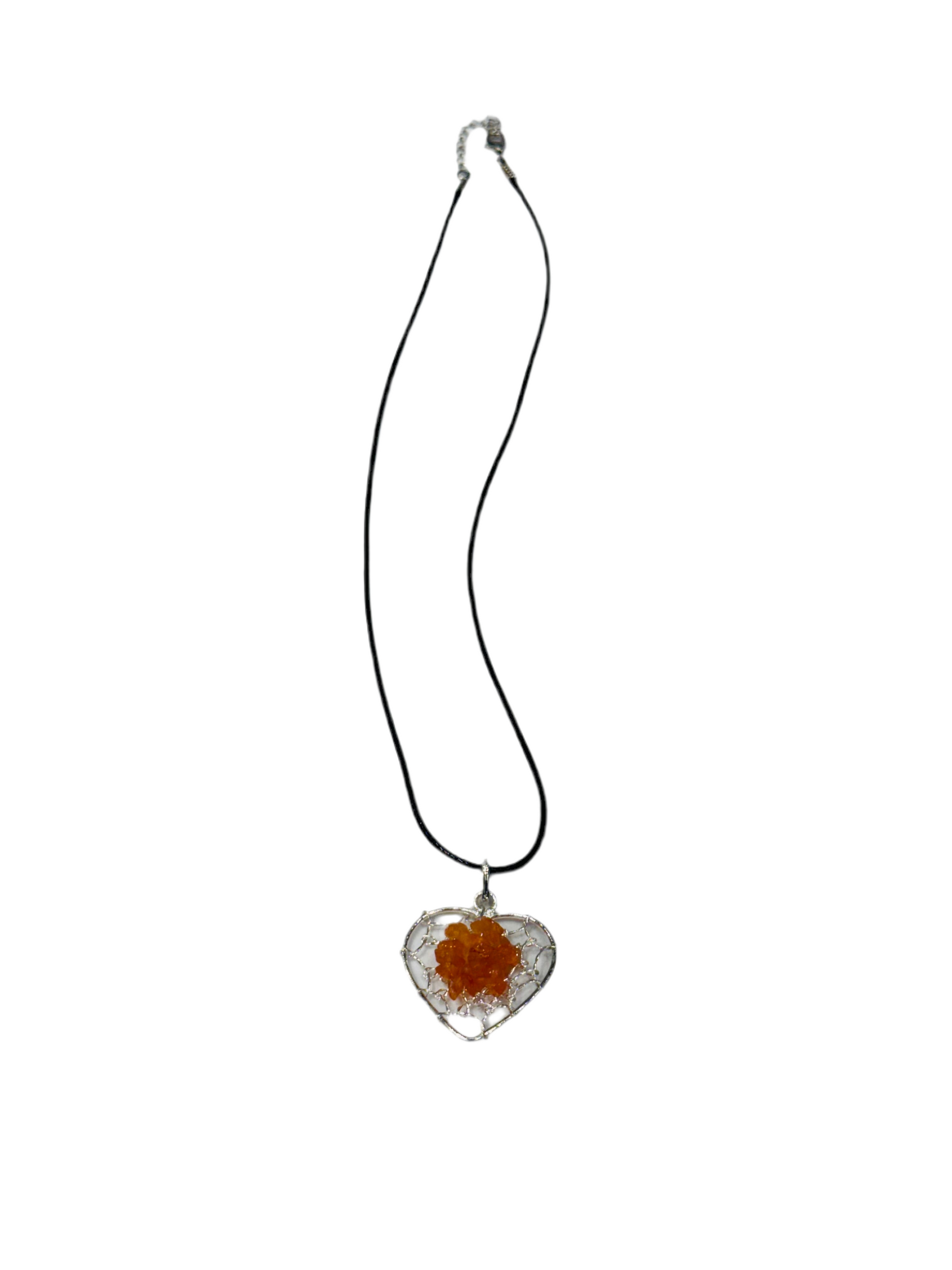 Carnelian Chips Silver Heart Pendant Wire Wrapped with Black Adjustable Cord Necklace