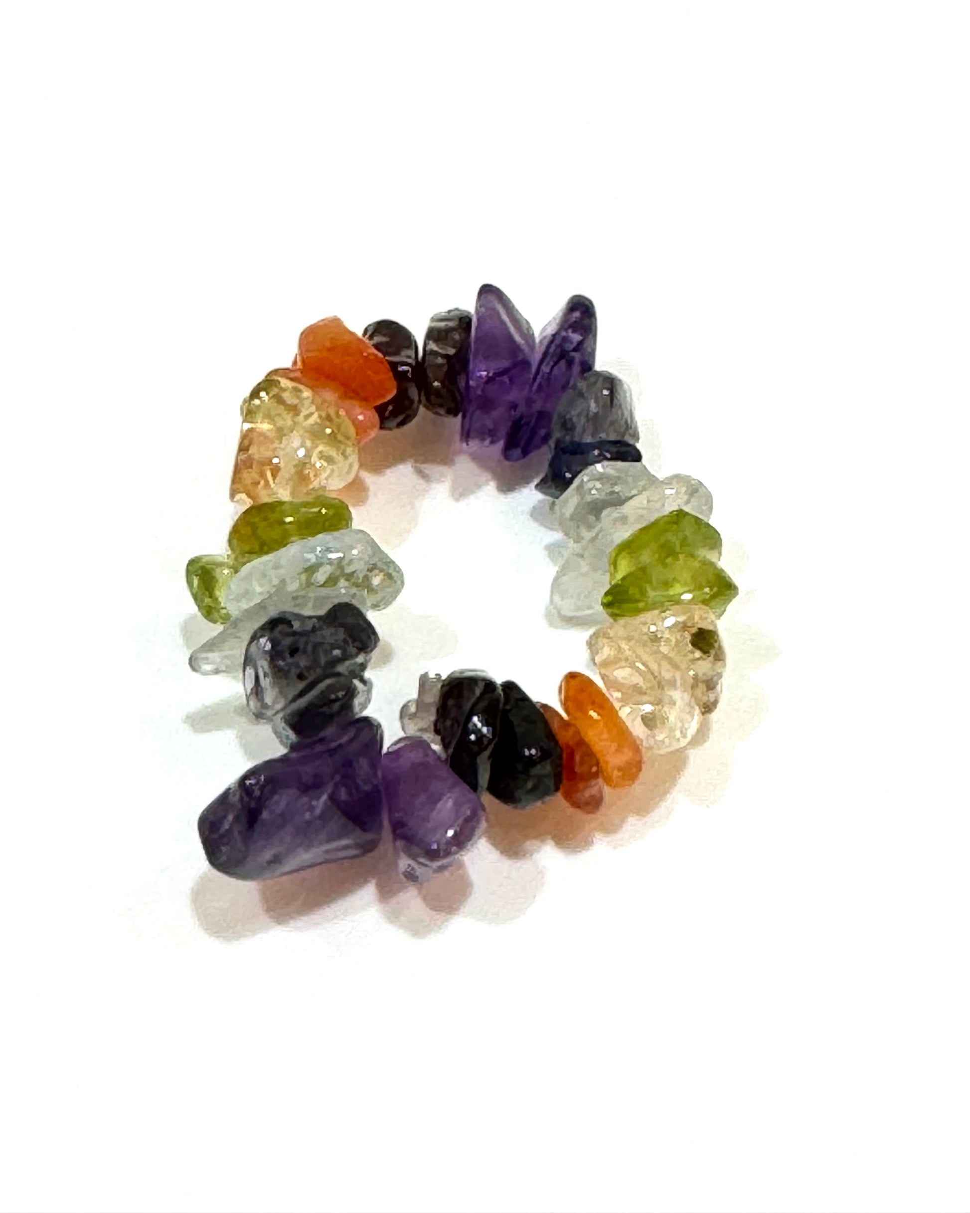 Beautiful gemstone stretch ring. The Seven Chakras are represented in this stretch chip ring and include amethyst, clear quartz, lapis, peridot, citrine, carnelian, and red jasper. Multiple qualities and properties in one bracelet!