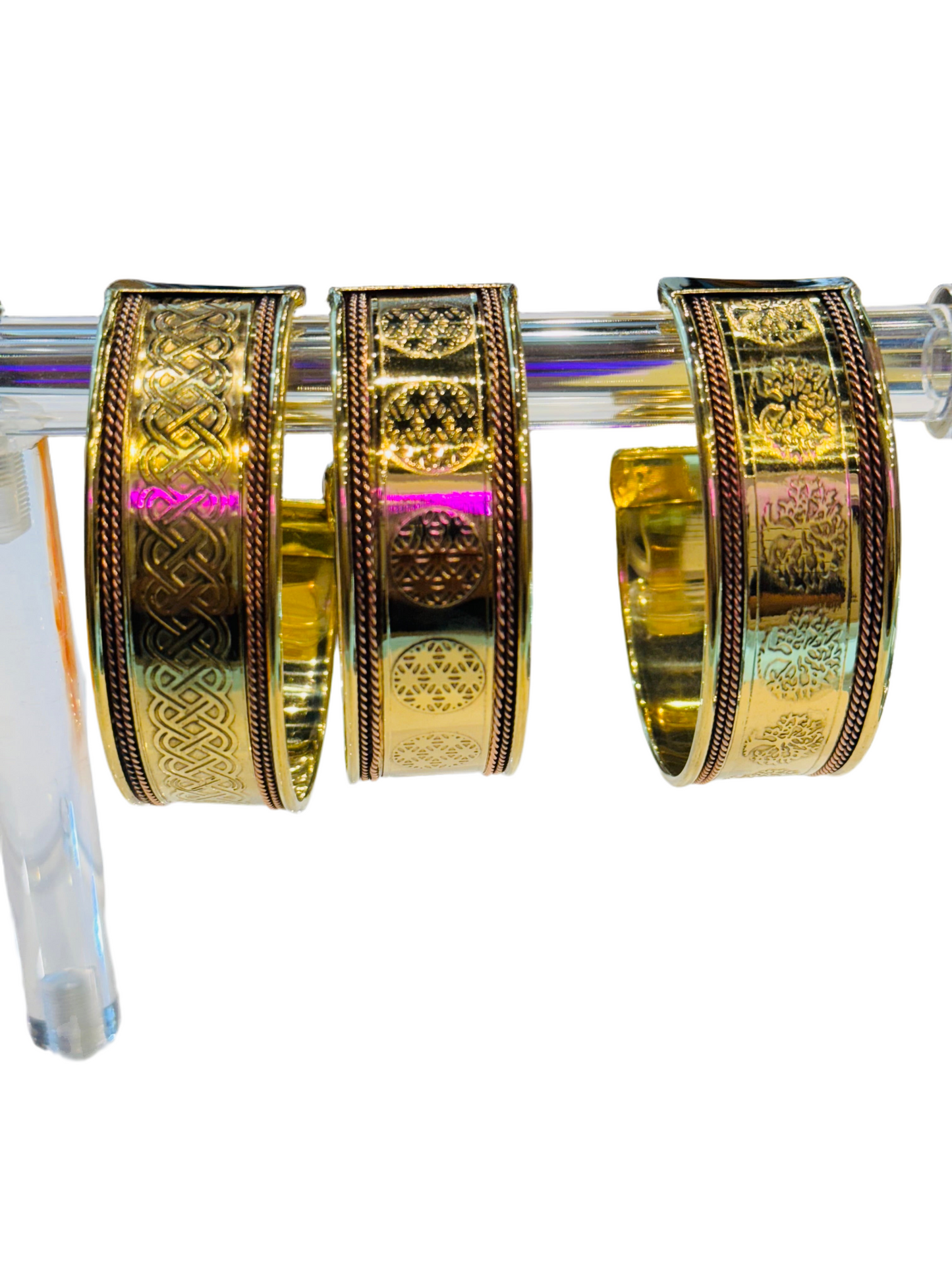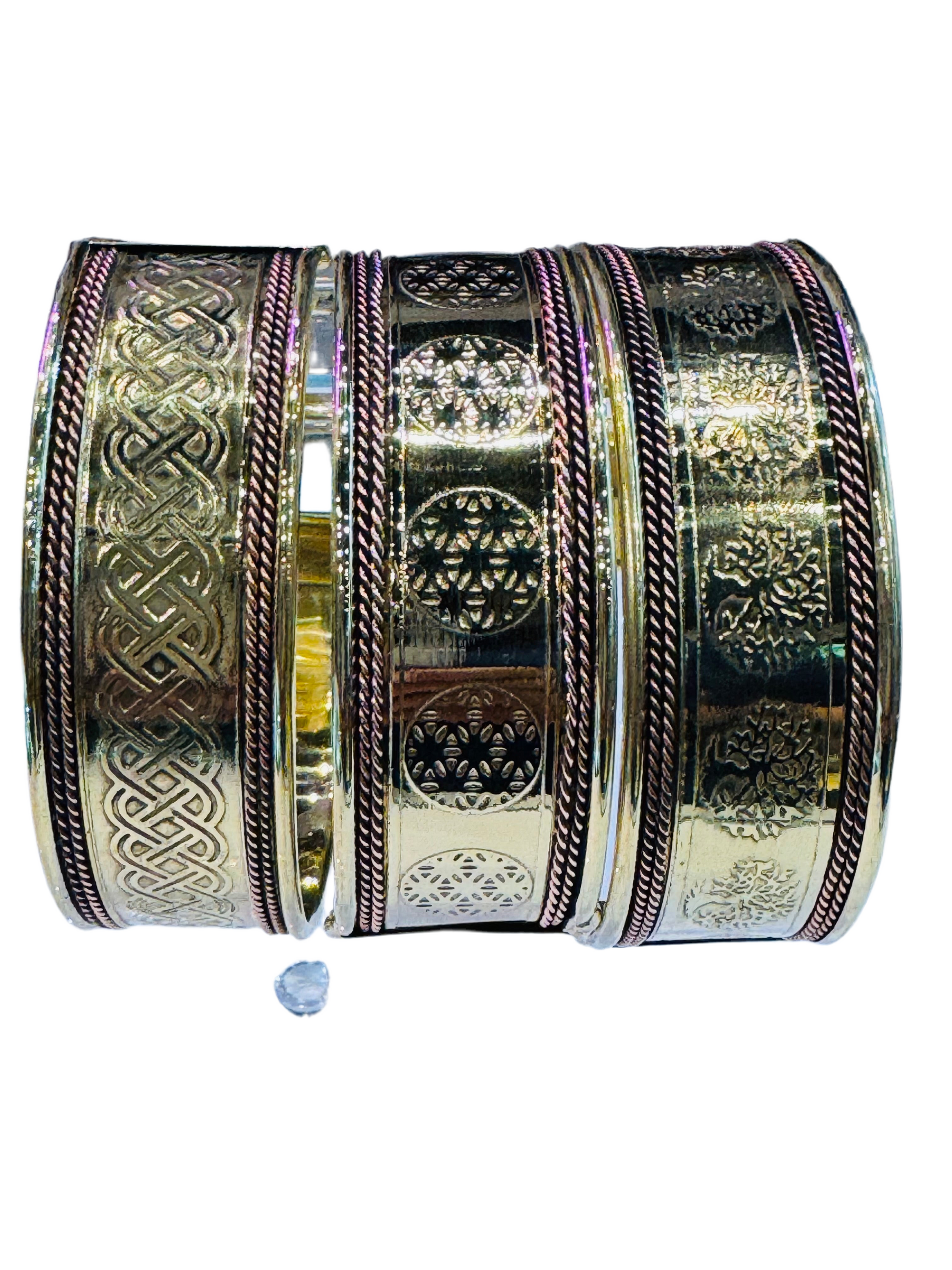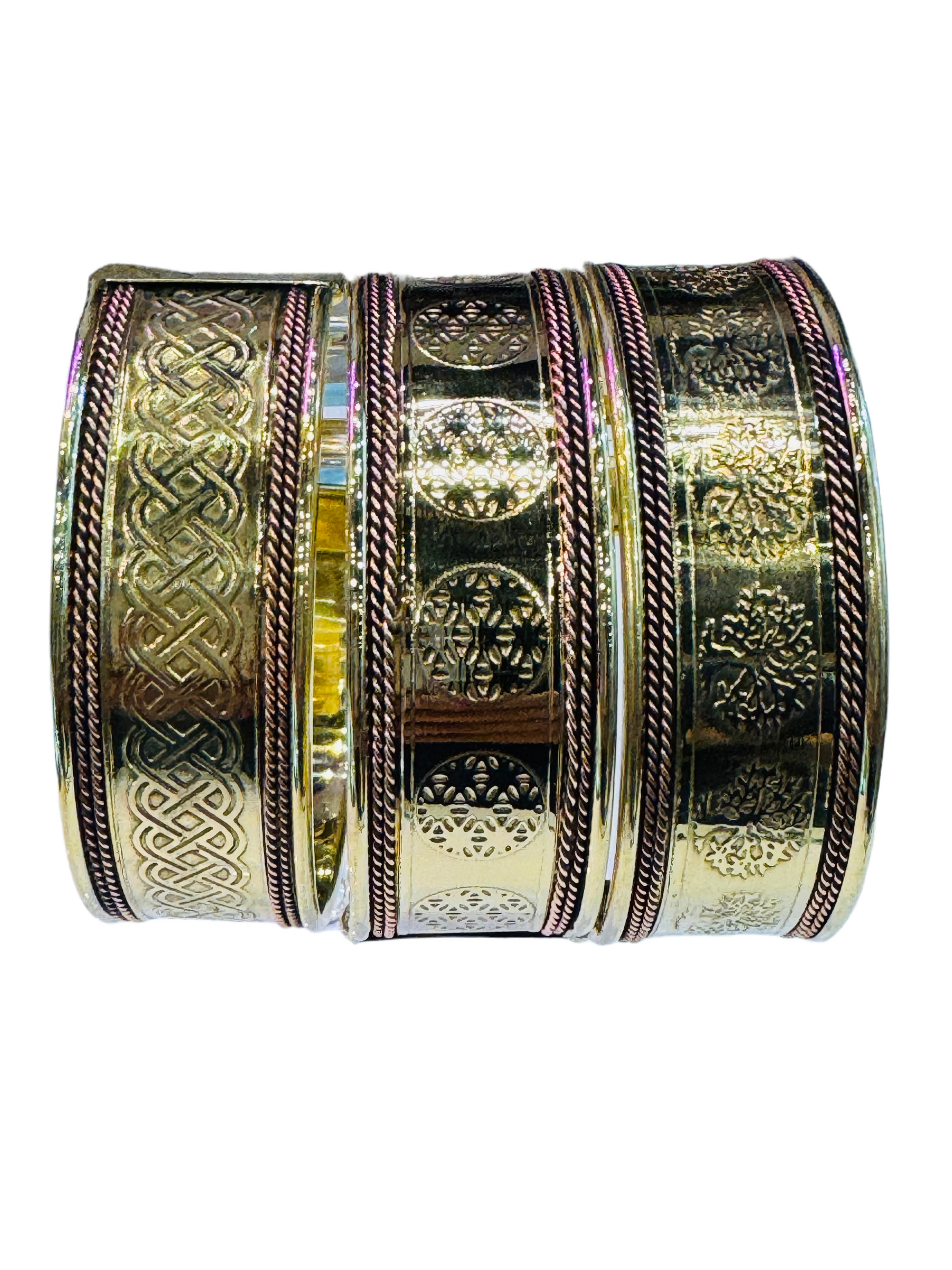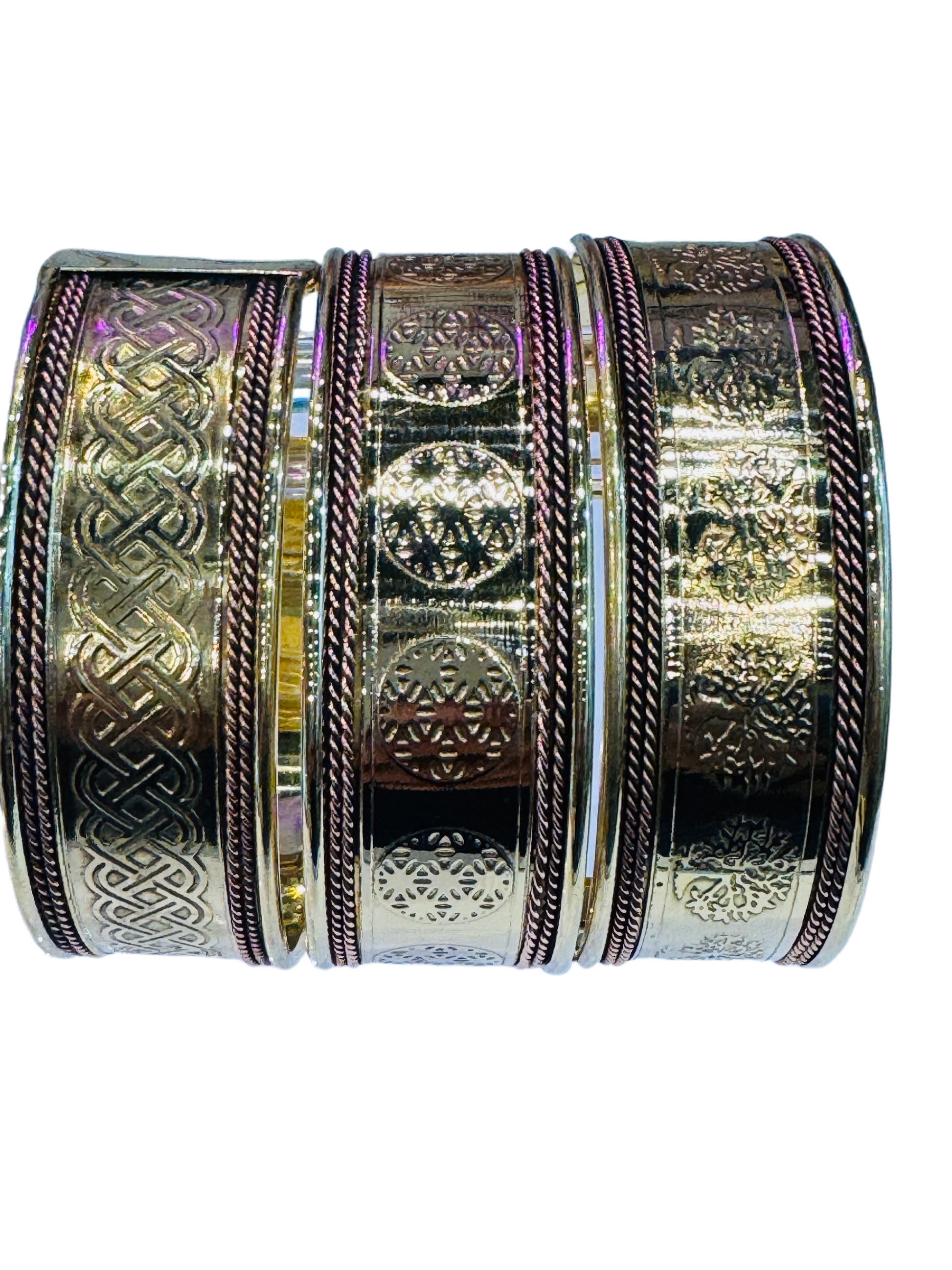 Set of 3 Celtic sign bracelet cuffs copper & brass combination.