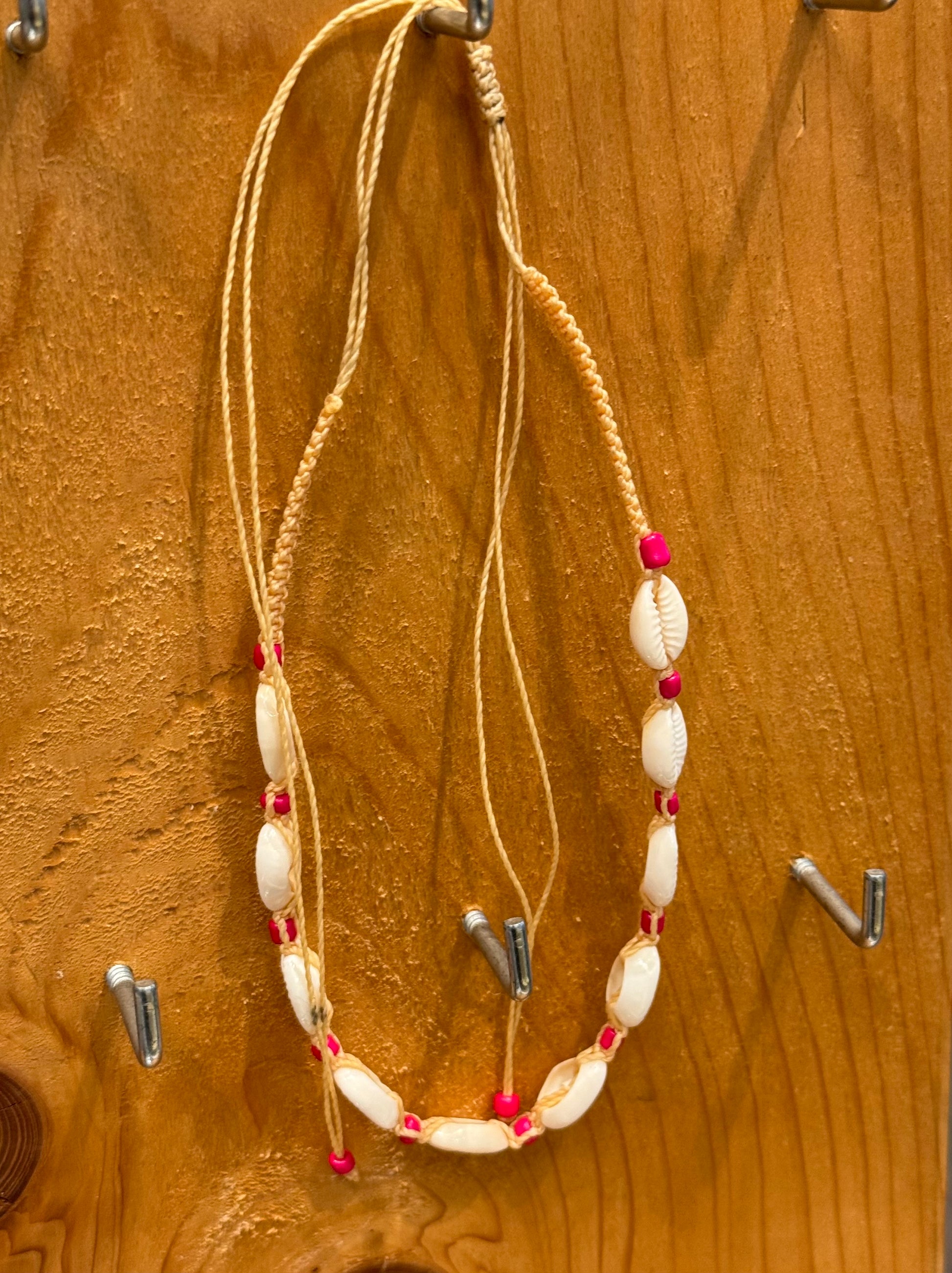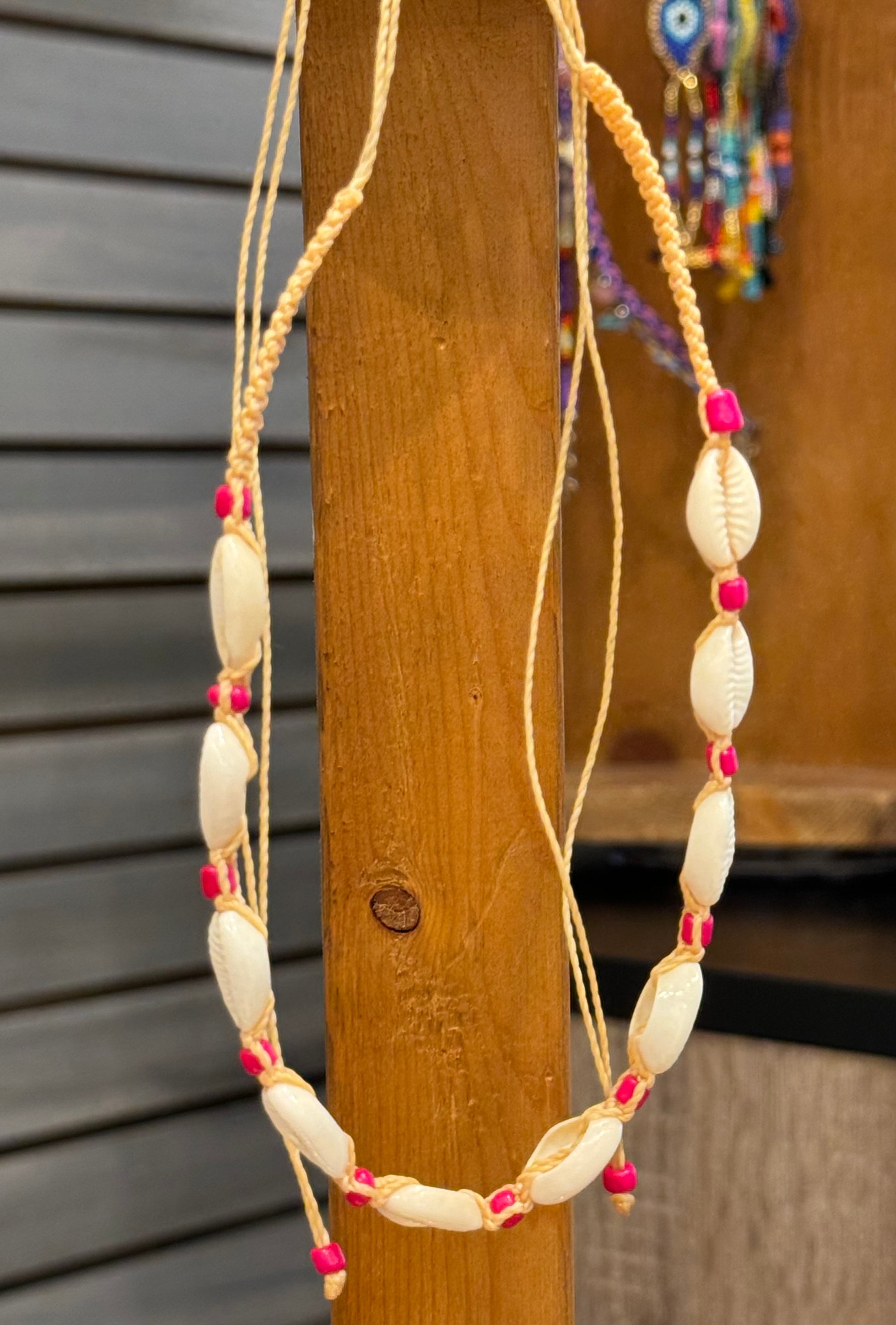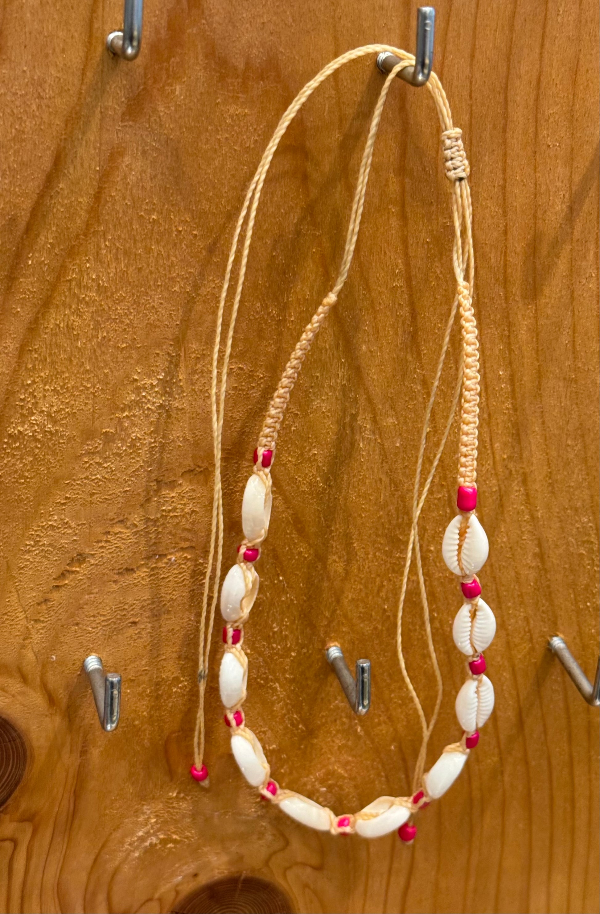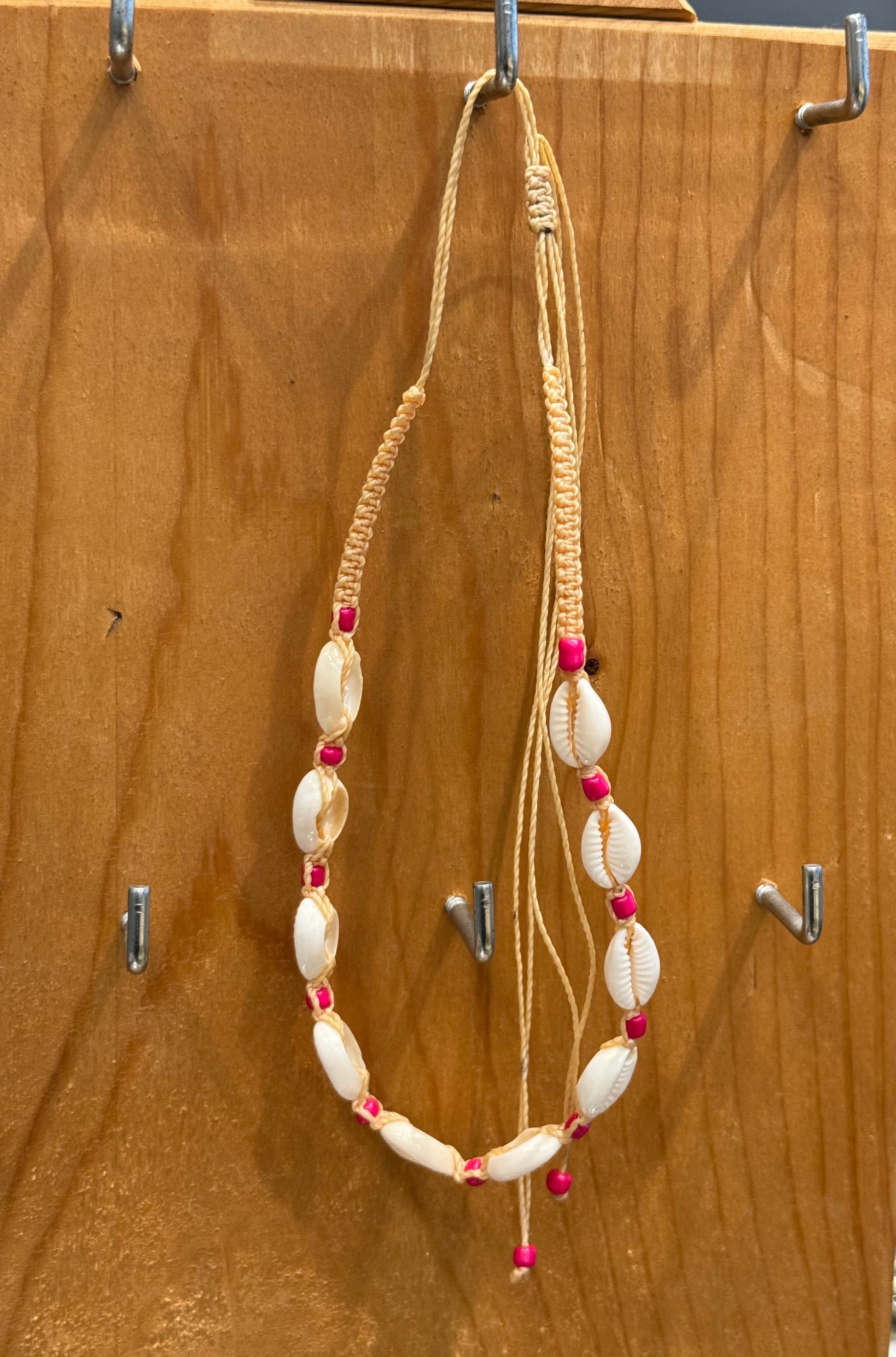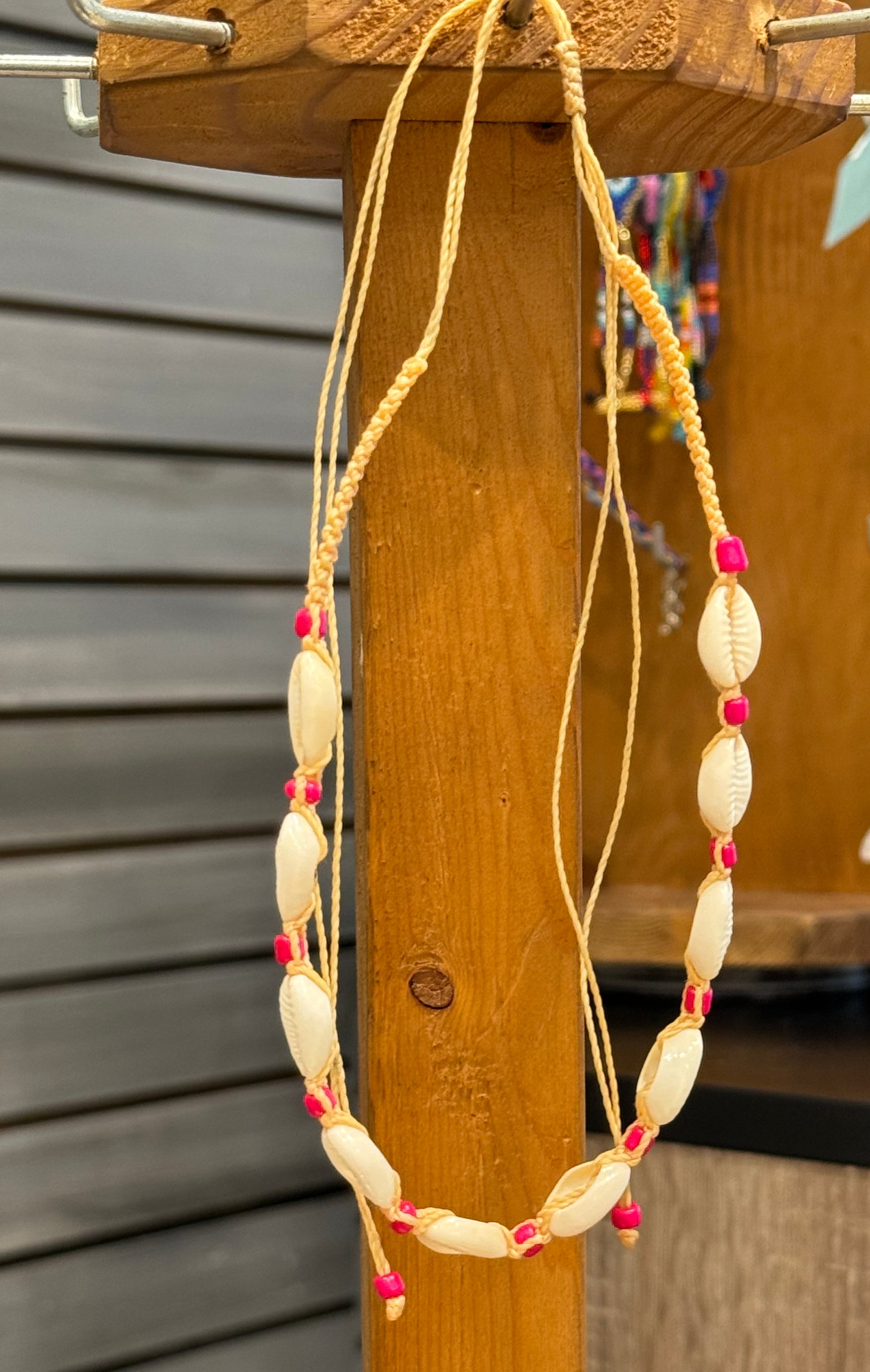 Woven macrame pull tie choker necklace with natural seashells. One size fits all with adjustable pull tie strings. Necklace is lightweight providing a comfortable daily fit.