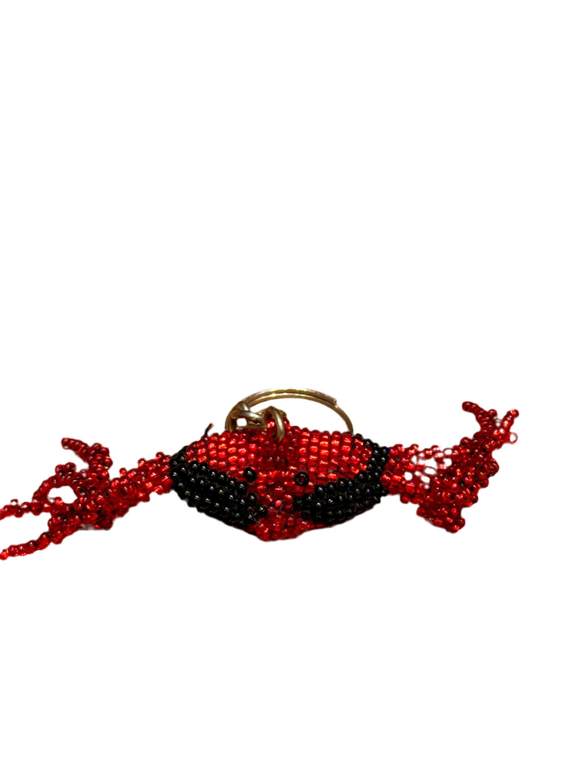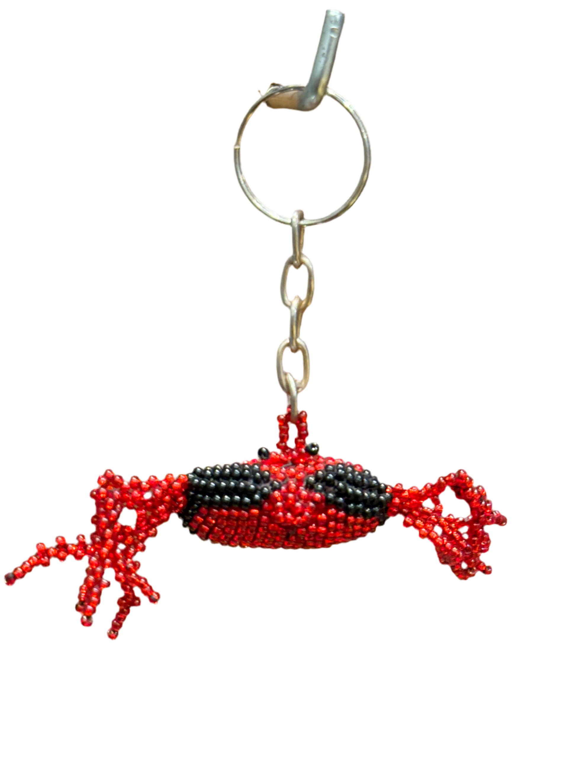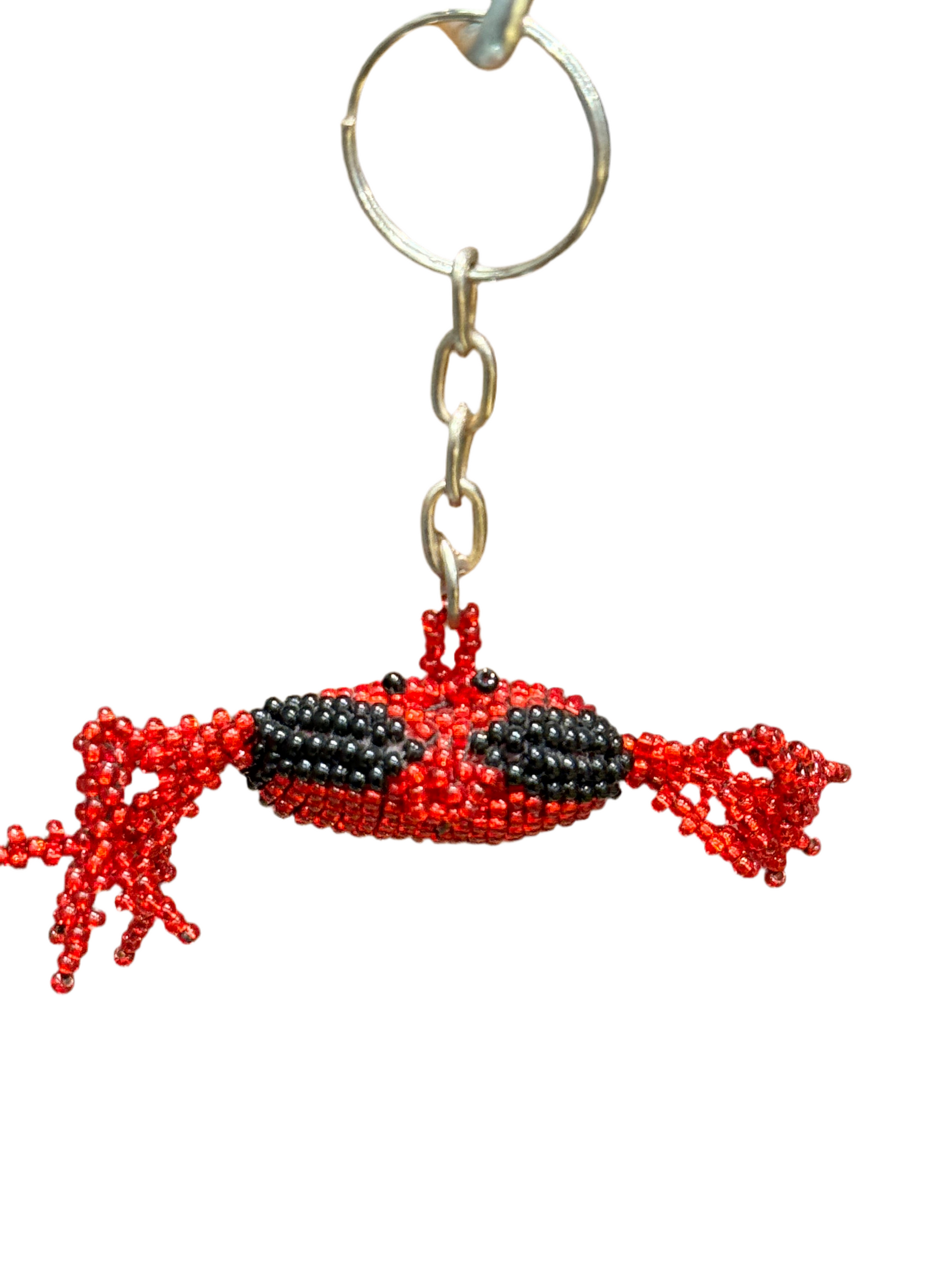 Handcrafted seed bead keychain of a red crab sea animal figurine on silver metal key ring. Link keychain to your keys, wallet, backpack, or purse!