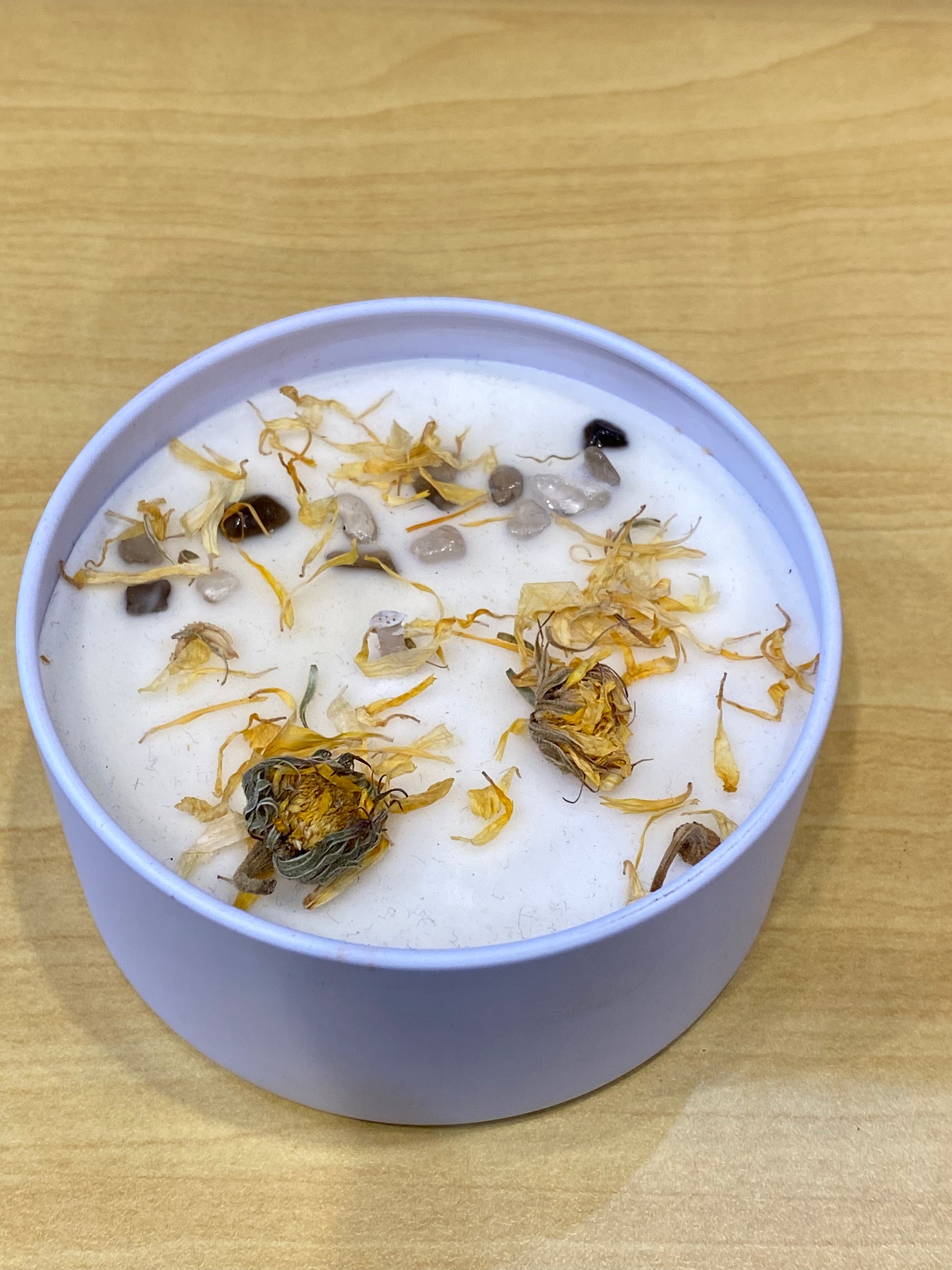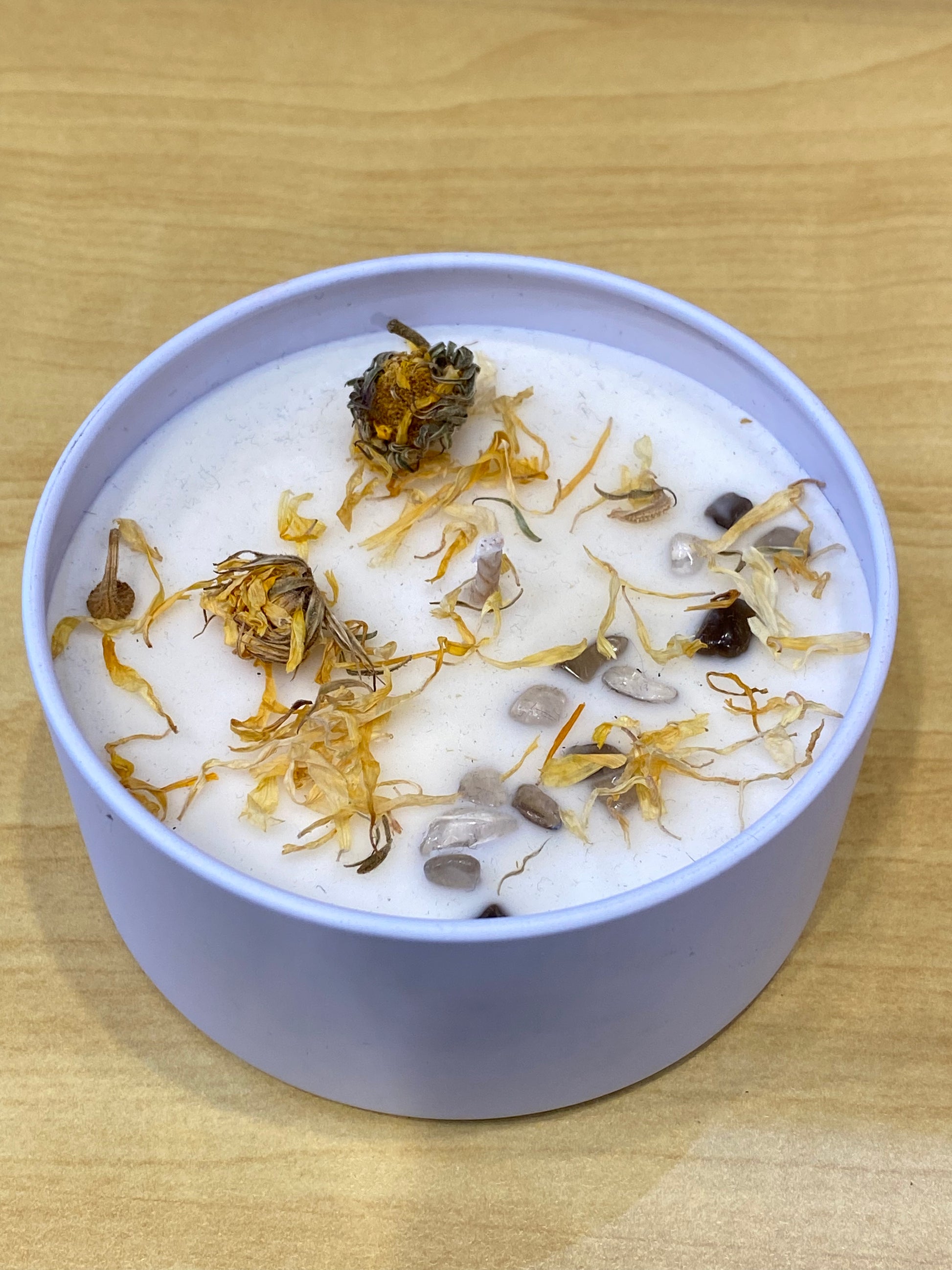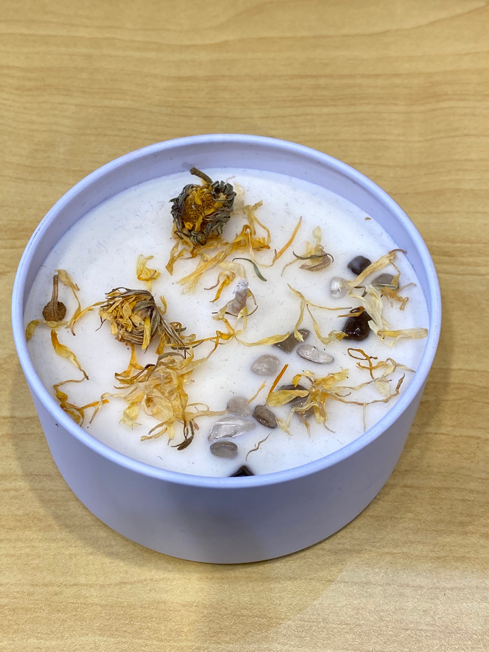 Elemental Earth Oakmoss, Lemongrass, Calendula Flowers and Juniper Soy Wax Candle. Charged with Smoky Quartz Crystal