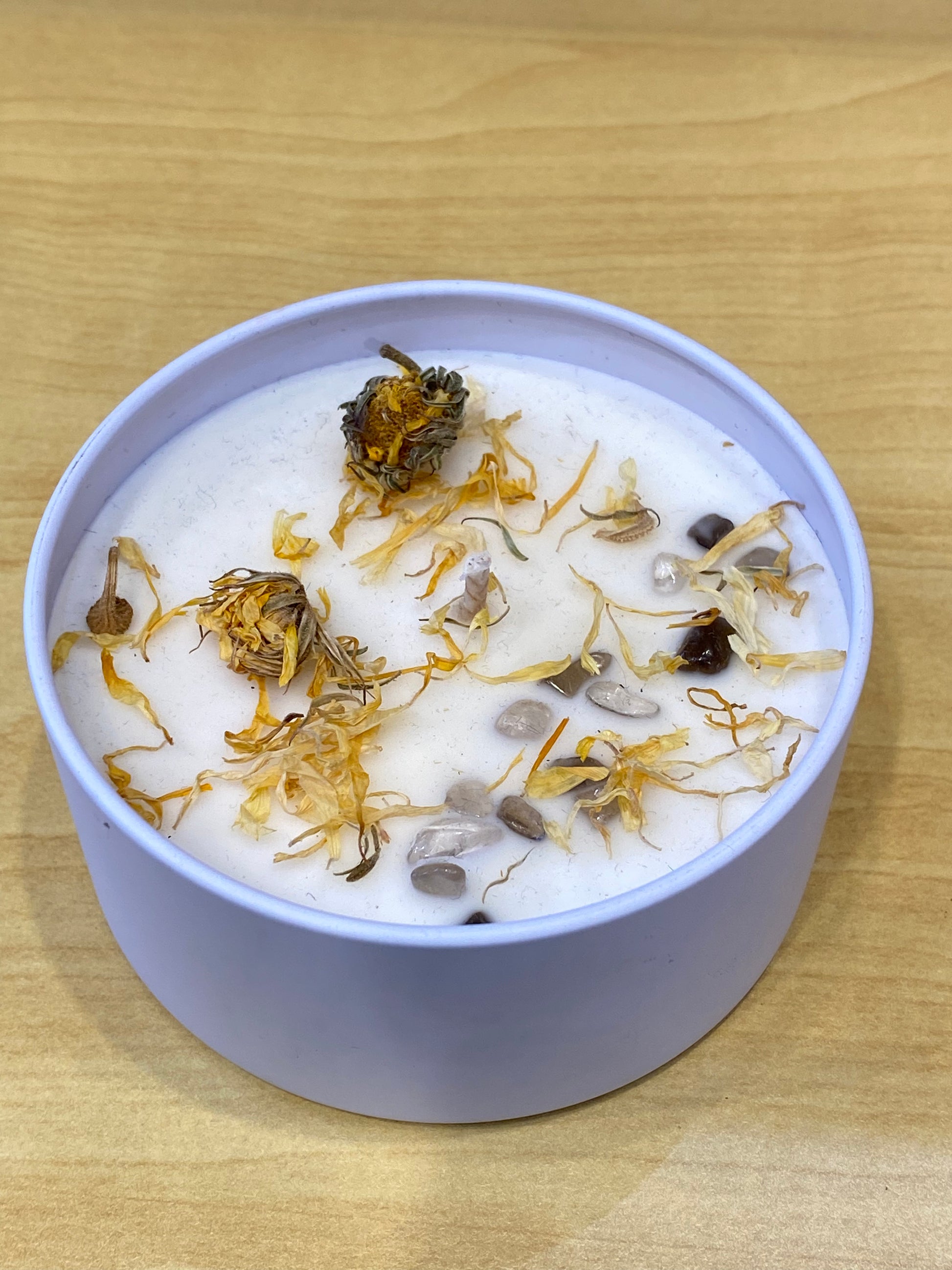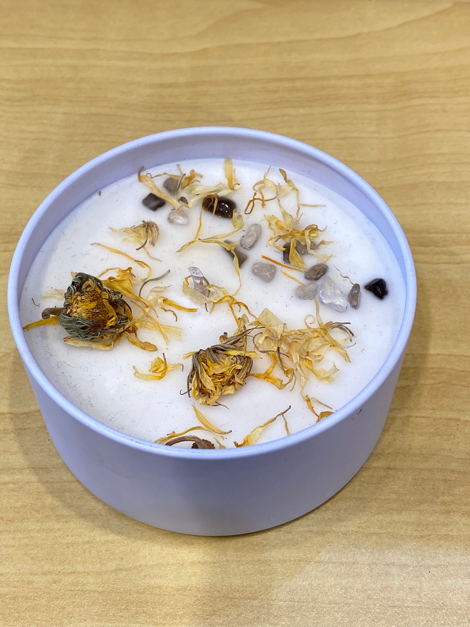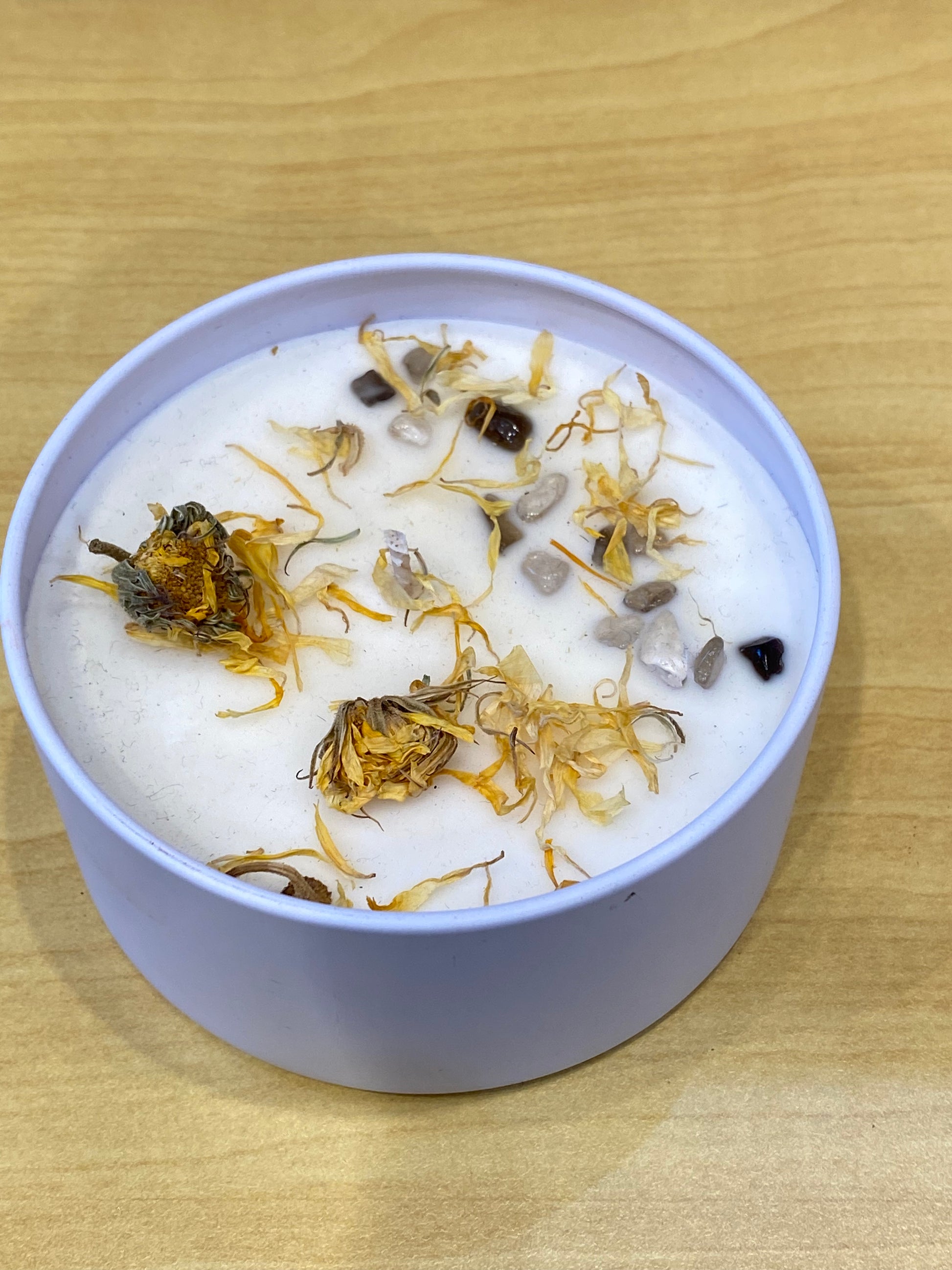 Elemental Earth Oakmoss, Lemongrass, Calendula Flowers and Juniper Soy Wax Candle. Charged with Smoky Quartz Crystal