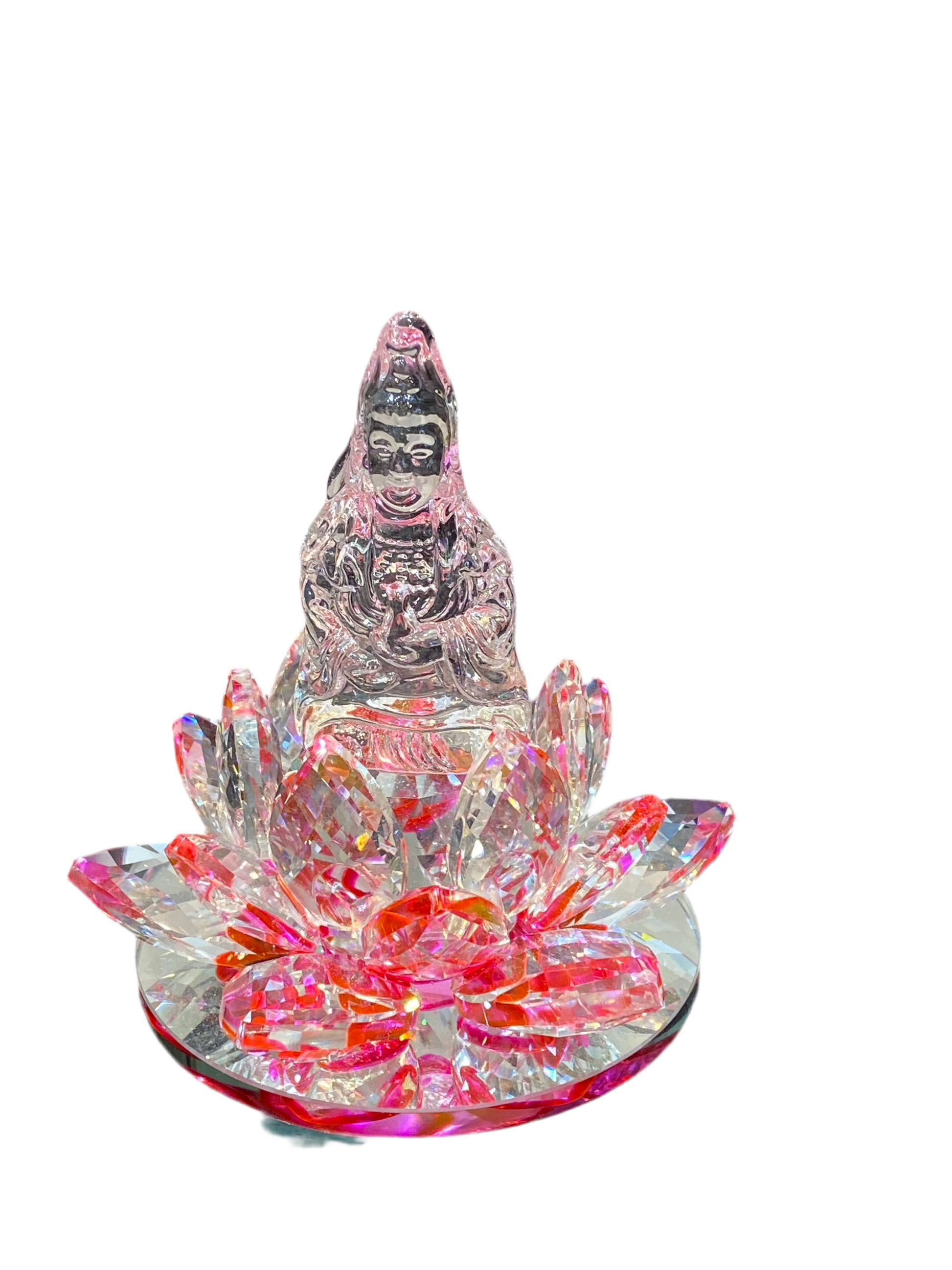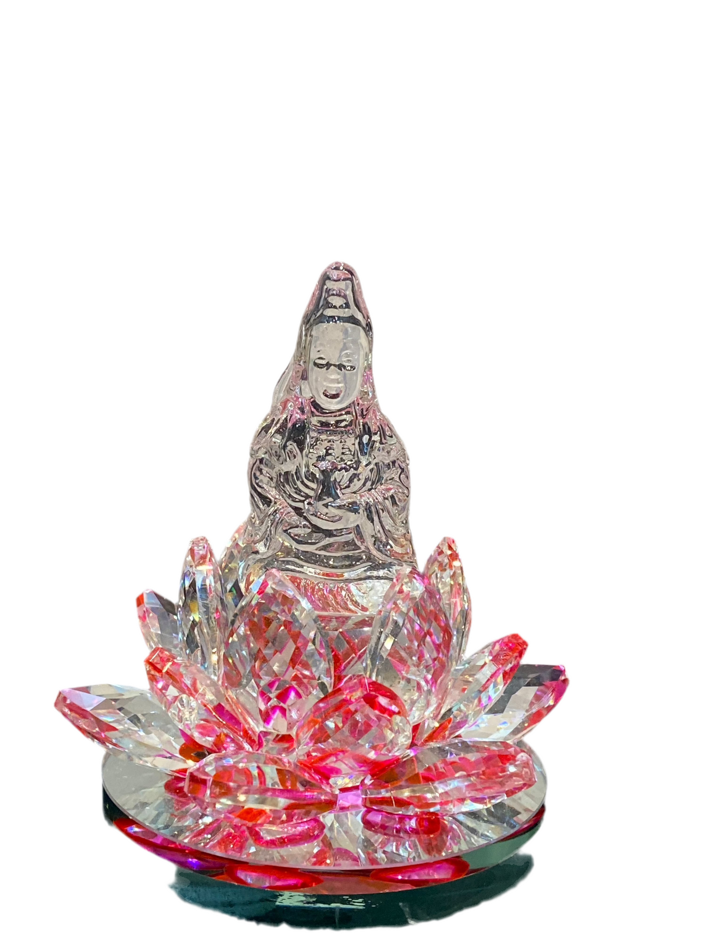 Crystal Kuan Yin sitting on a Lotus Hot Pink embodying the flame of mercy and compassion.