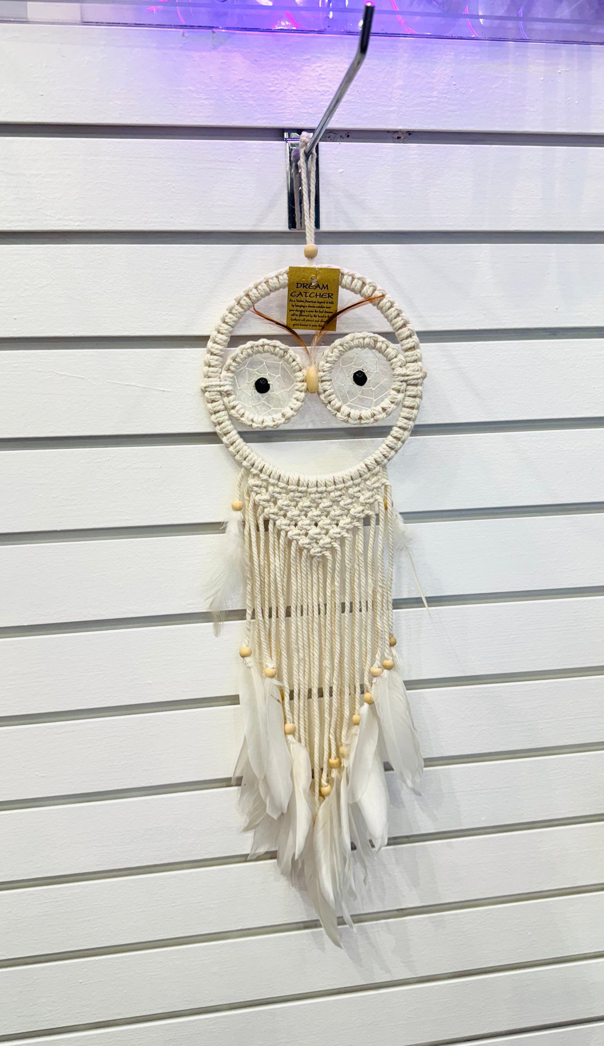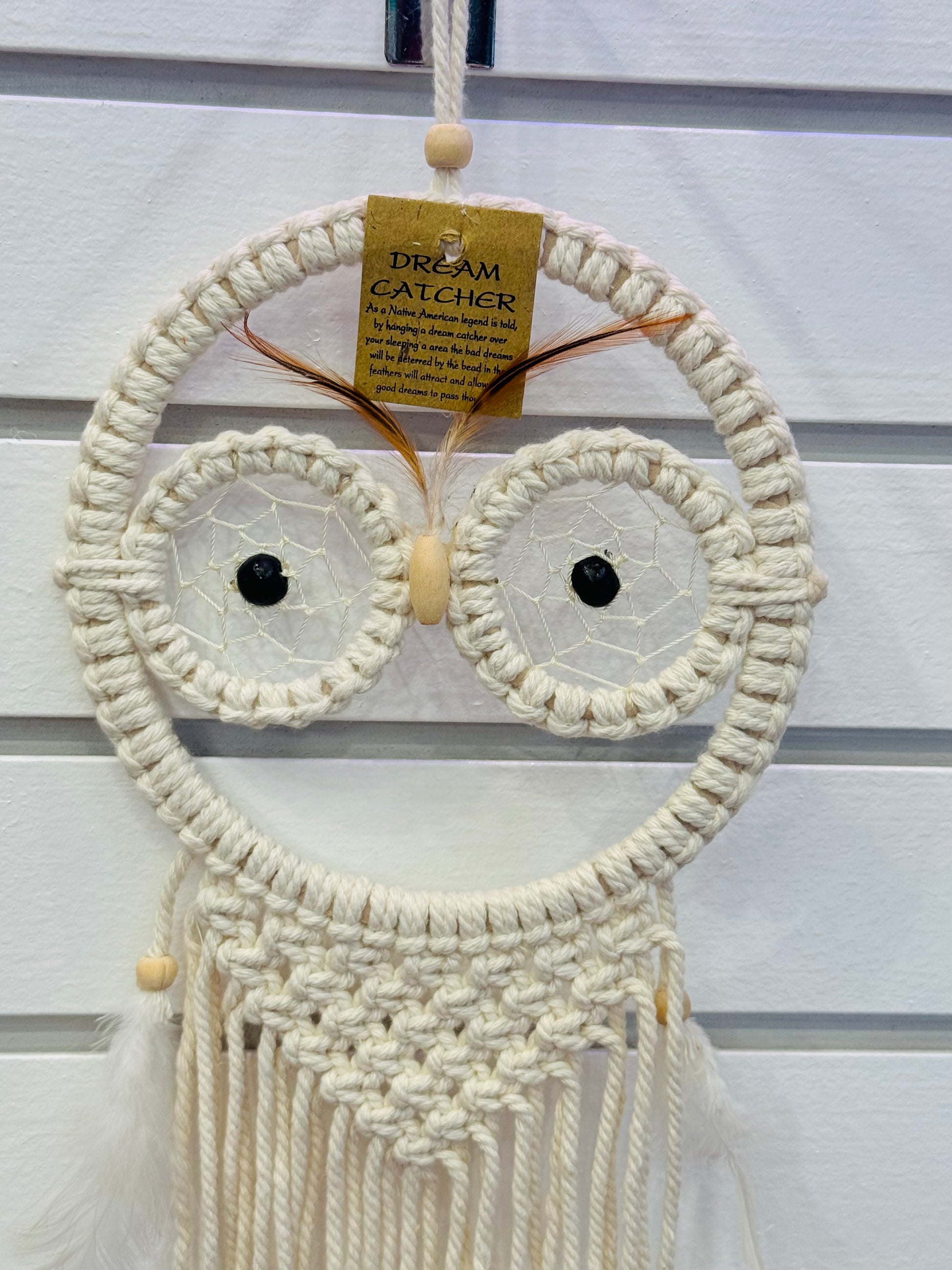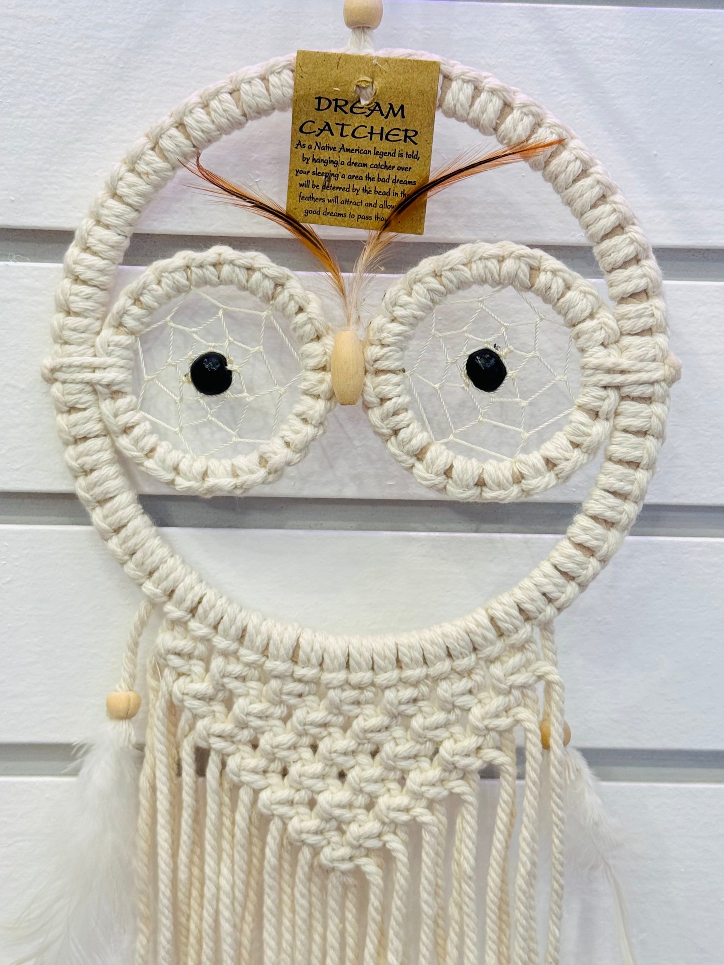 Natural color handmade owl dream catcher, with beads and feathers. Dream catchers are an ancient spiritual tool of the Native Americans used to help assure good dreams. A dream catcher is usually placed over your bed. As you sleep, good dreams pass through the center of the dream catcher, while bad dreams are caught in the webbing and are destroyed by the morning light.
