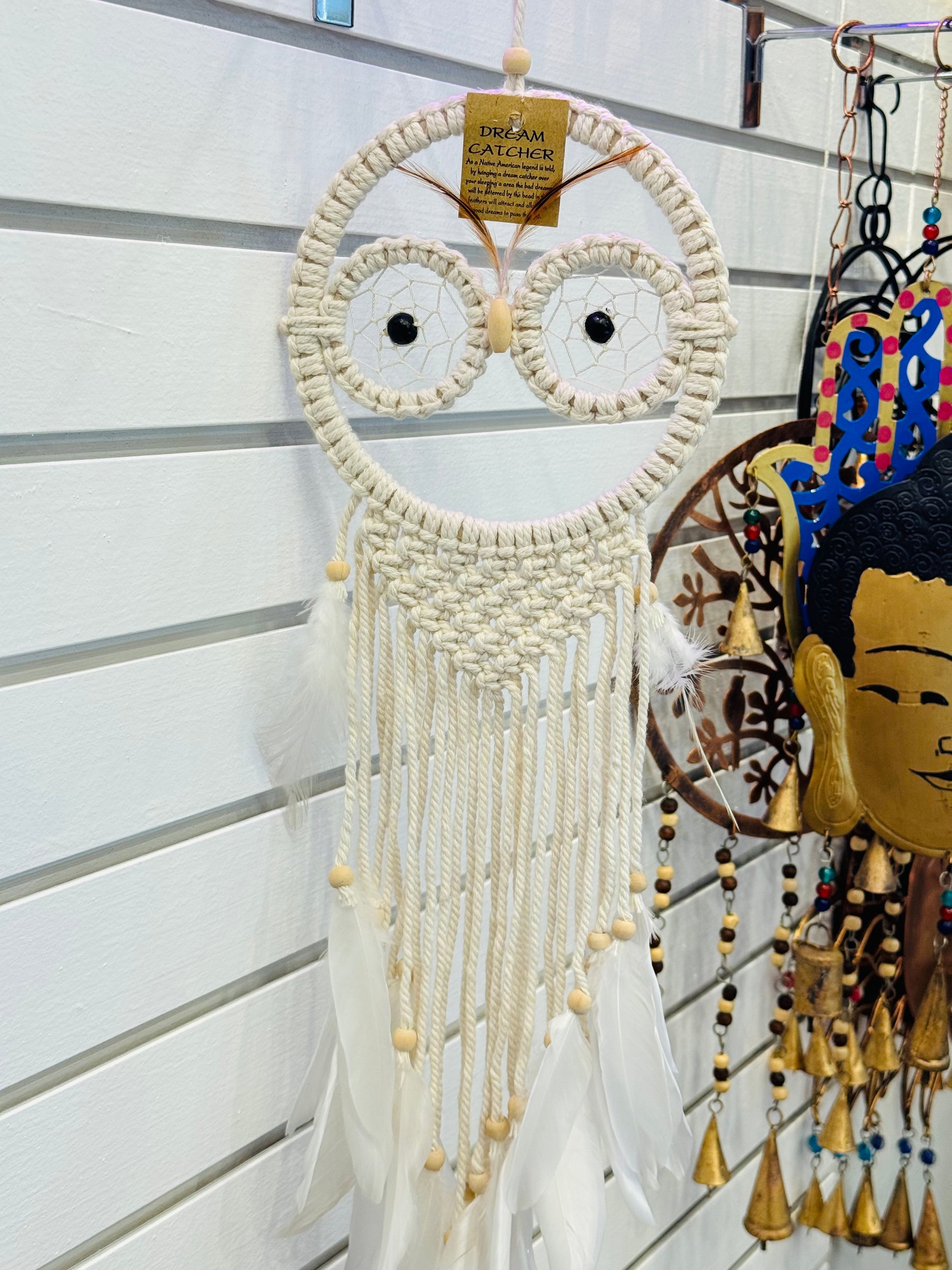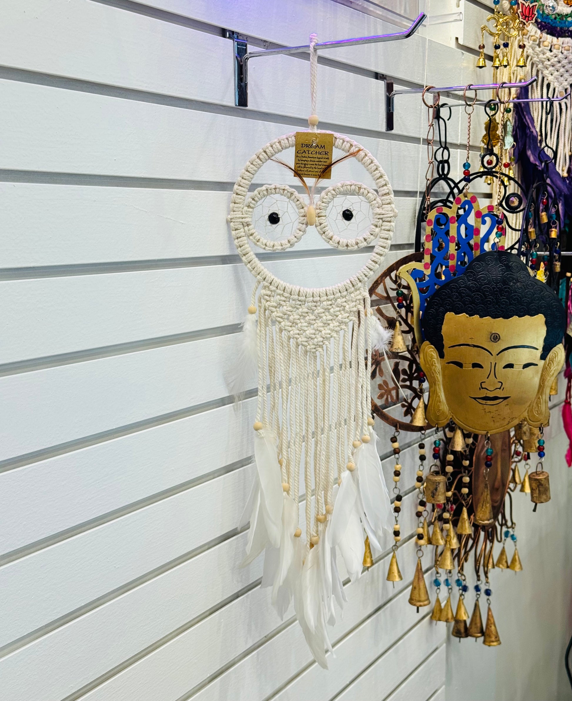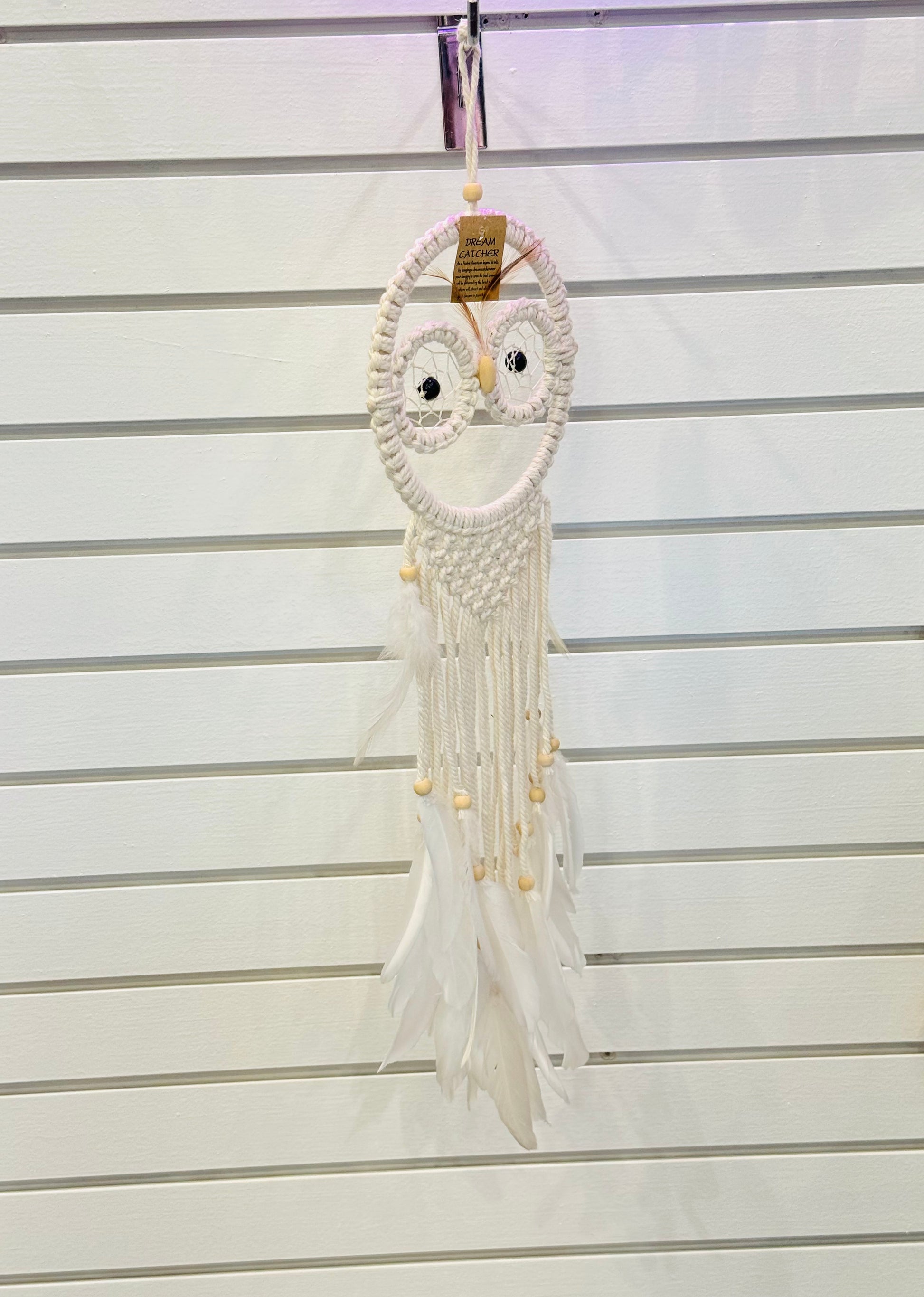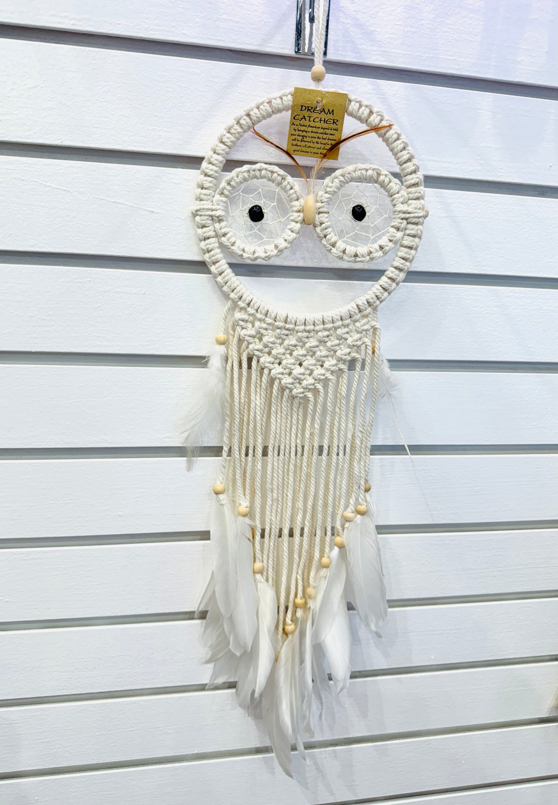 Natural color handmade owl dream catcher, with beads and feathers. Dream catchers are an ancient spiritual tool of the Native Americans used to help assure good dreams. A dream catcher is usually placed over your bed. As you sleep, good dreams pass through the center of the dream catcher, while bad dreams are caught in the webbing and are destroyed by the morning light.