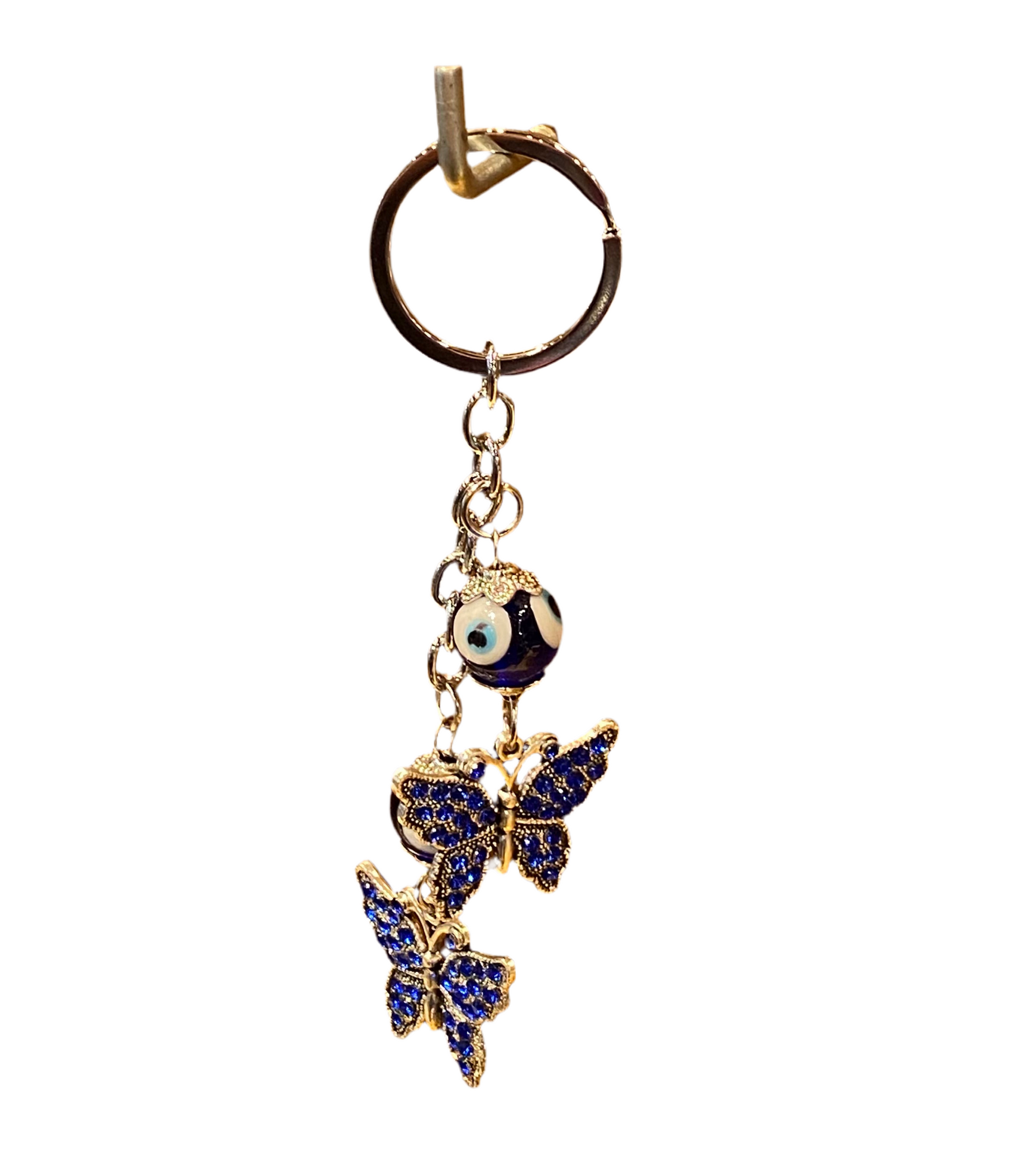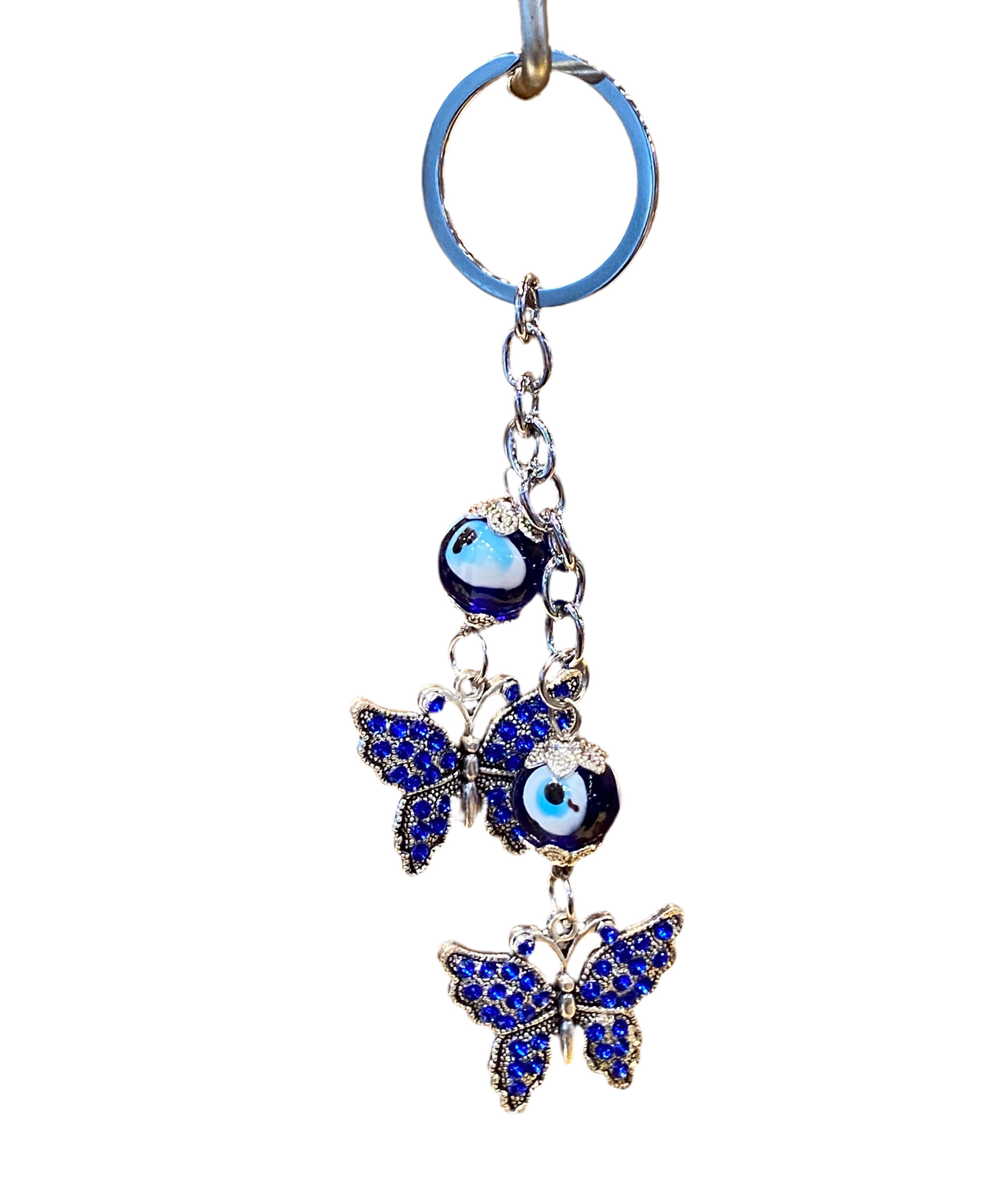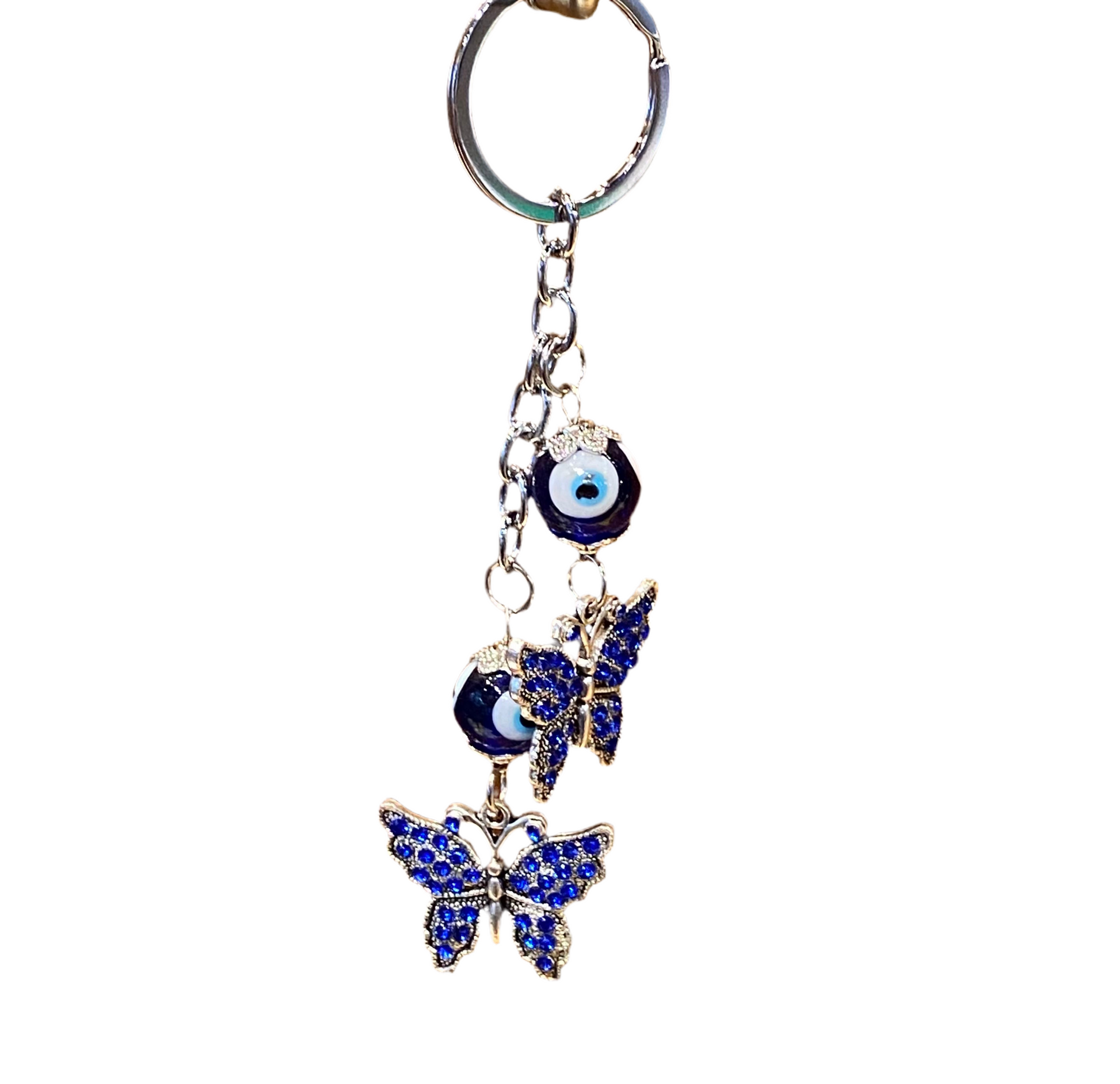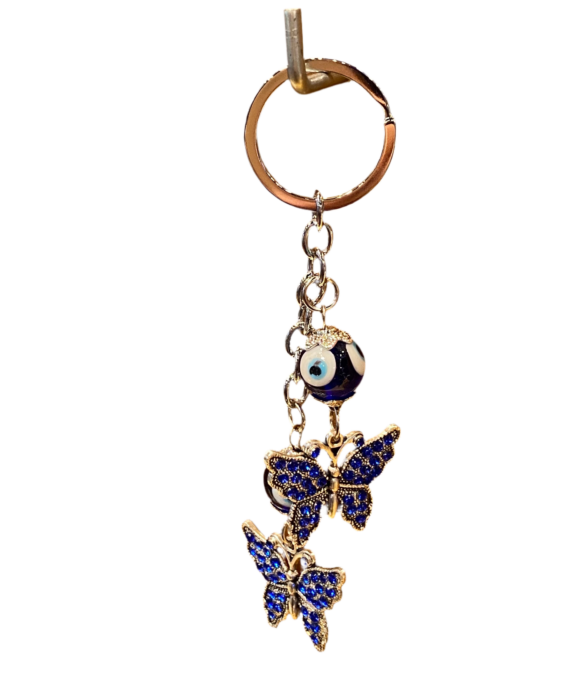 Metal blue evil eye butterfly keychain.