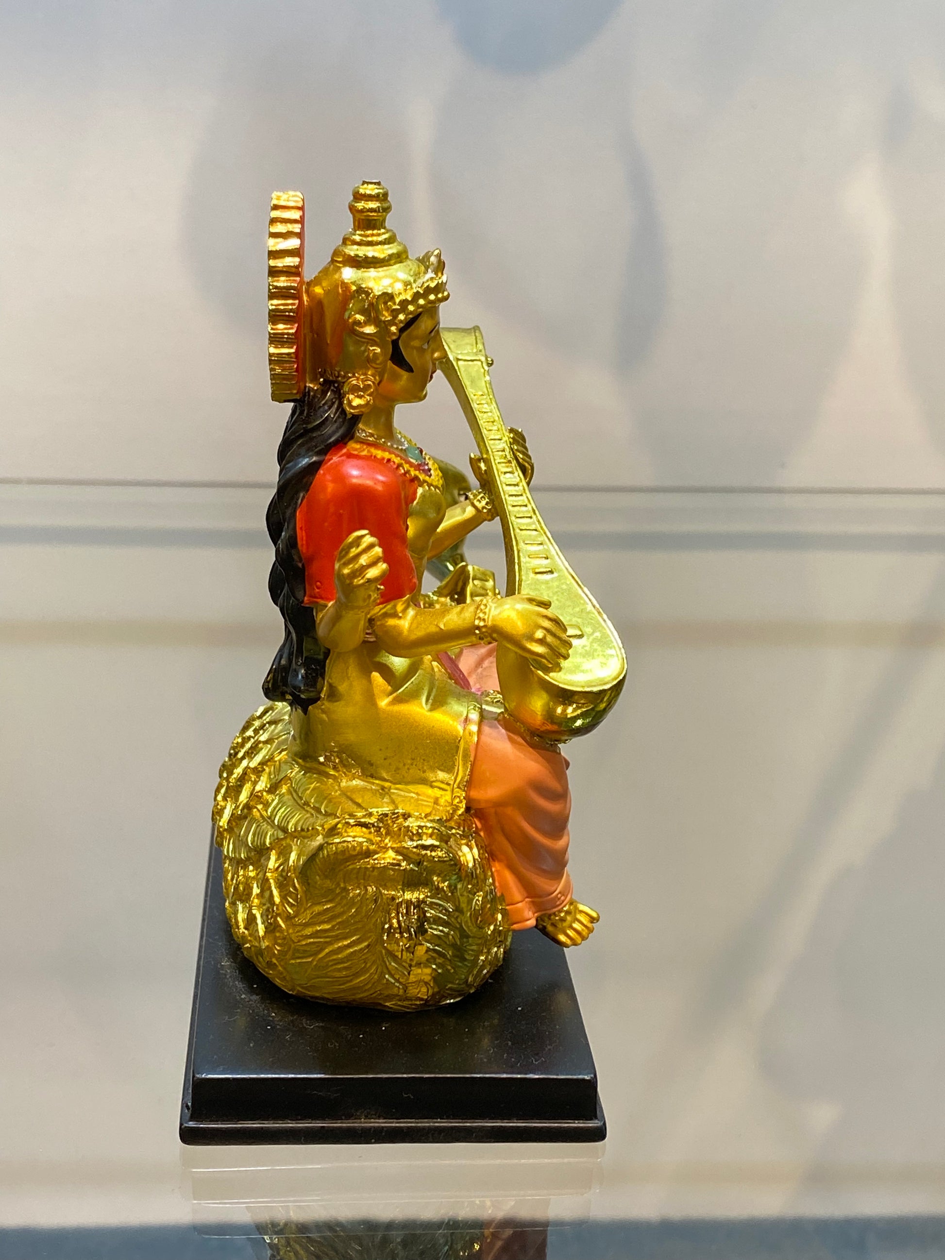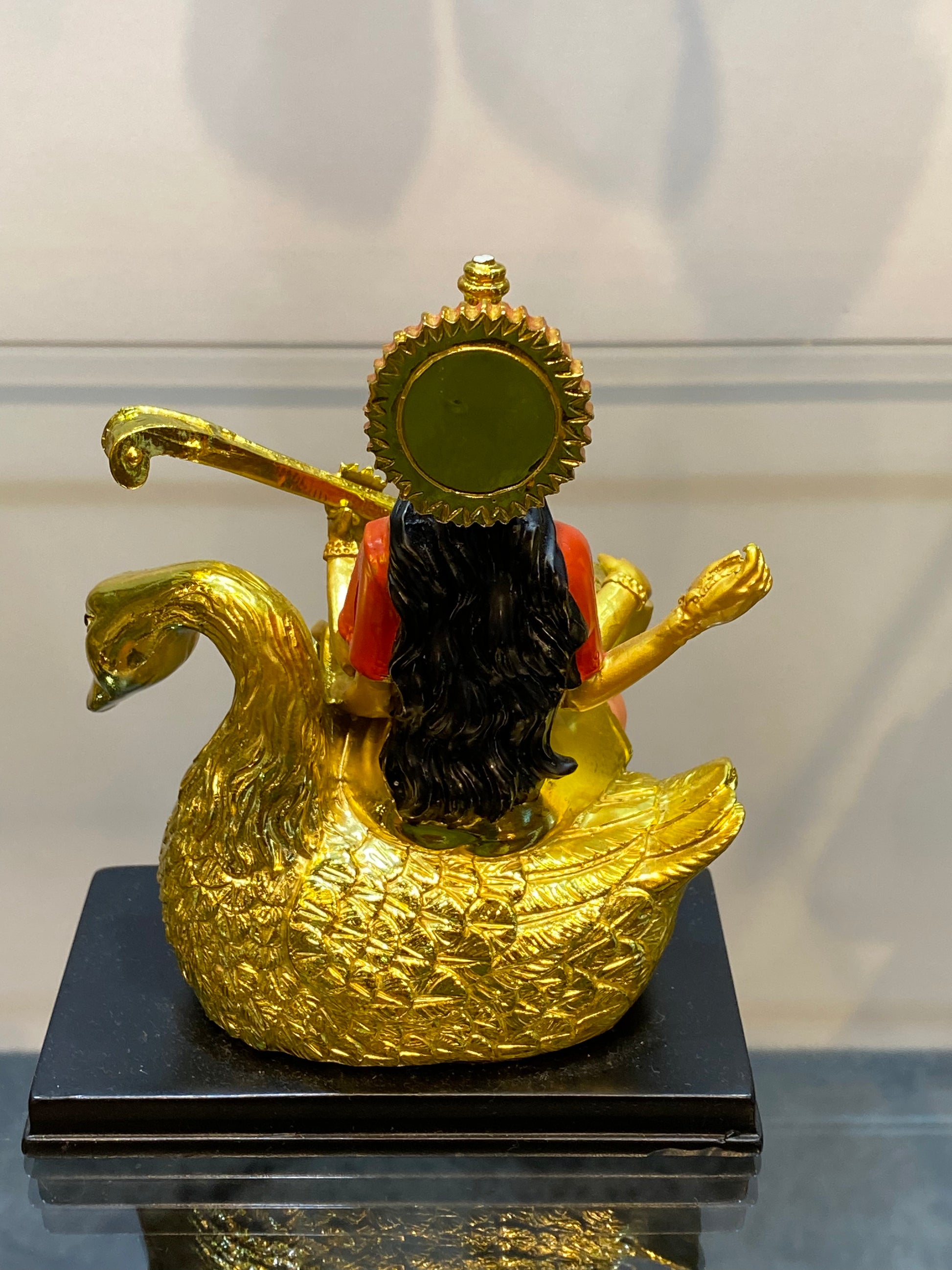 The beautiful bird-Hamsa (swan) is associated with the great Goddess Saraswati in Hindu tradition, as her mount, or Vahana, is a symbol of the virtues that the Devi bestows on her devotees. A Hamsa is legendarily known to have the ability to separate milk from water (neer-ksheer-viveka), representing the wisdom that can segregate between truth and untruth. This resin statue represents the powers of Devi Saraswati, who appears as Hamsavahini, enthroned on a lovely swan, whose form is marvelously depicted in this sculpture. Ma Saraswati is four-armed and is wrapped in a delicate saree, with a halo around her countenance, amplifying the glory of this aspect of the goddess.