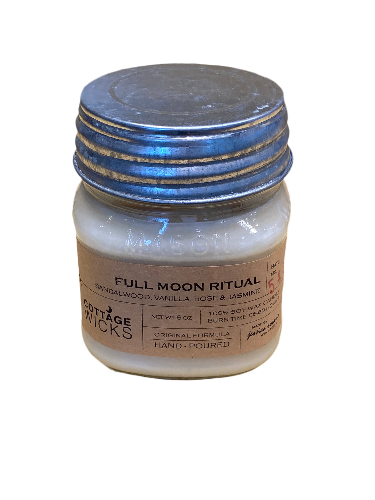 The full moon represents action, completion, self-expression, creativity and abundance. The full moon is a time for letting go of what prevents you from enjoying your life. This is a powerful and mysterious blend of sandalwood, black coffee and cardamon. Garnished with jasmine, white sage, mugwort, and lemon balm calming energies, cleansing, mental strength + healing + moonstone, mica Soy candle 45-50 hr burn time.Made in United States by Cottage Witch Botanicals