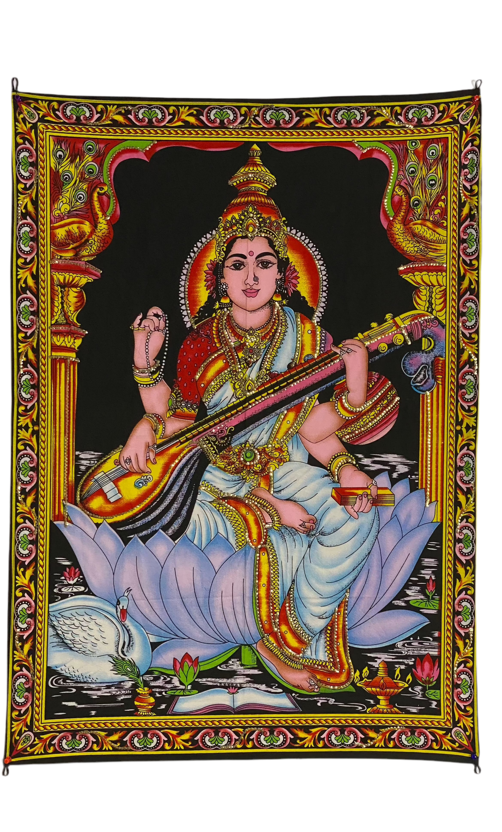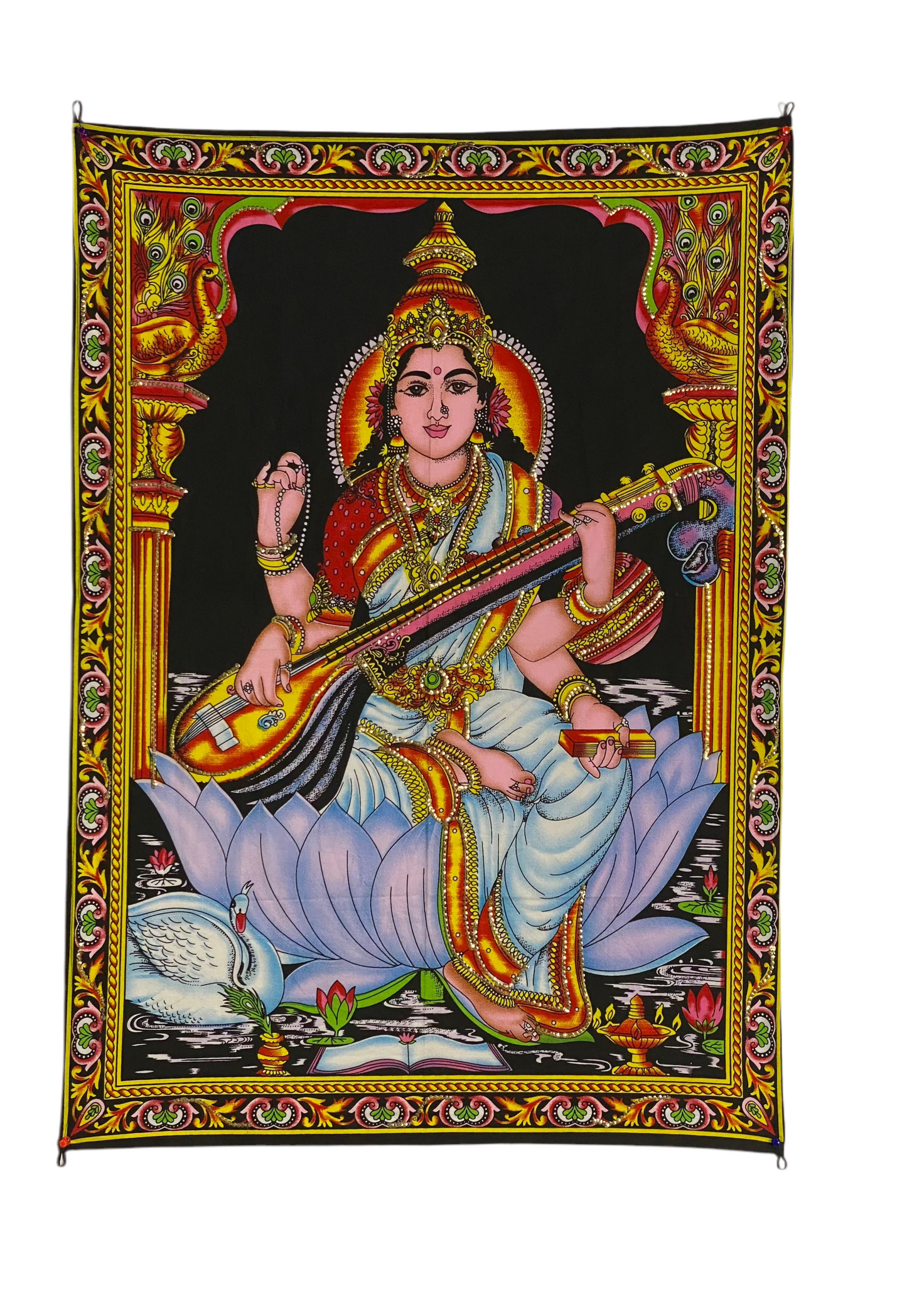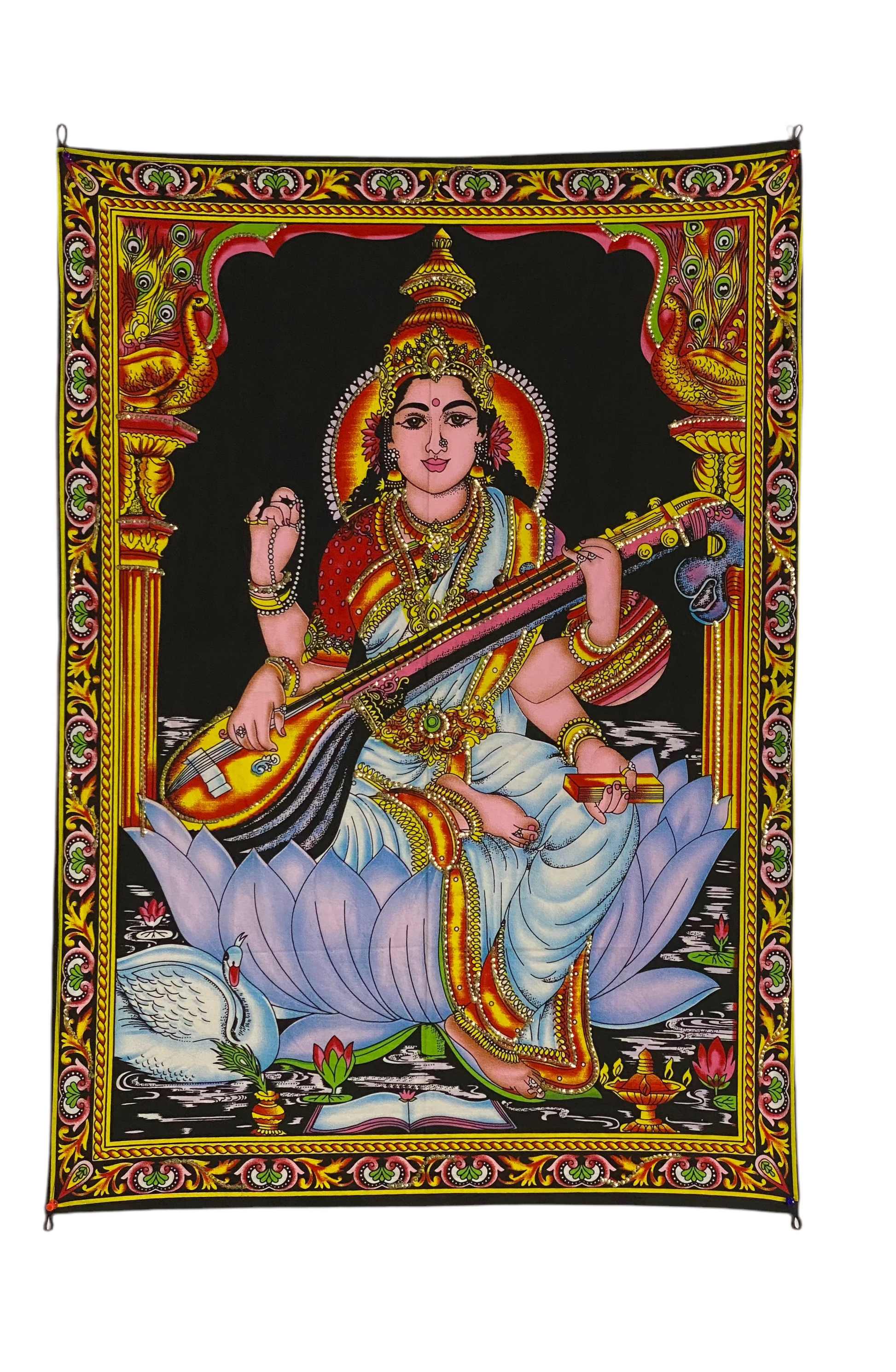 The Goddess Saraswati Tapestry is a beautiful representation of Saraswati, the goddess of knowledge, music, art, speech, wisdom, and learning. It is believed that Goddess Saraswati blesses human beings with intelligence, creativity, and the gift of expression. This Goddess Saraswati Tapestry serves as a reminder of her divine guidance in education, the arts, and spiritual wisdom.