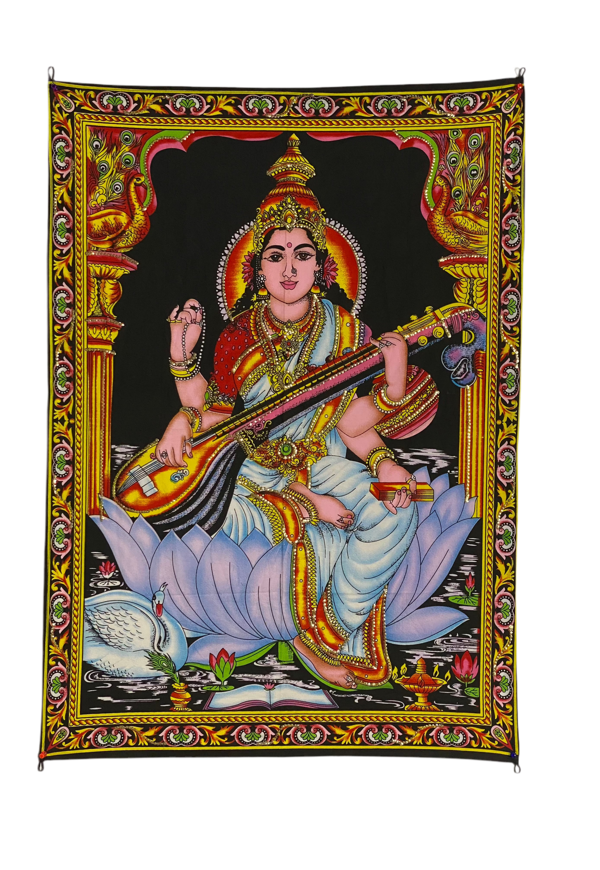 Invite the wisdom and grace of Saraswati into your space with the Goddess Saraswati Tapestry, a sacred addition to any home or meditation area.