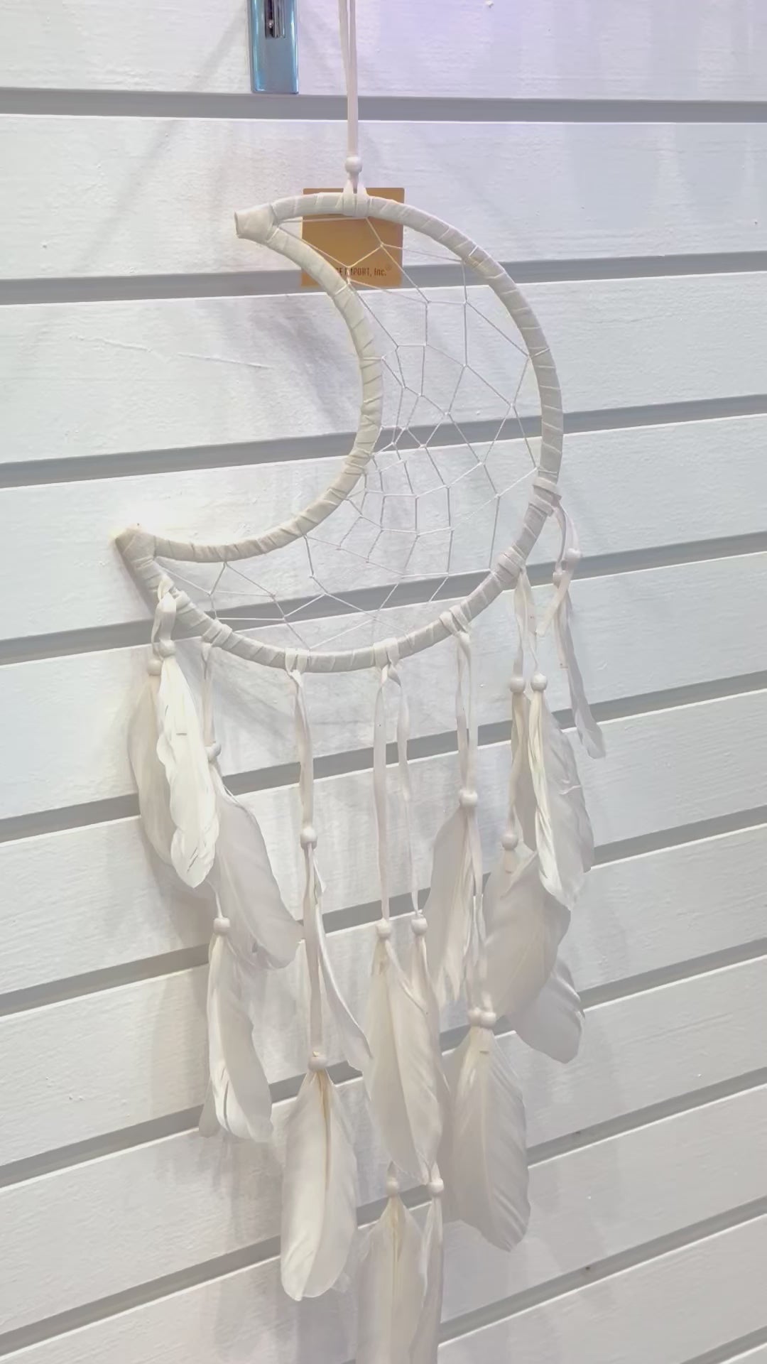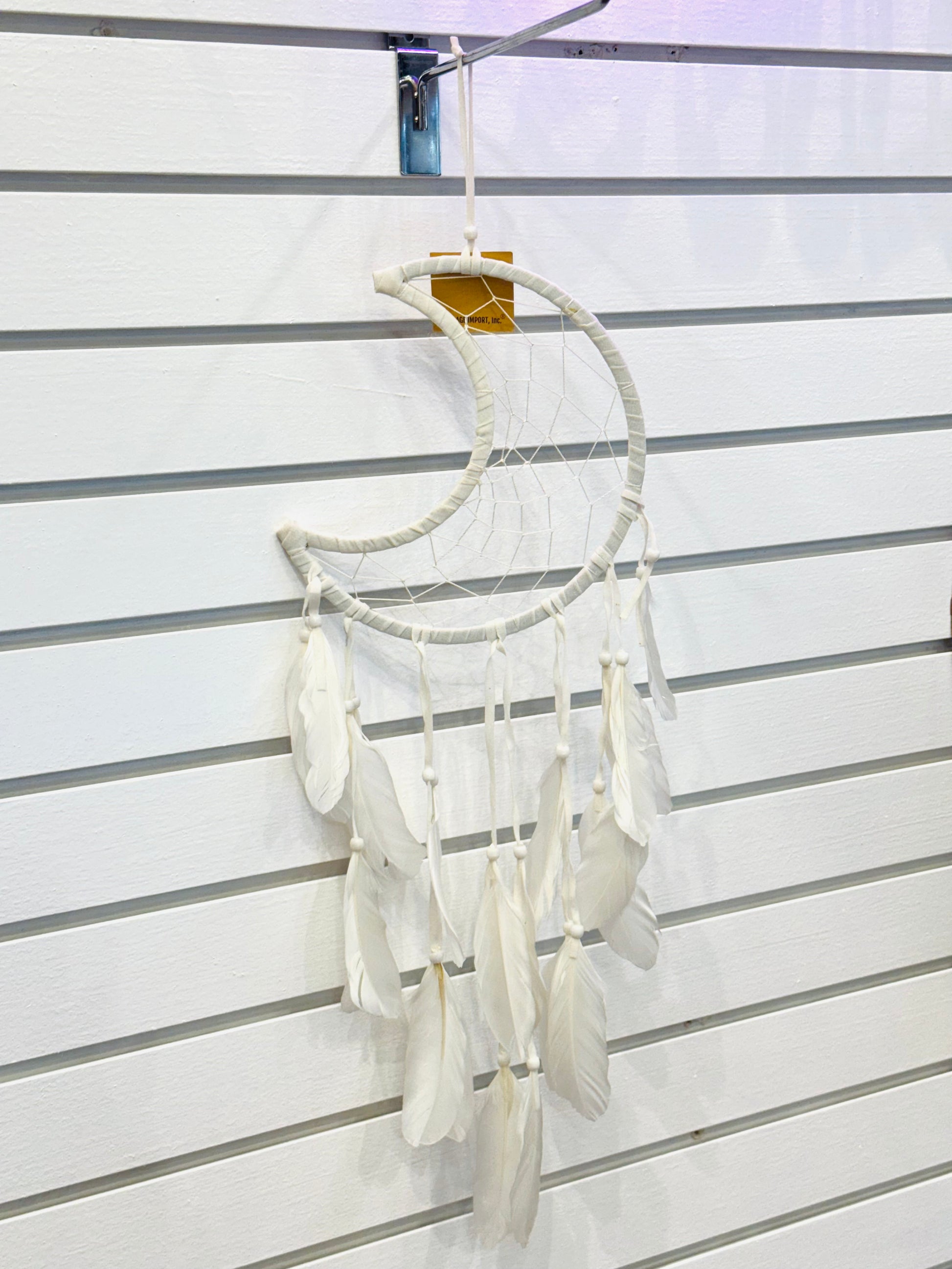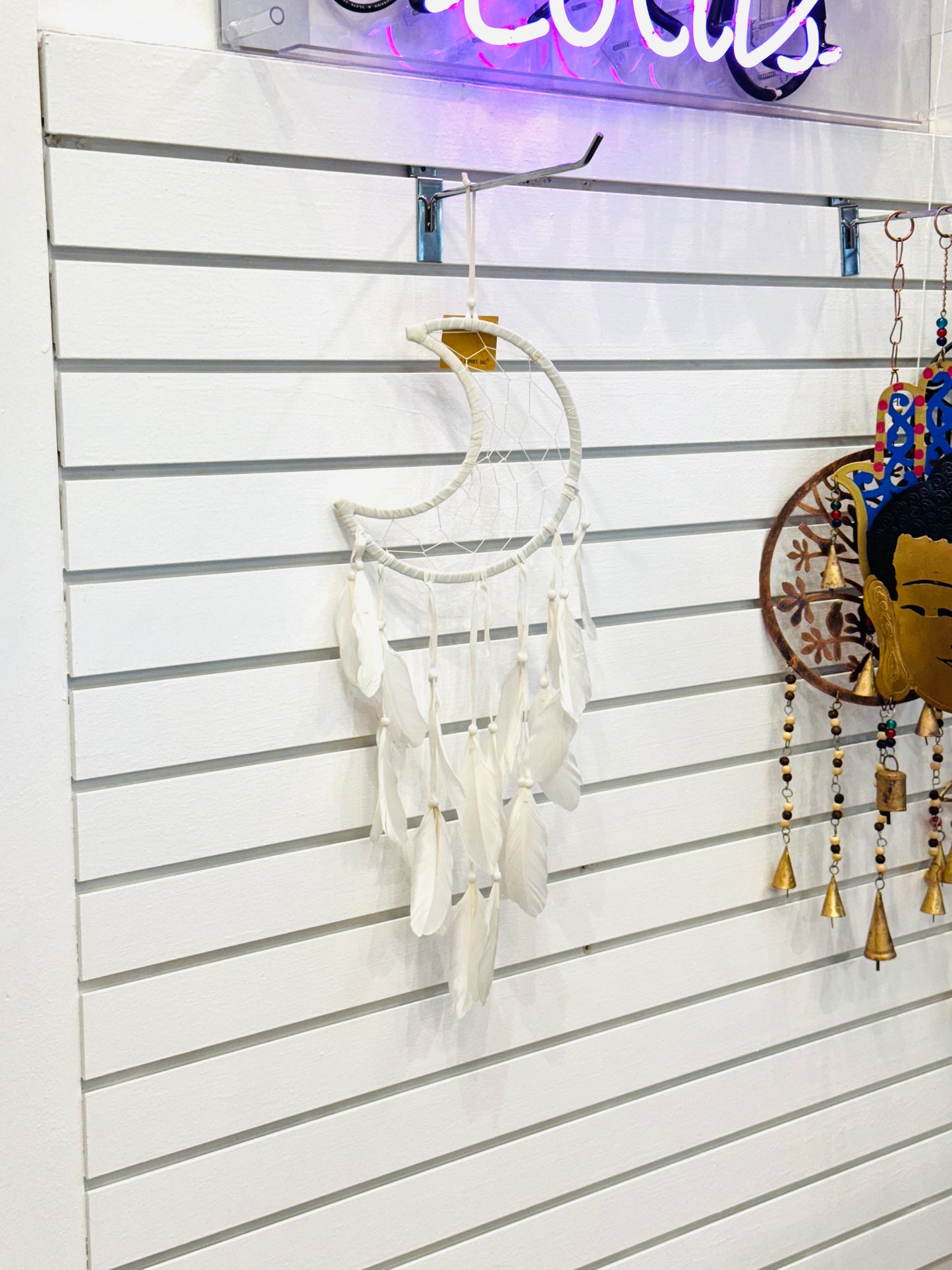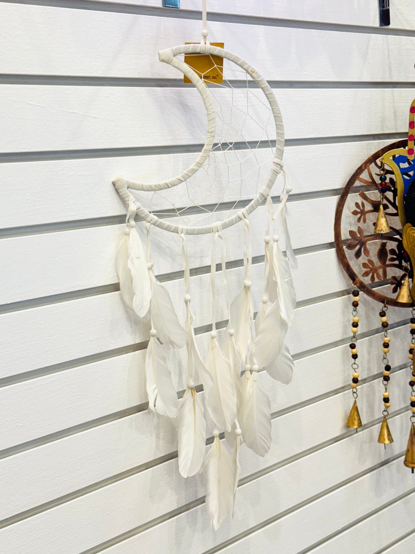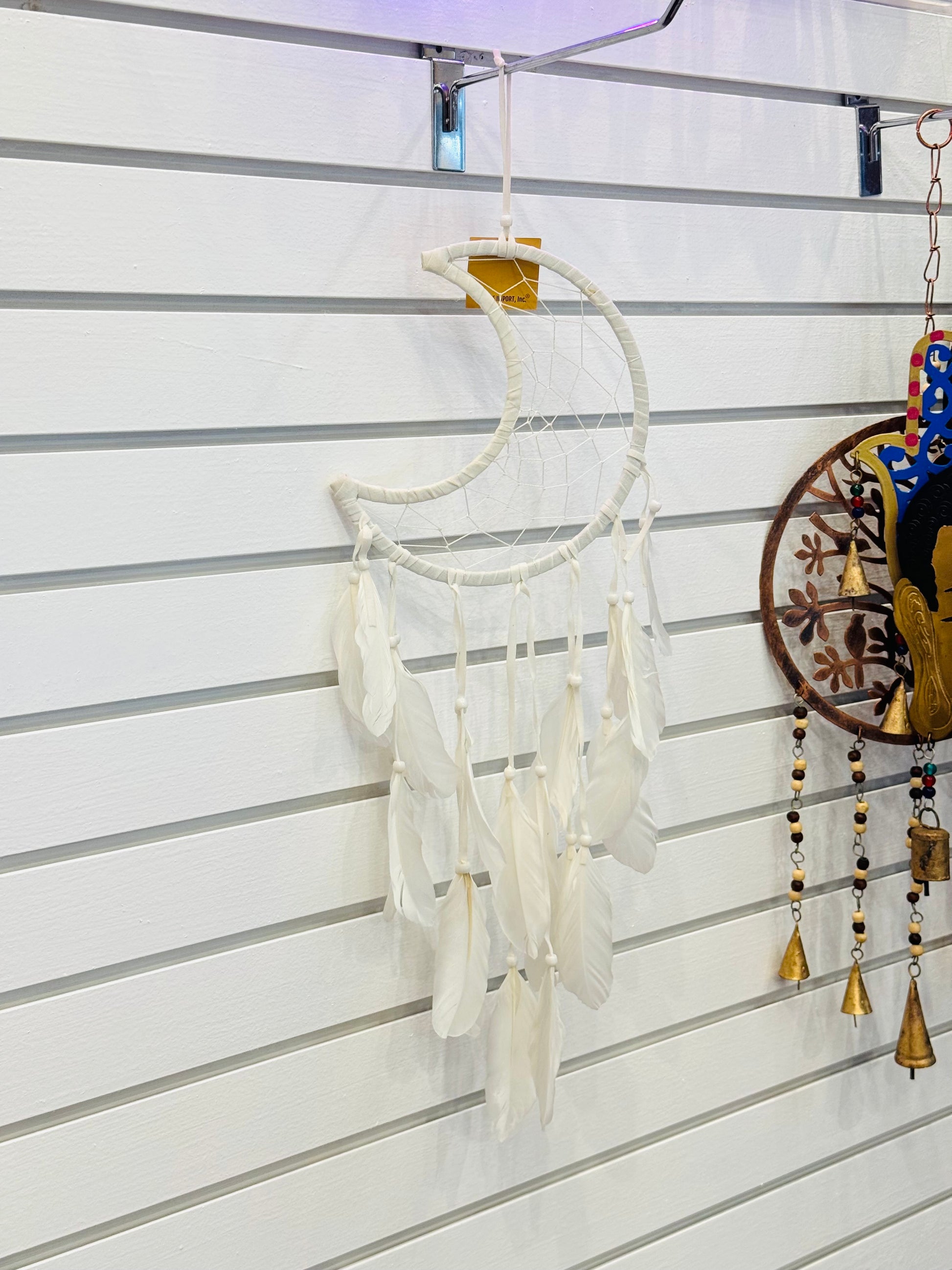 Half Crescent Moon White Dreamcatcher with White Feathers