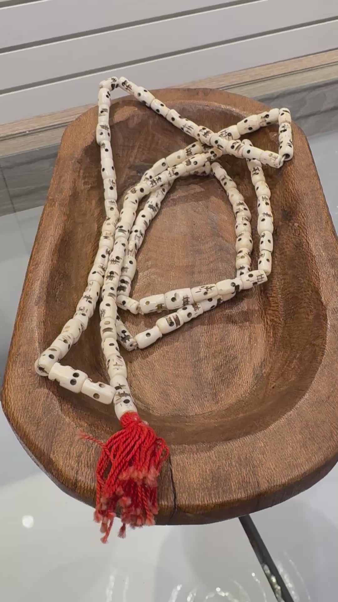 This traditional mala prayer bead necklace is handmade in Nepal using ethically sourced water buffalo bone, with each bead intricately carved with a skull. In Nepalese and Tibetan culture, the skull symbolizes the impermanence of life, reminding practitioners to live mindfully and let go of attachment and ego, core teachings in Buddhism. The mala features 108 beads, the sacred number used in mantra meditation to count recitations and maintain focus. A mala is similar to a rosary and is used to enhance concentration, clarity, and spiritual awareness during meditation or prayer. This mala can be worn as a necklace or used as a versatile accessory to enhance your boho-chic, free-spirited look. You can hang it on your car mirror, place it on your altar, wrap it around your wrist, or use it as home decor for a touch of mindful style. Necklace Length: 52" Tassel Length: 1"