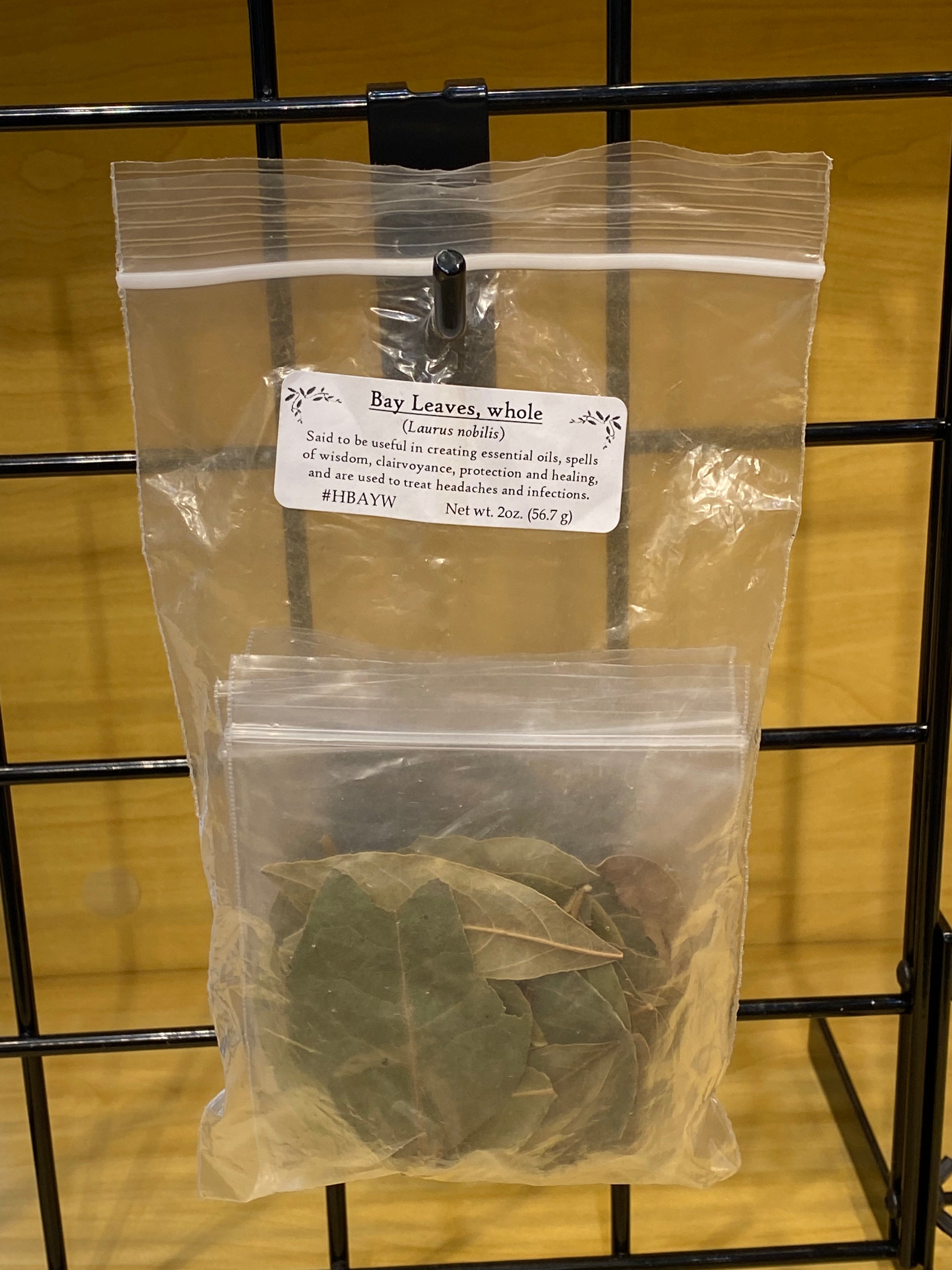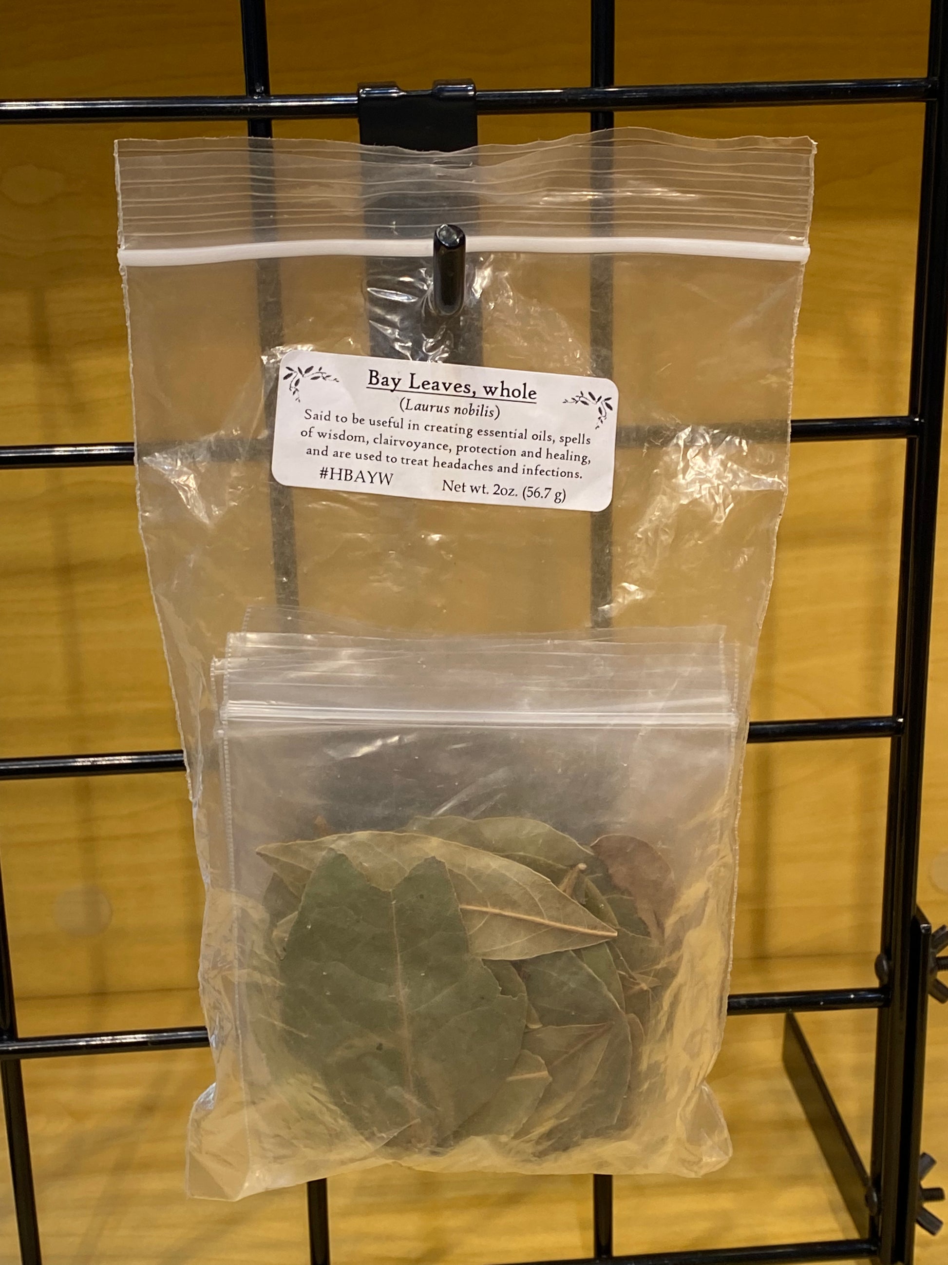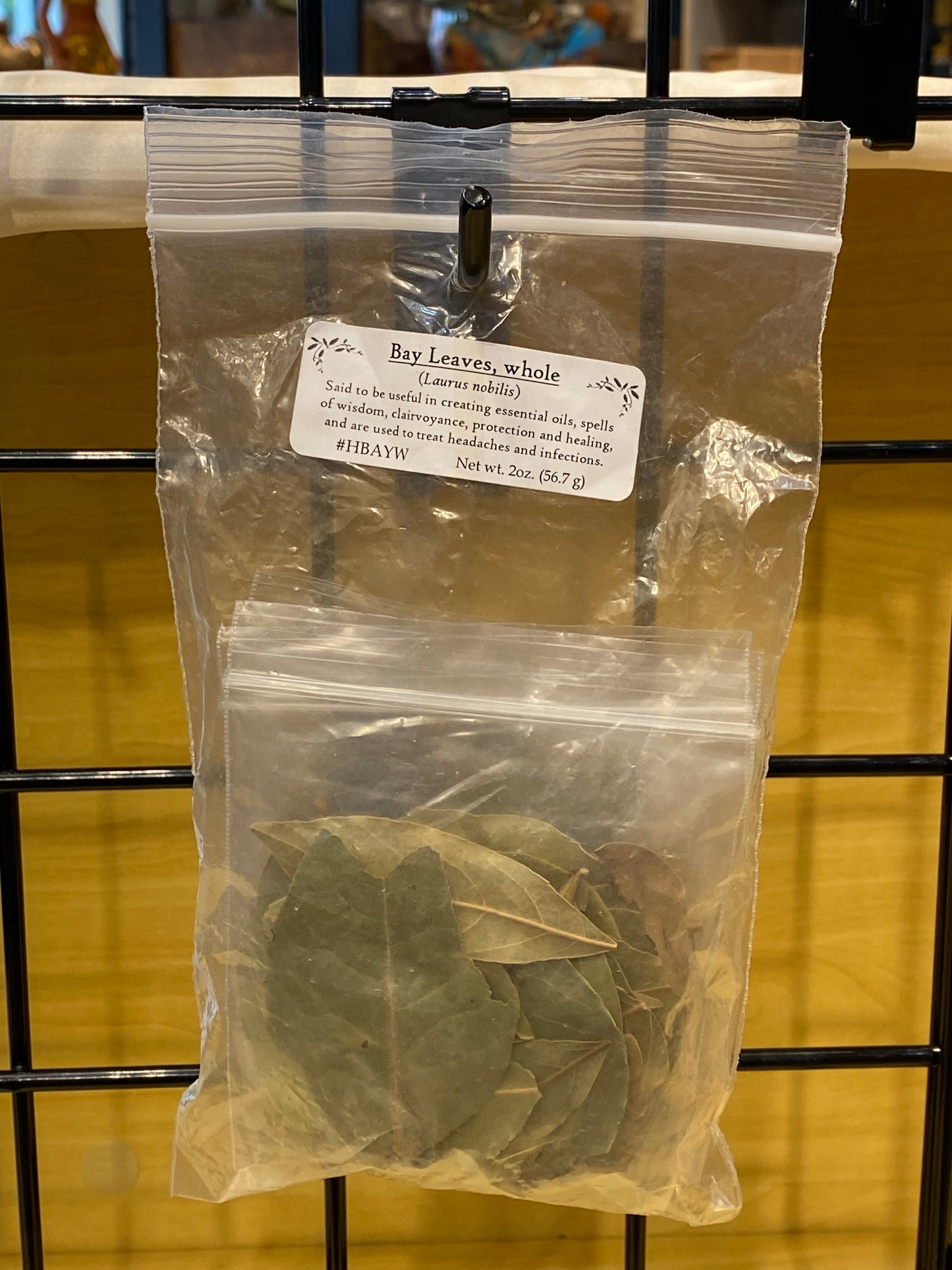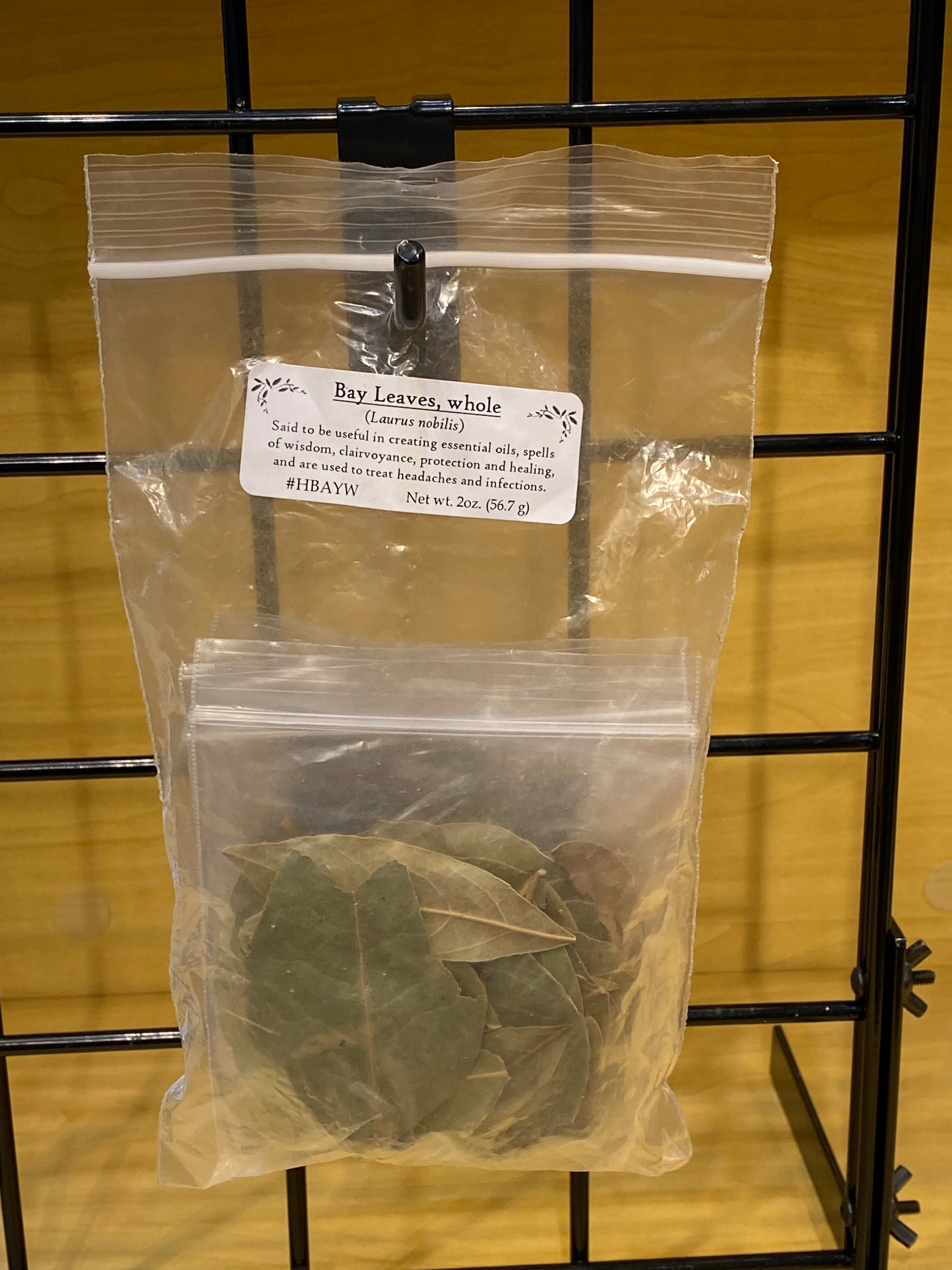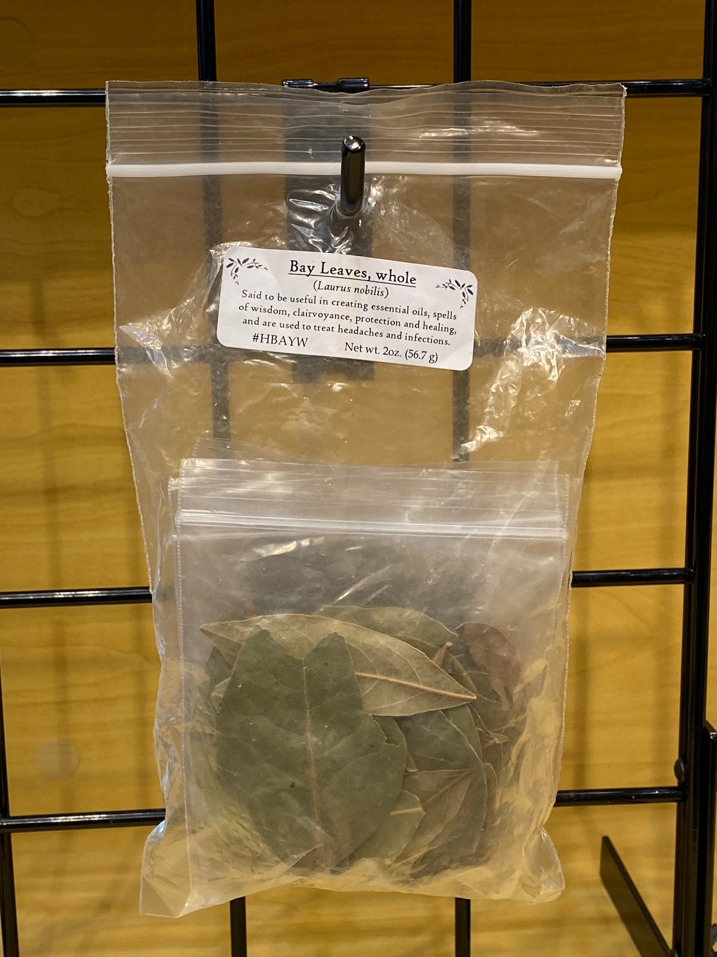 Bay Leaves Whole: Said to be useful in creating essential oils, spells of wisdom, clairvoyance, protection and healing and are used to treat headaches and infections.( 2 Oz. )