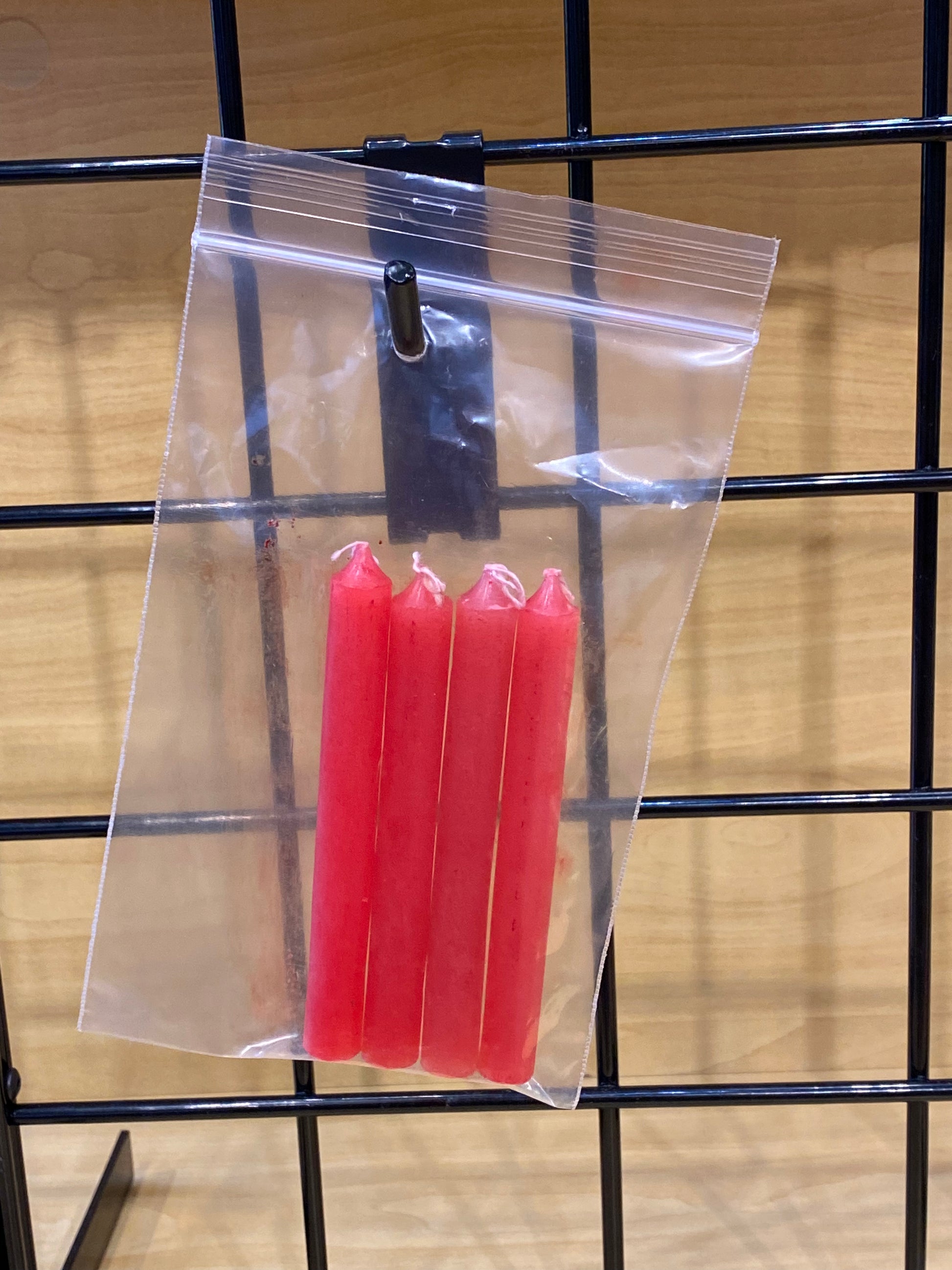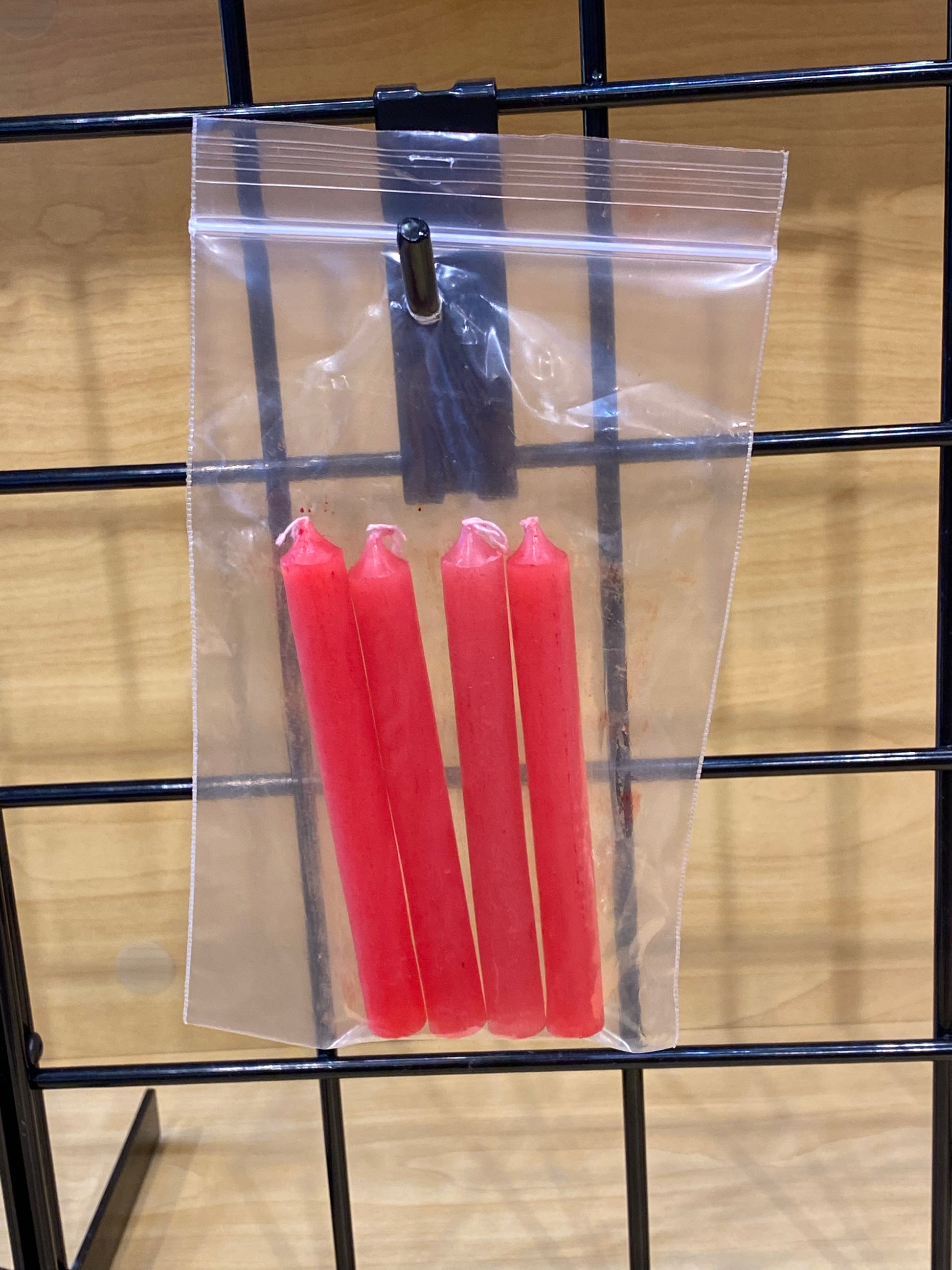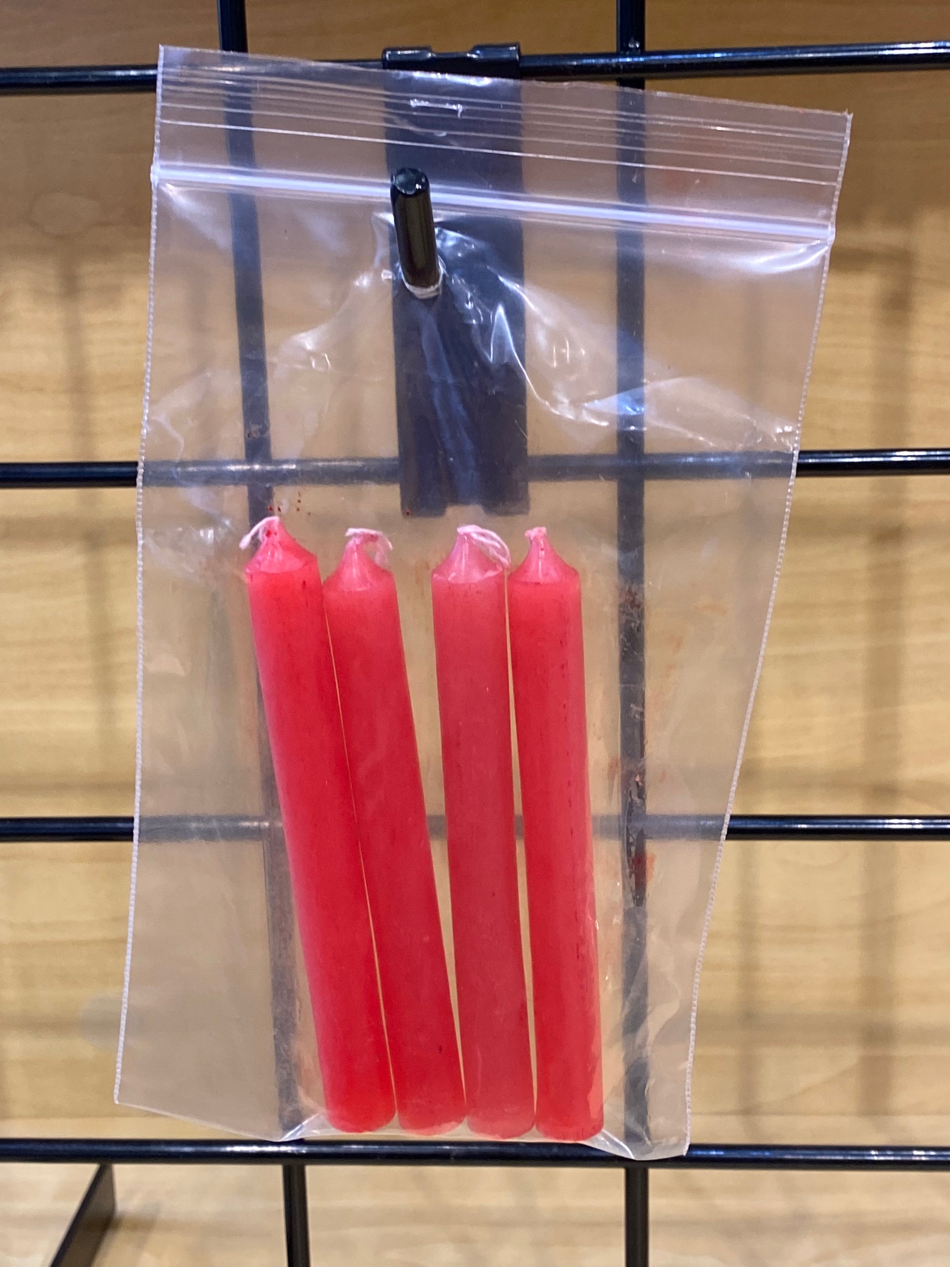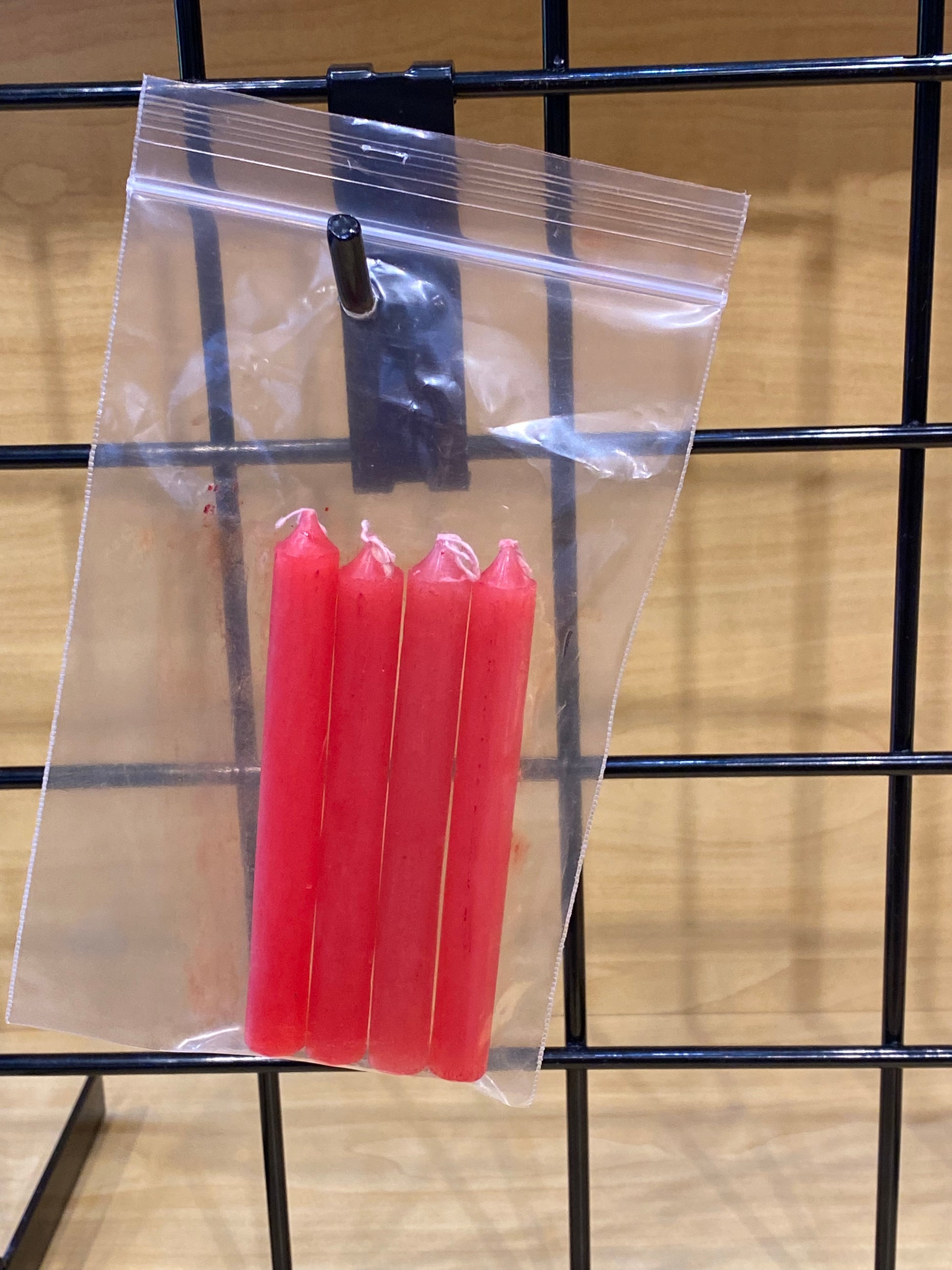 The Red Mini Chime Ritual Spell Candles measure approximately 4" tall and 1/2" in diameter, and come in sets of four.