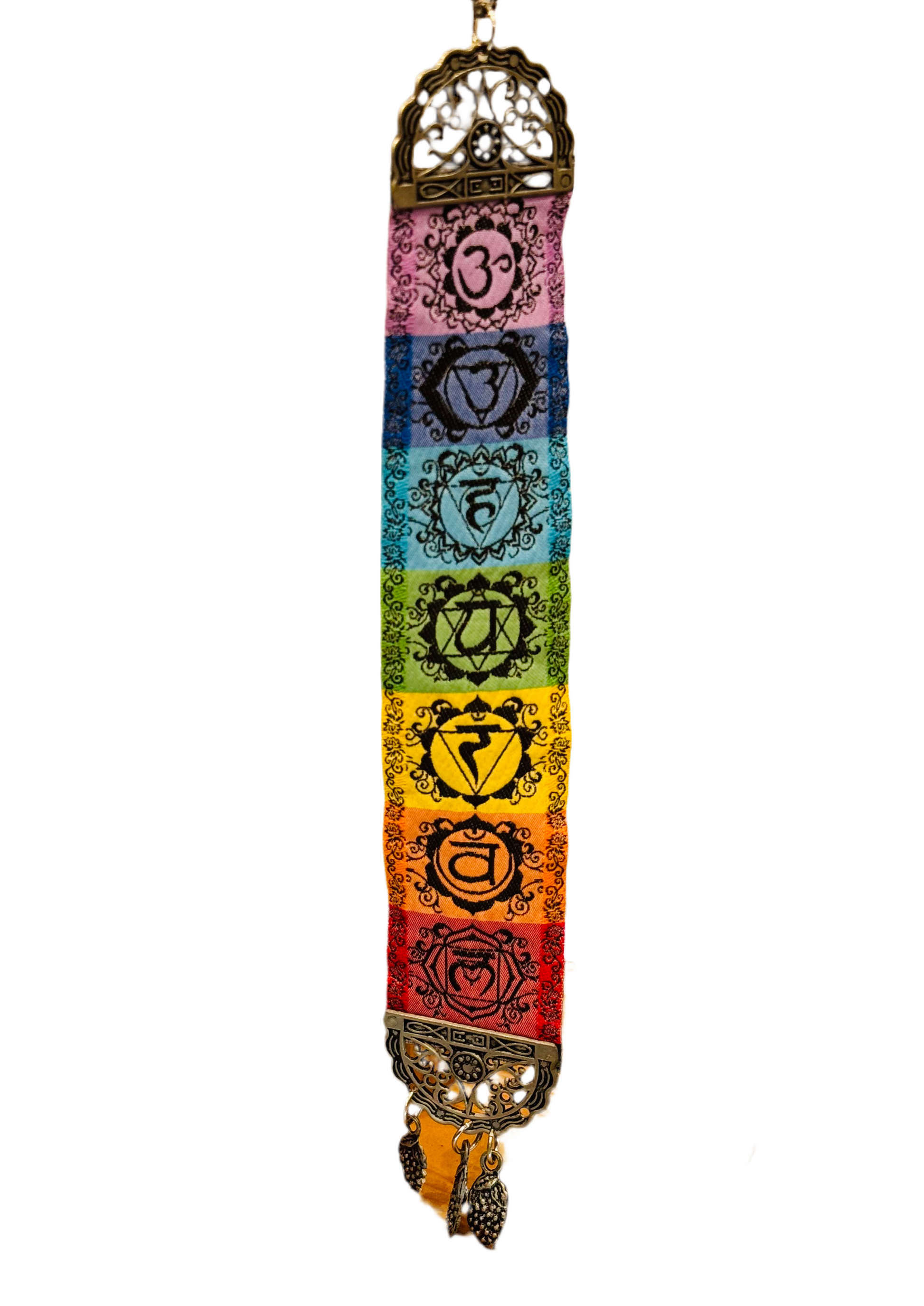 This colorful mini hanging carpet is sure to energize a room. It features the colors and symbols of all seven chakras. Both ends of the carpet have been finished with a lovely antiqued metal frame. The top frame has a hanging loop and the bottom frame features matching leaf tassels.