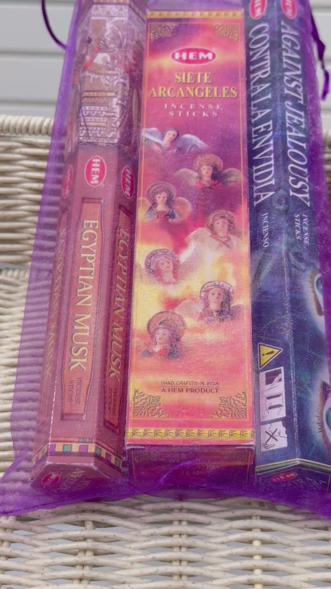 The Heavenly Bliss Incense Kit is designed to elevate your spiritual practices with its trio of sacred aromas. The Heavenly Bliss Incense Kit includes HEM Siete Archangels Incense to invite divine blessings, HEM Against Jealousy Incense to protect against negativity, and HEM Egyptian Musk Incense to create a calming, luxurious atmosphere. Perfect for prayer, meditation, or creating a harmonious space, the Heavenly Bliss Incense Kit offers protective and spiritual aromas to bring serenity and balance. With the Heavenly Bliss Incense Kit, you can enhance your rituals and enjoy the divine fragrances crafted for your well-being. The Heavenly Bliss Incense Kit is your go-to for a peaceful and sacred environment.