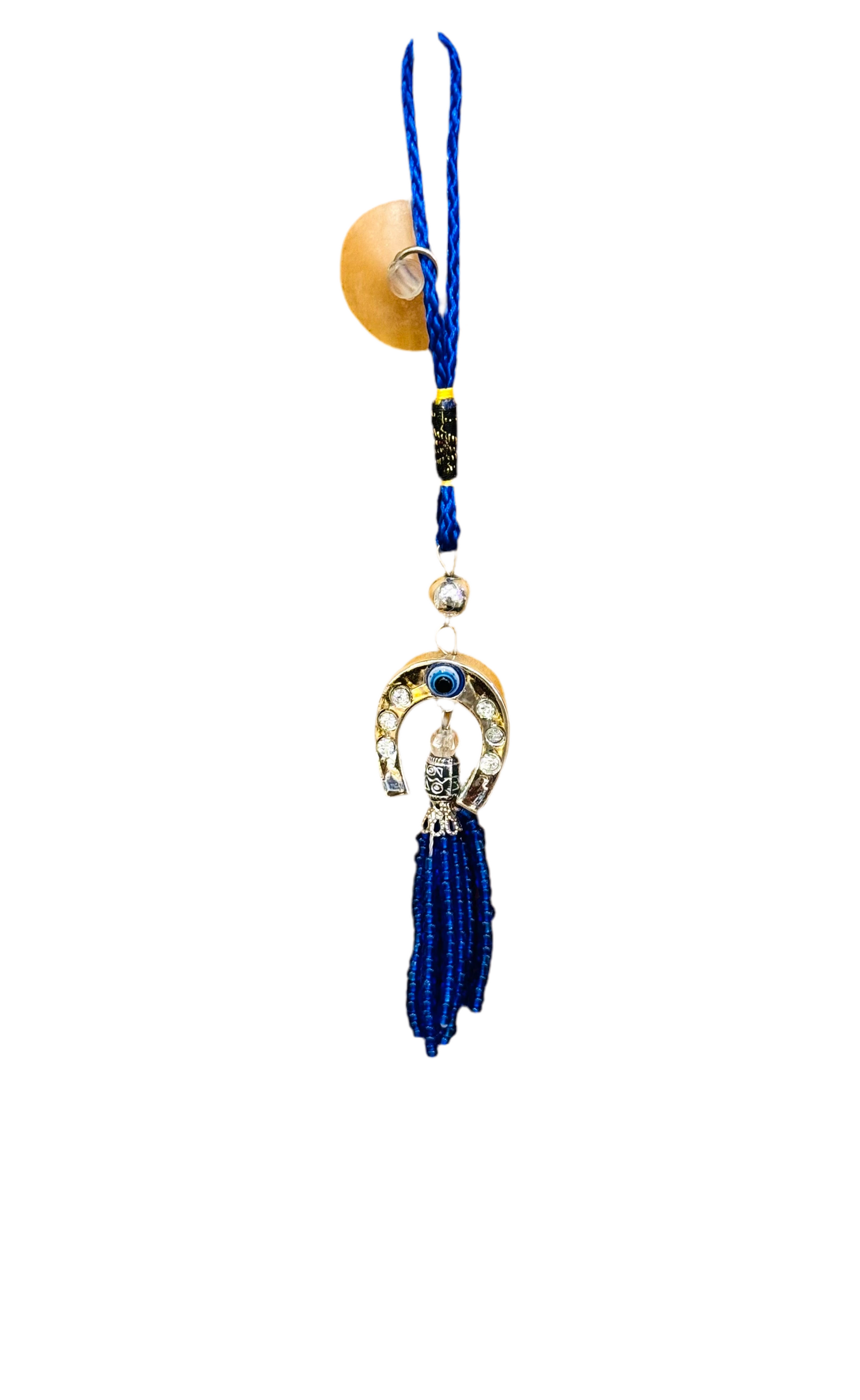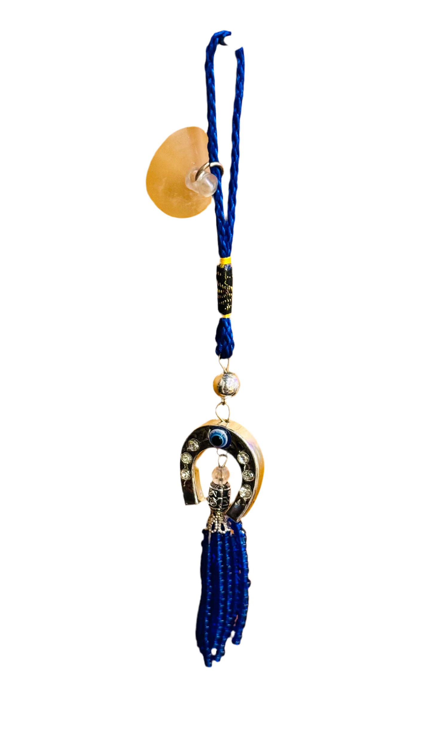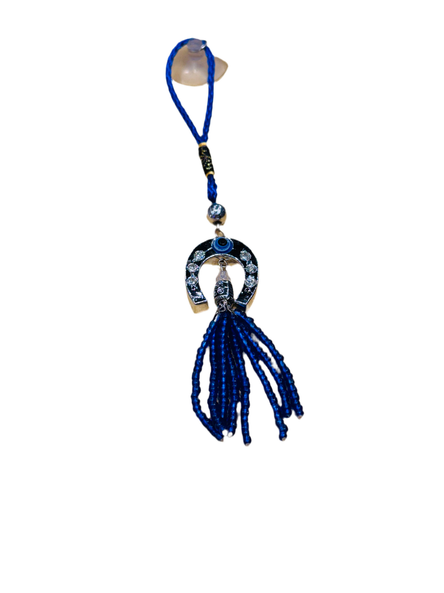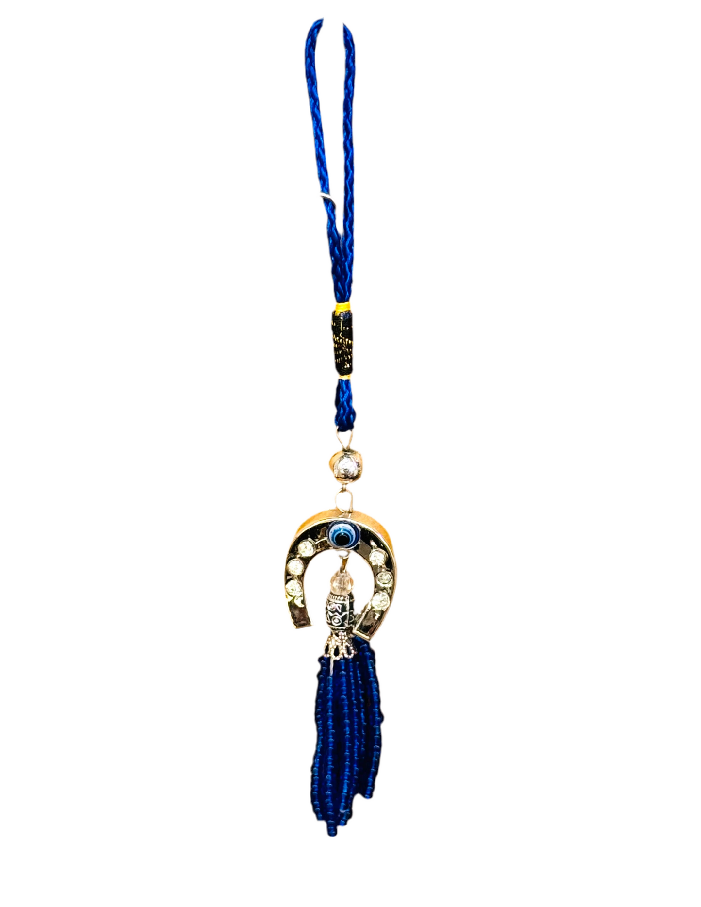 This decorative horseshoe ornament features non precious metal, threaded beads, and the Mati evil eye. There is an evil eye bead and threaded beads beneath the horseshoe ornament.
