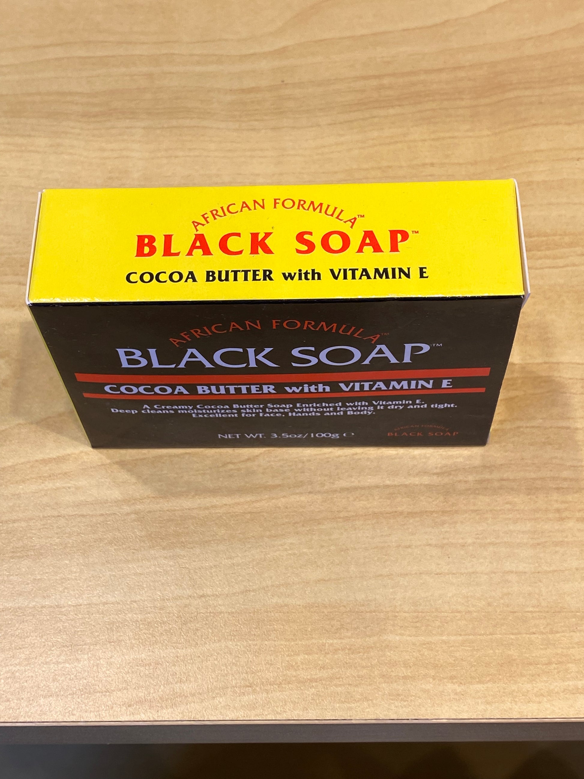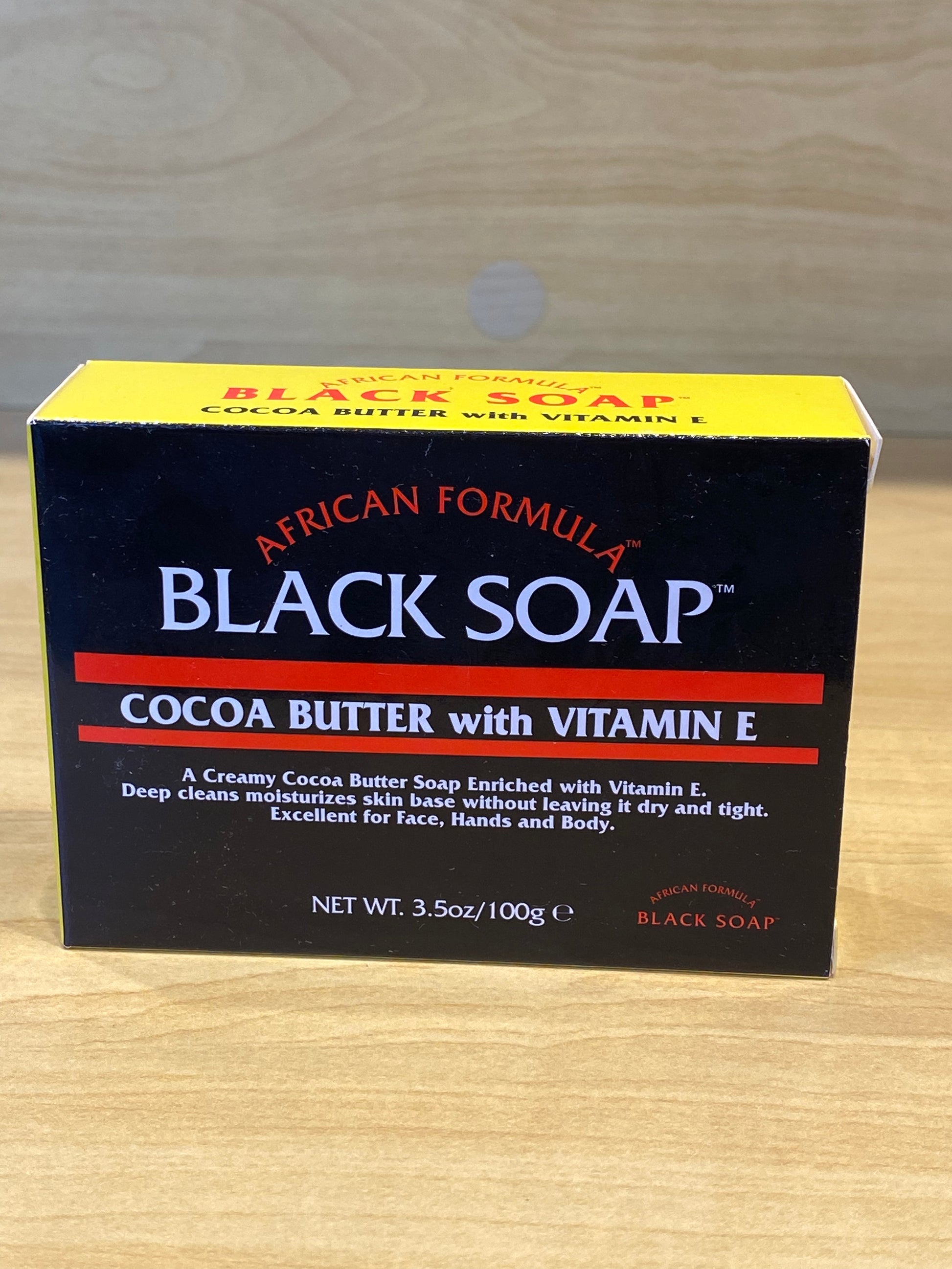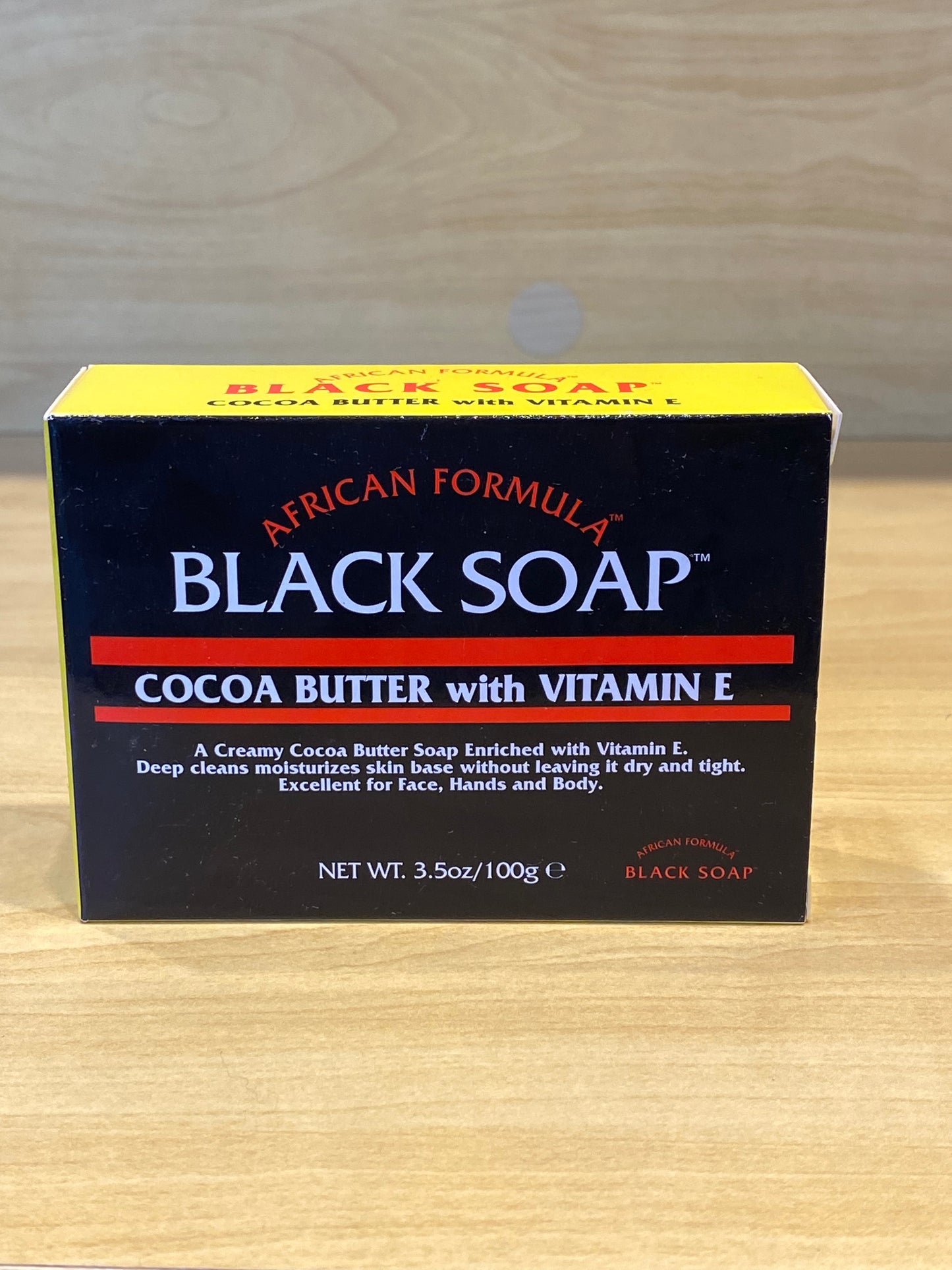 African Formula Black Soap enriched with cocoa butter and vitamin E is a natural moisturizer suitable for all skin types.
