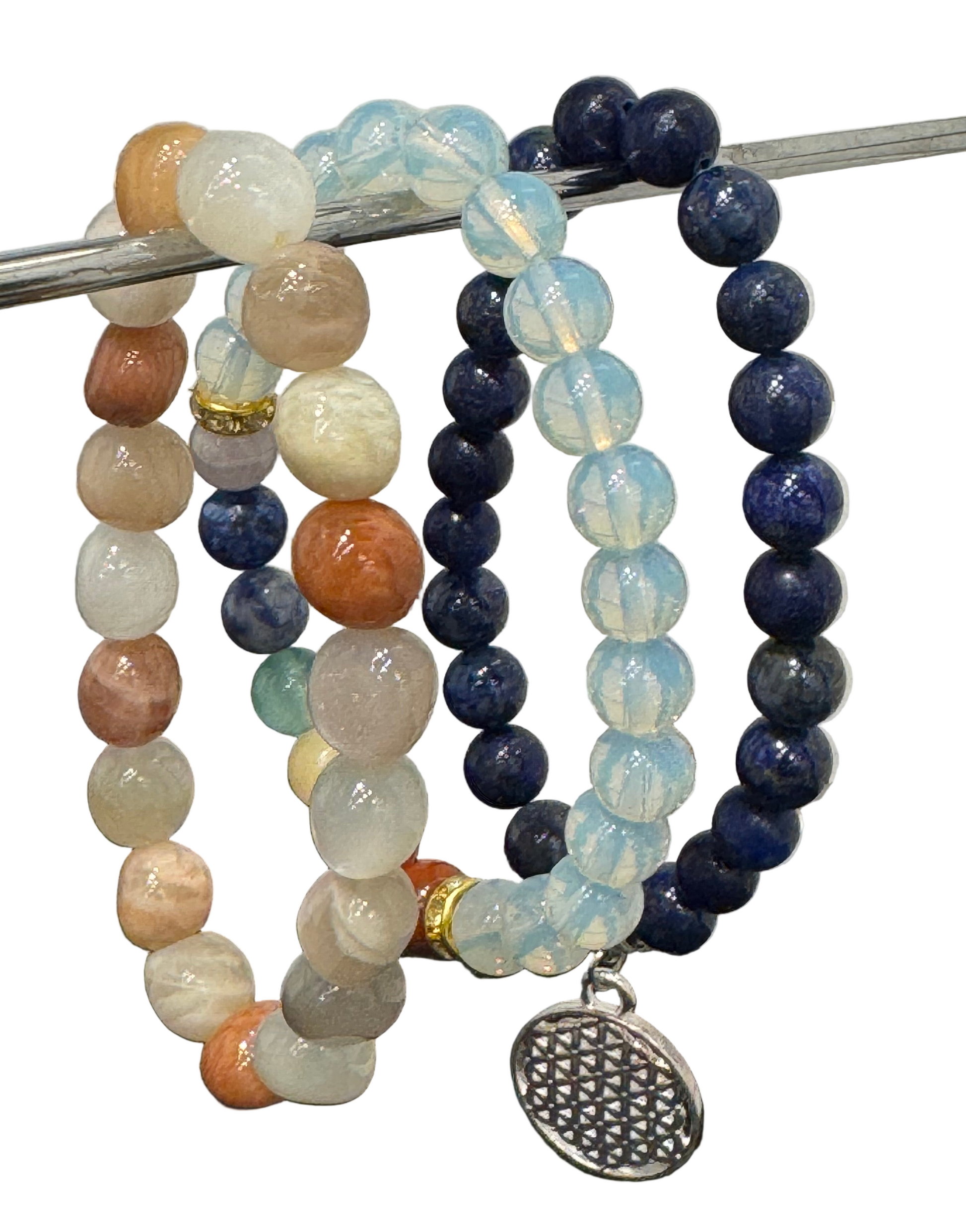 The Intuition & Inner Wisdom Bracelet Stack blends soft glows and deep tones for a serene and thoughtful trio. This gemstone bracelet stack features a Moonstone Bracelet, a Lapis Lazuli with Flower of Life Charm Bracelet, and an Opalite Chakra Bracelet arranged to create a luminous, balanced style. The Intuition & Inner Wisdom Bracelet Stack brings together cool tones and mystical textures that feel timeless.