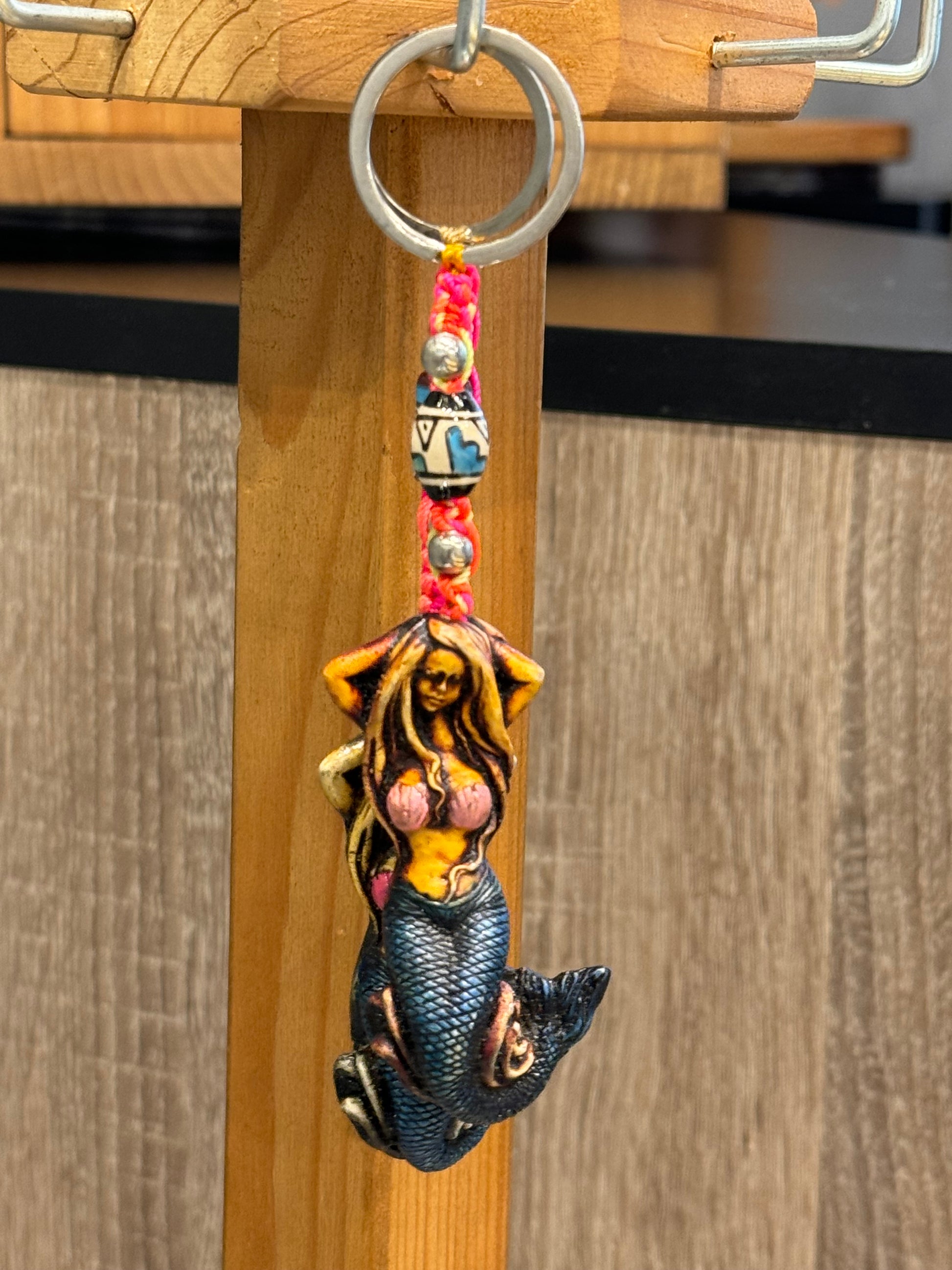 Handcrafted durepox resin figurine keychain of a sexy mermaid with pink seashell top and blue fin. Braided macramé, large bead, and metal keyring attached. Link keychain to your keys, wallet, backpack, or purse!