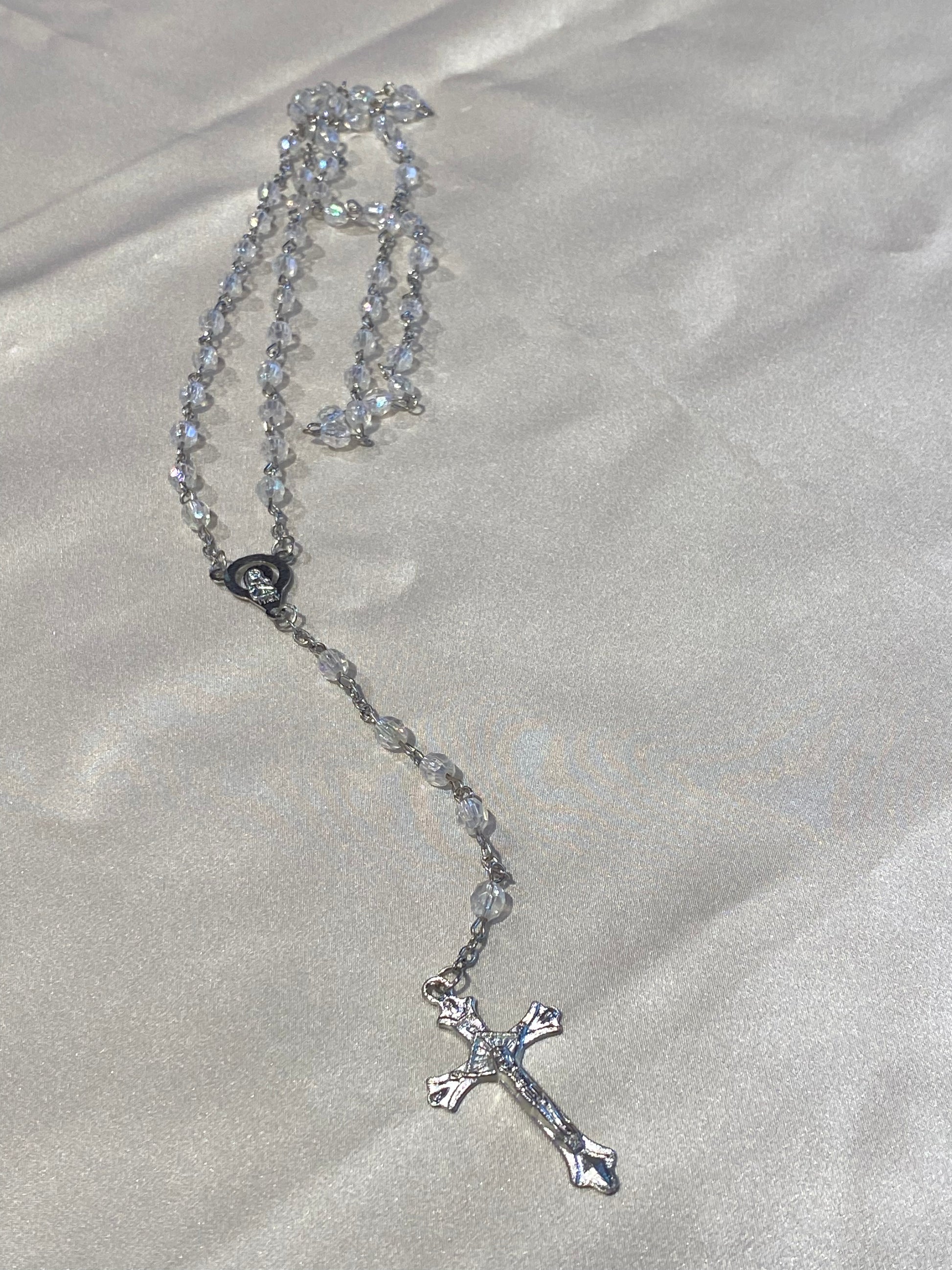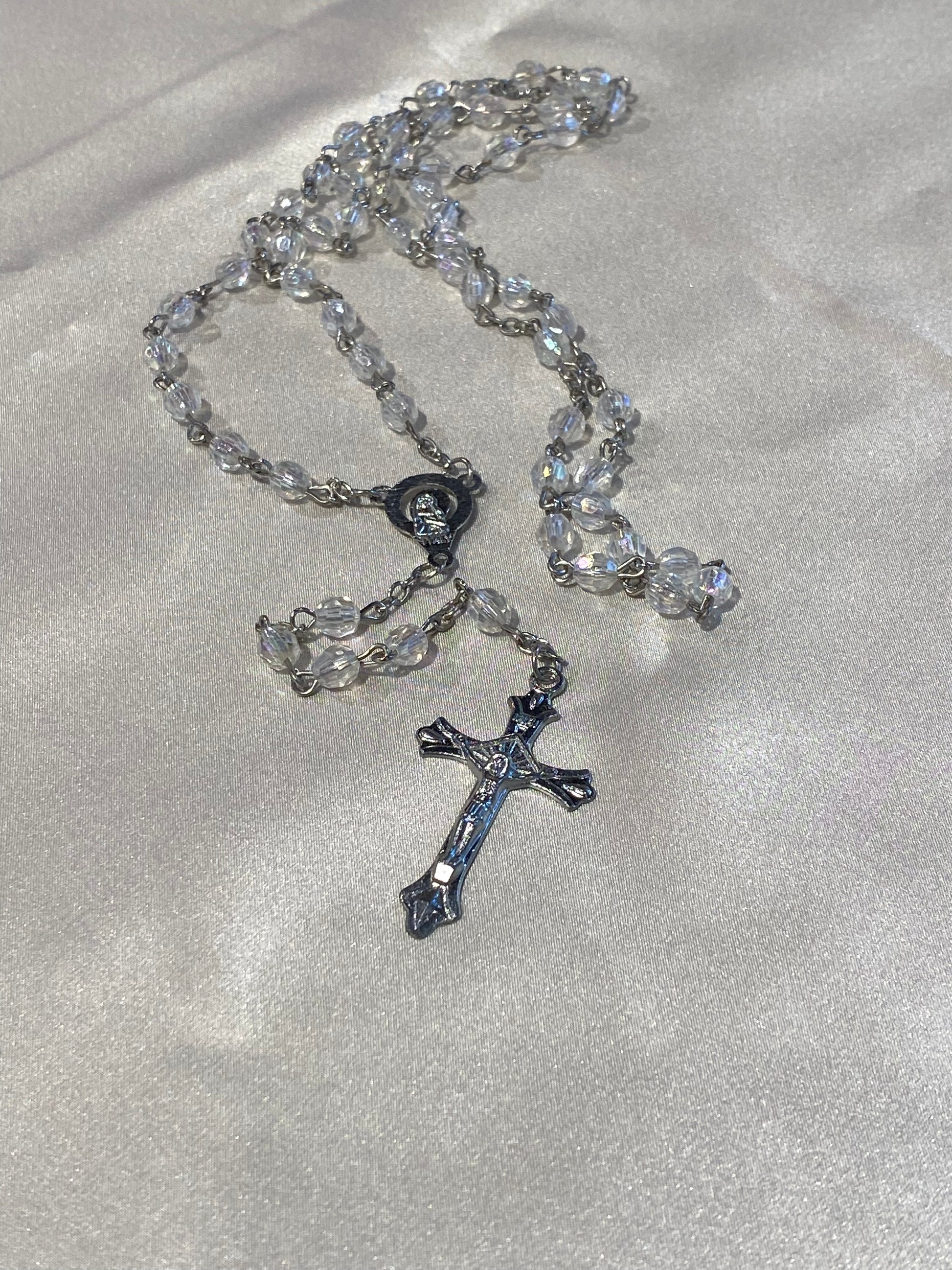 Mi Primero Communion Clear Glass Beaded Rosary Jesus Christ On Cross Silver Amulet