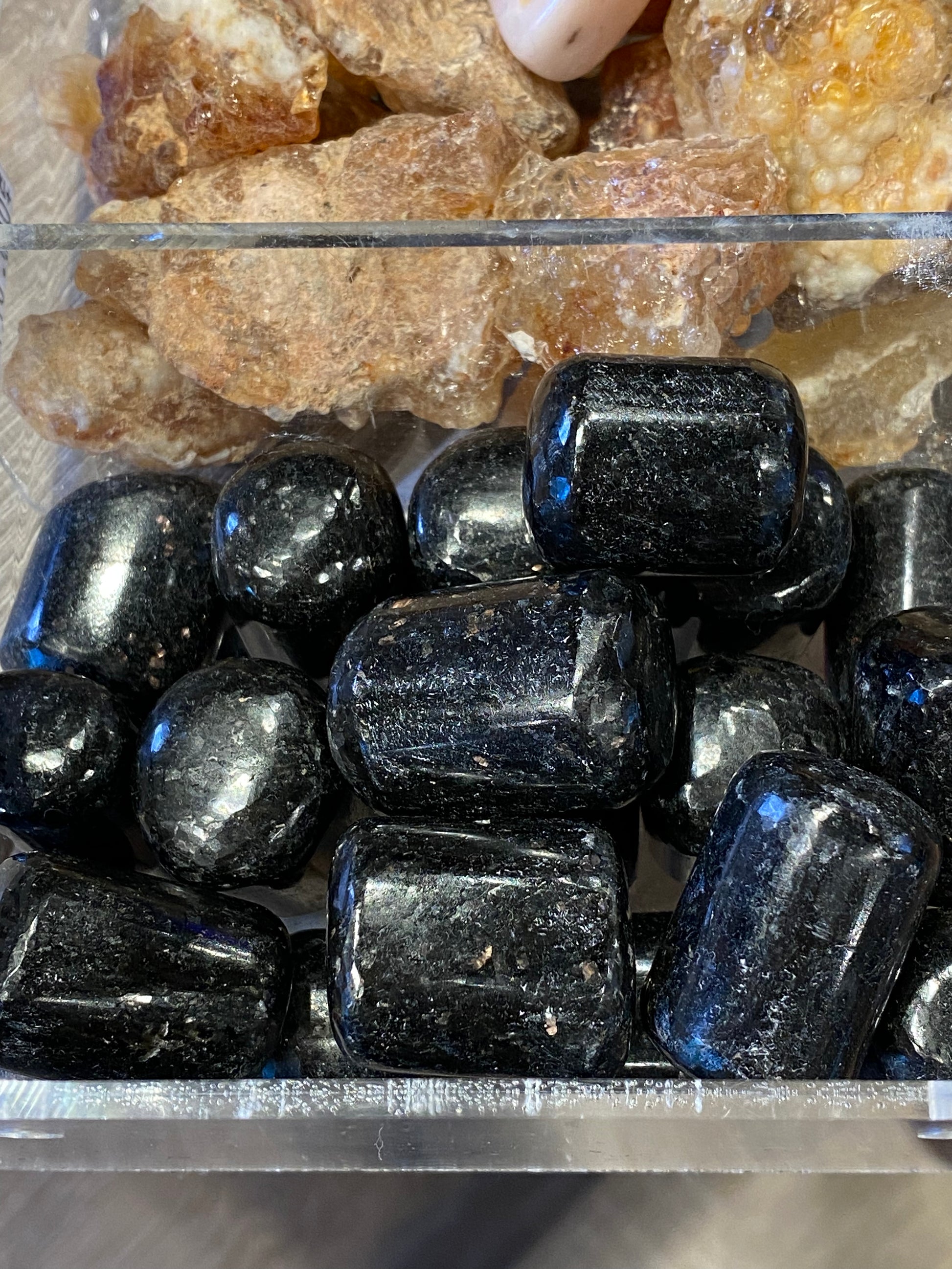 Nuummite Bullet Tumbled works towards bridging the spiritual and physical realms together, providing a channel for higher knowledge and transformative energy to grow.