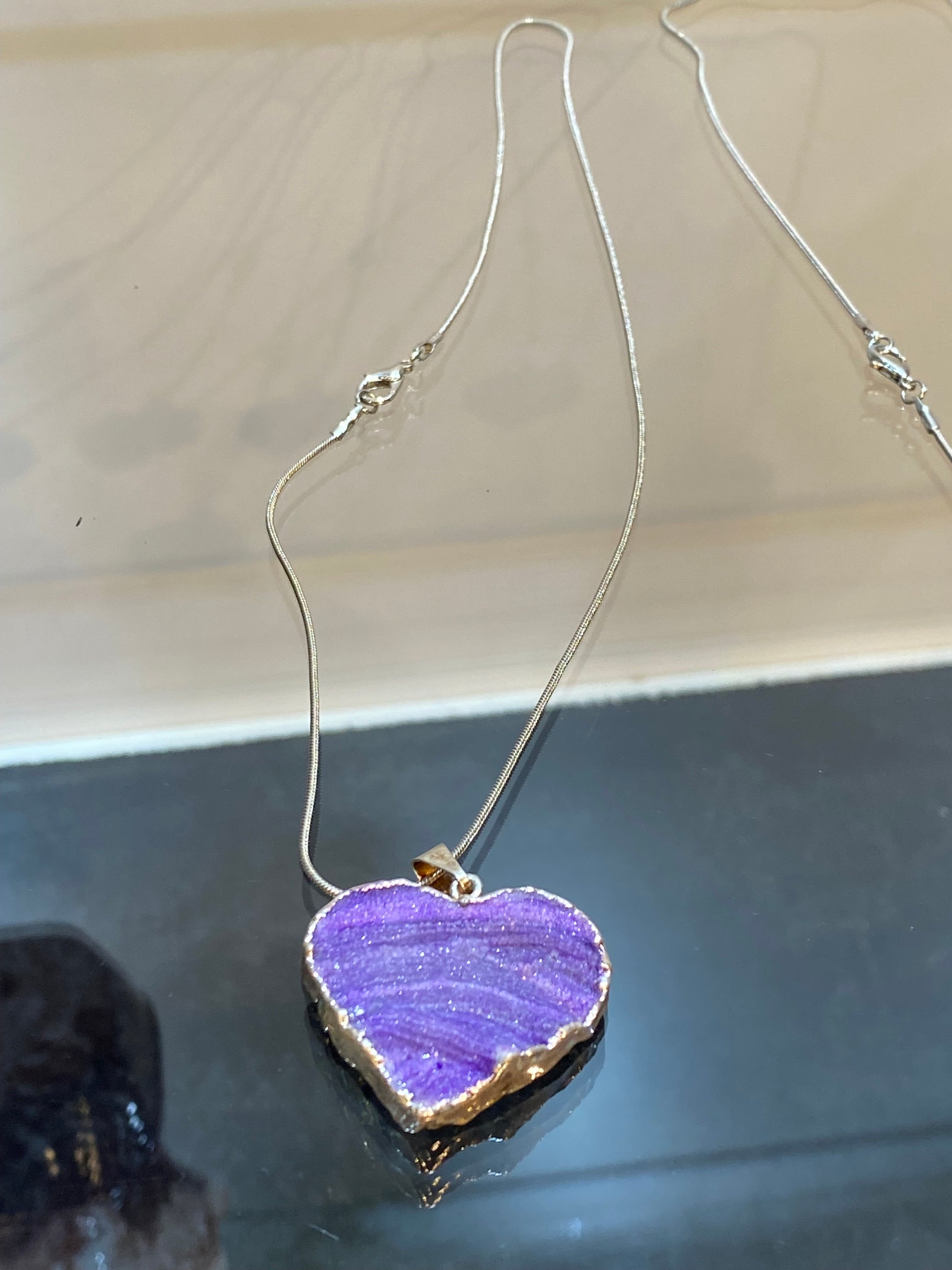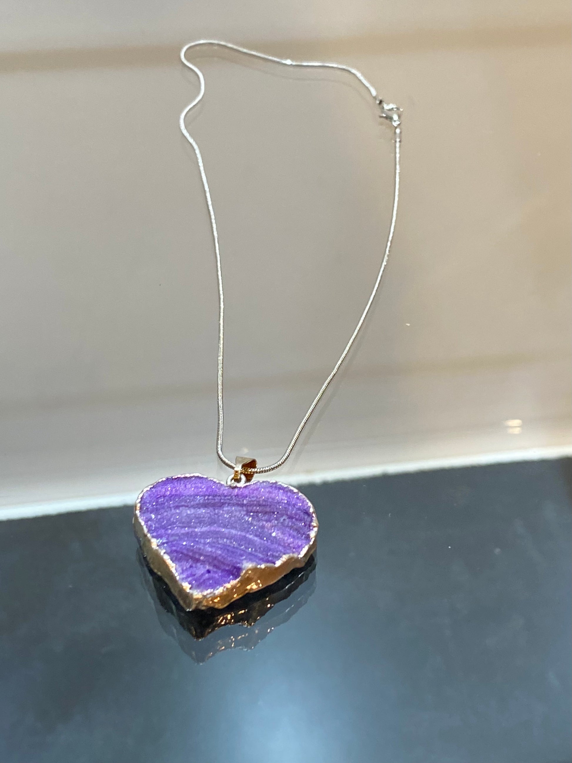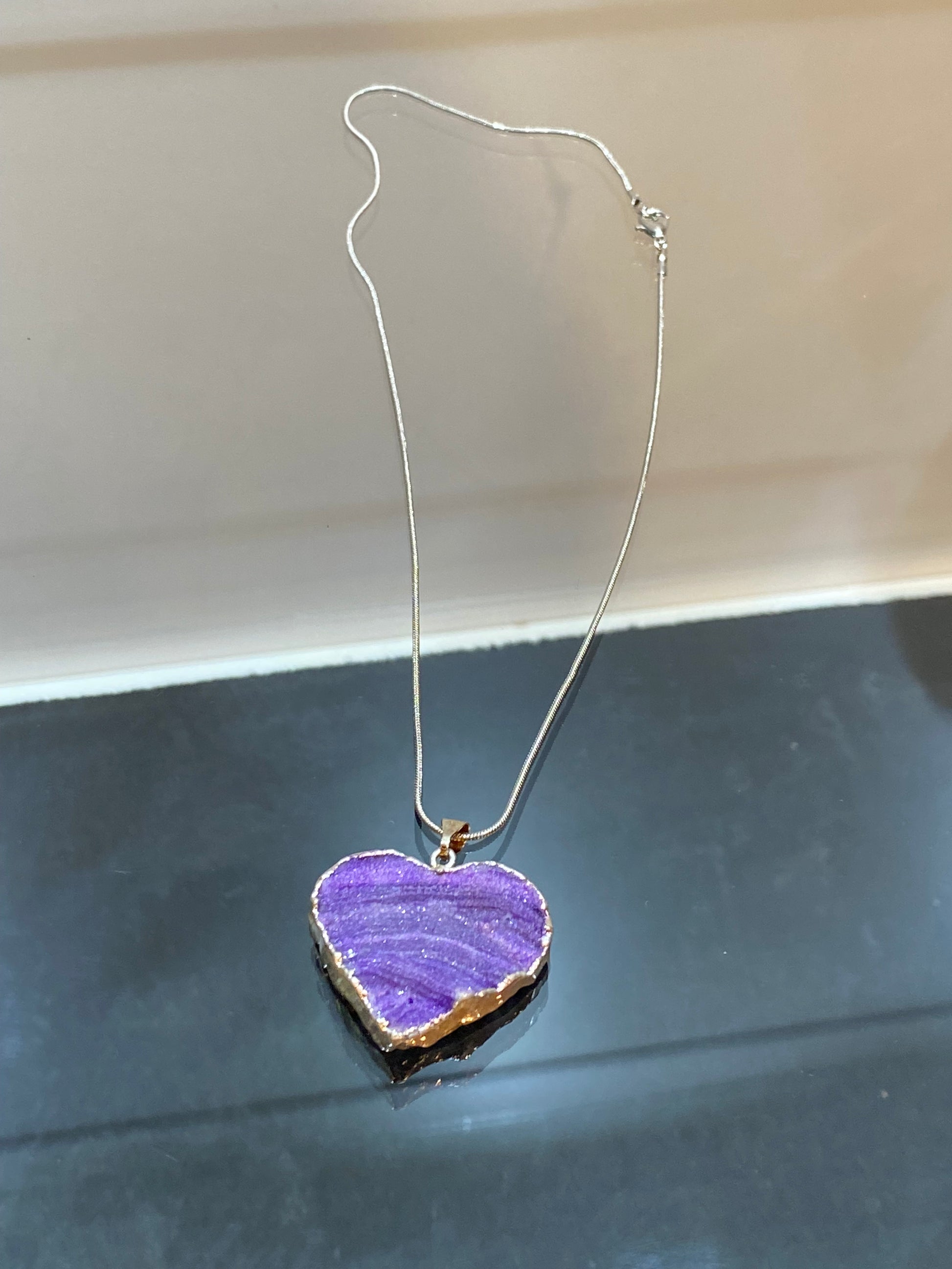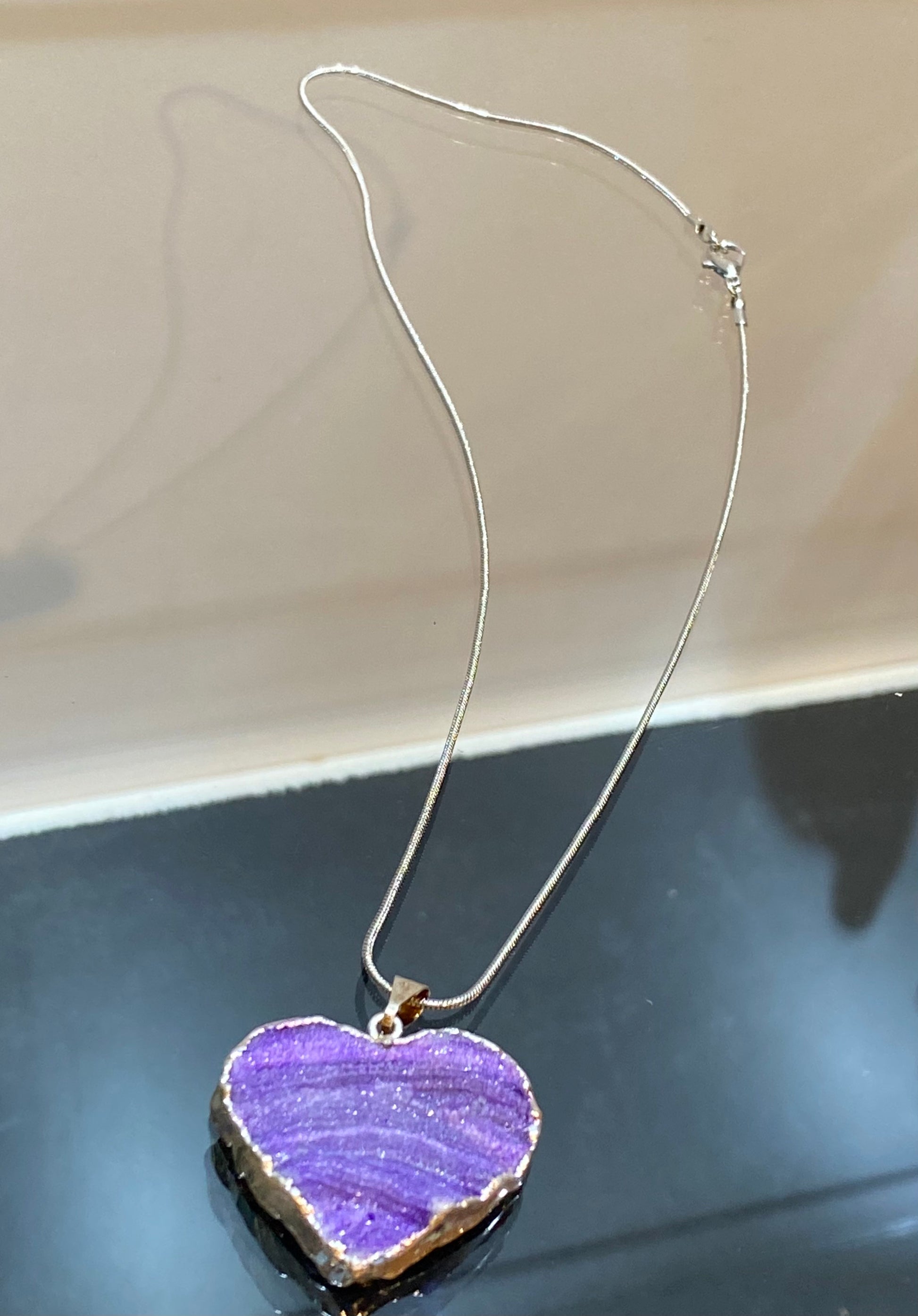 Purple Banded Agate Stone Silver Heart Pendant with Silver Plated Necklace