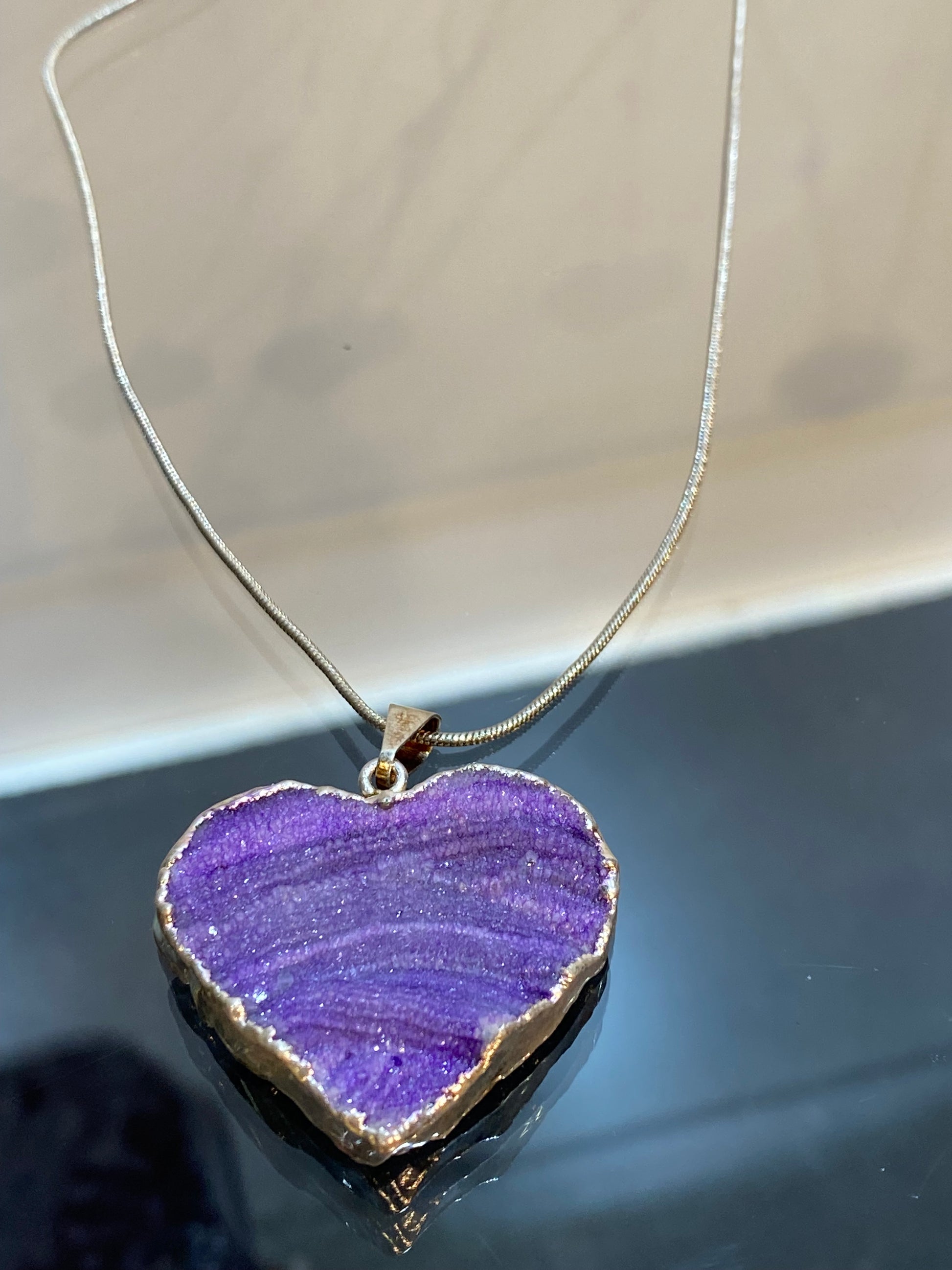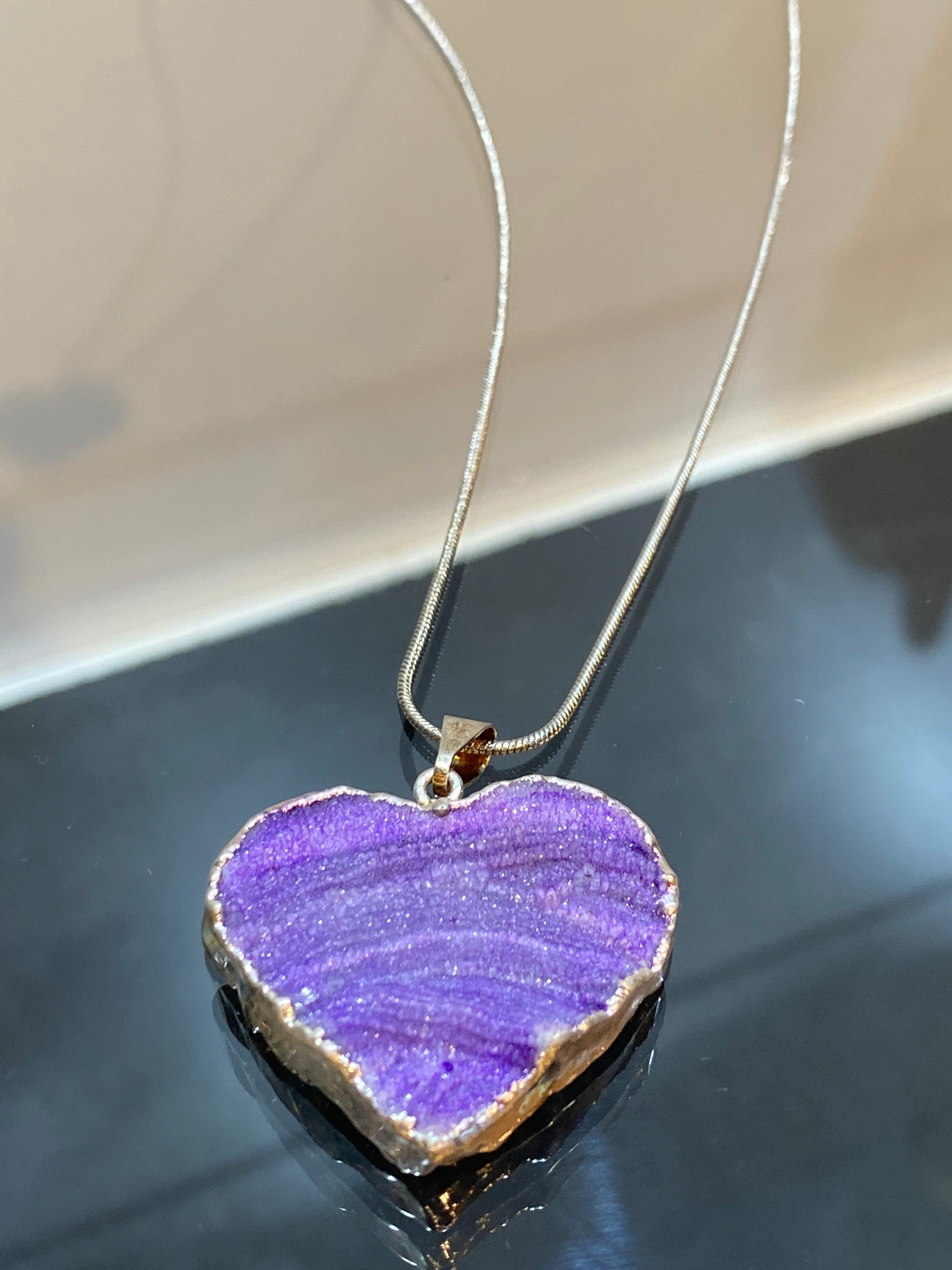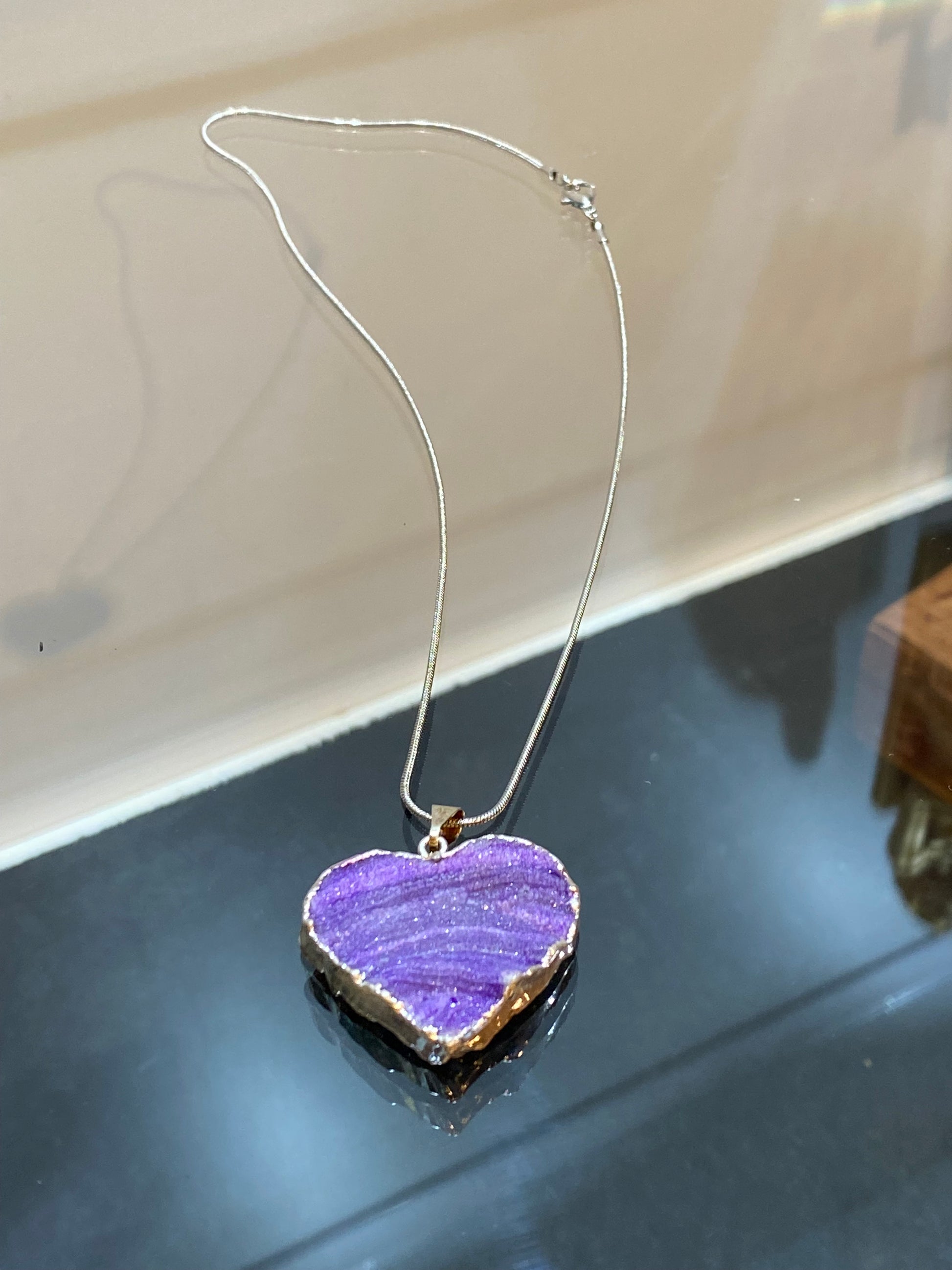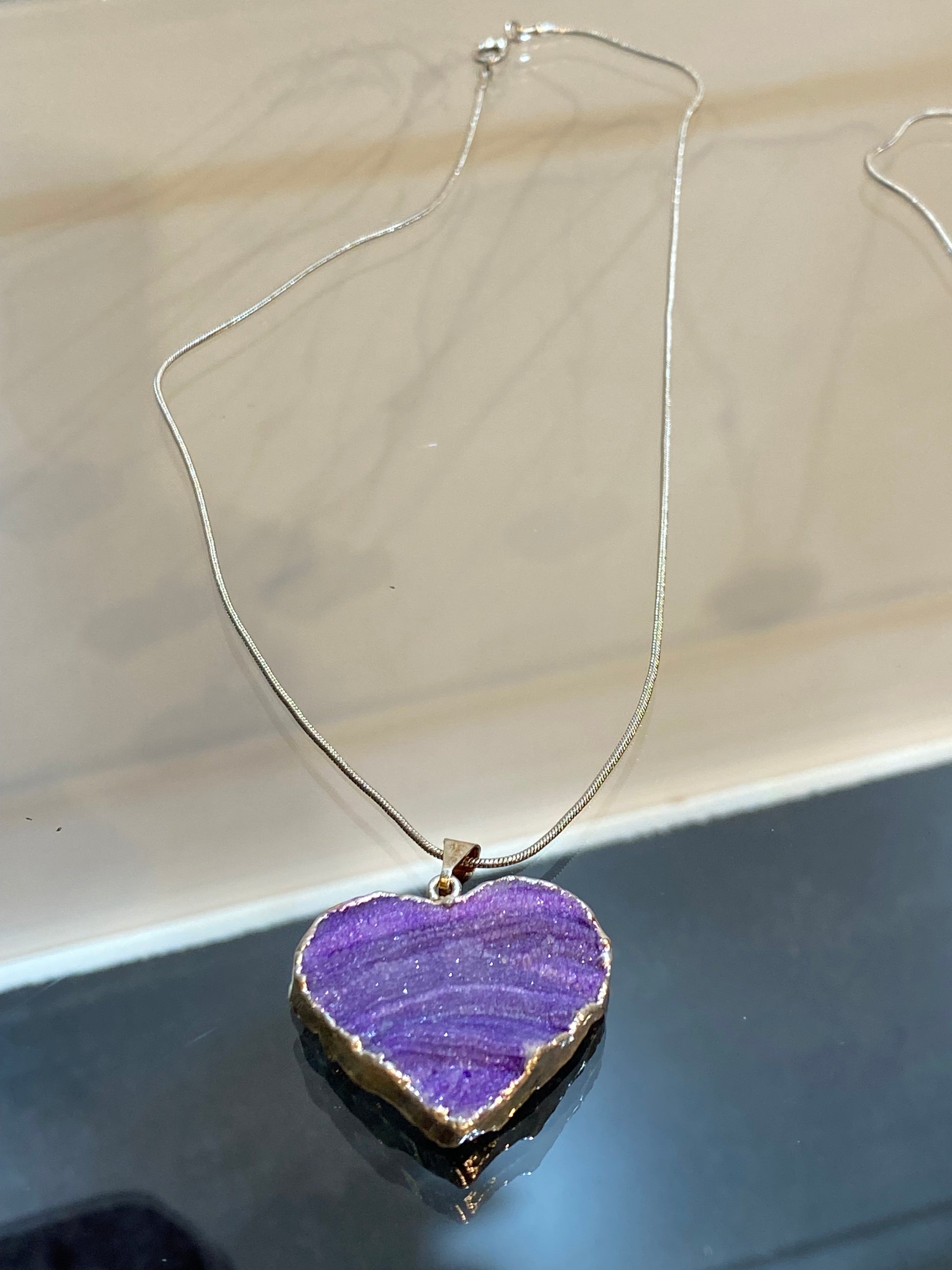 Purple Banded Agate Stone Silver Heart Pendant with Silver Plated Necklace