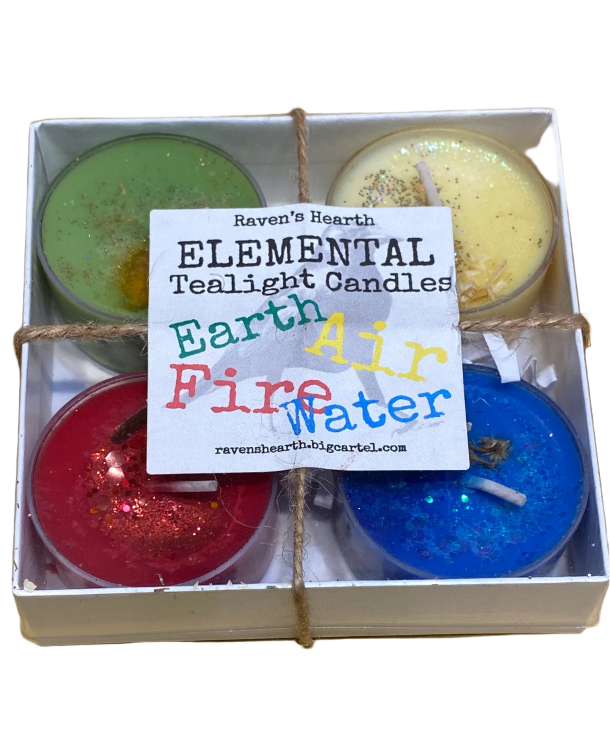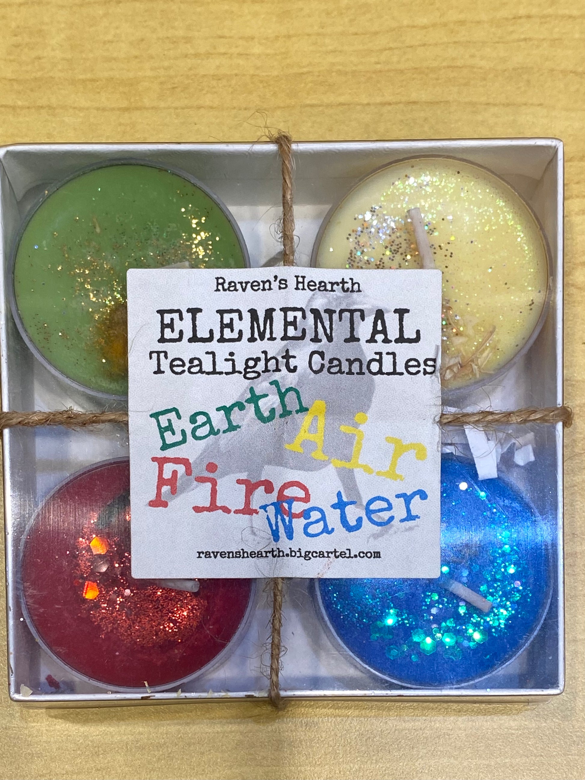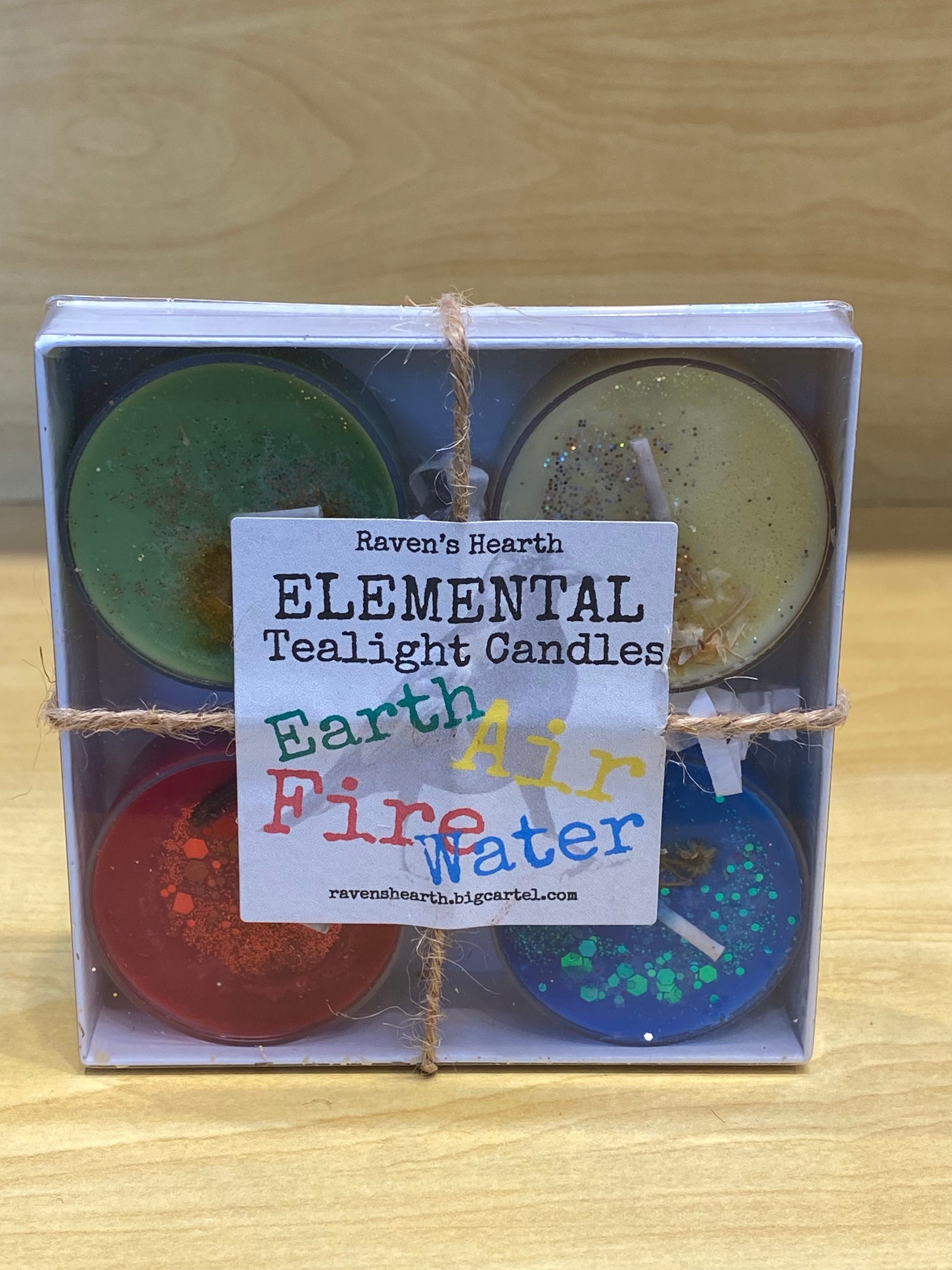 Each set contains 4 candles — one for each element/direction. EARTH/GREEN: patchouli and turmeric ...root chakra/grounding AIR/YELLOW: lavender and peppermint ... heart chakra/communication FIRE/RED: rosewood and clove ... solar plexus chakra/courage/passion WATER/BLUE: ylang ylang and chamomile ... sacral chakra/empathy/emotion These candles are perfect for your altar, or just to use for specific intentions, or overall good vibes. Soy wax/vegan Contains 4 candles Altar, candles, ritual, soy candles, Tealights, meditation, spiritual, spa, handmade, woman owned, small batch. By Raven's Hearth