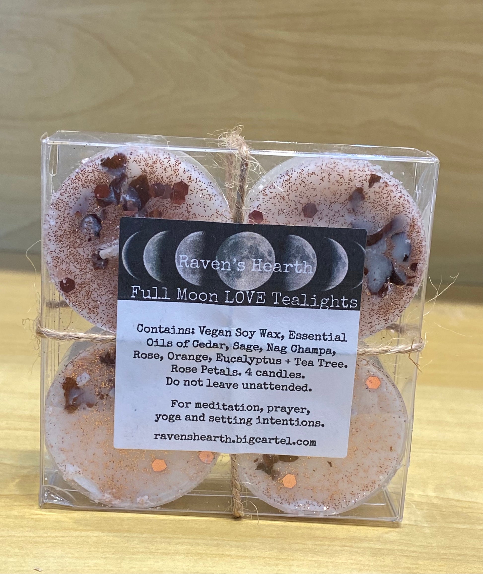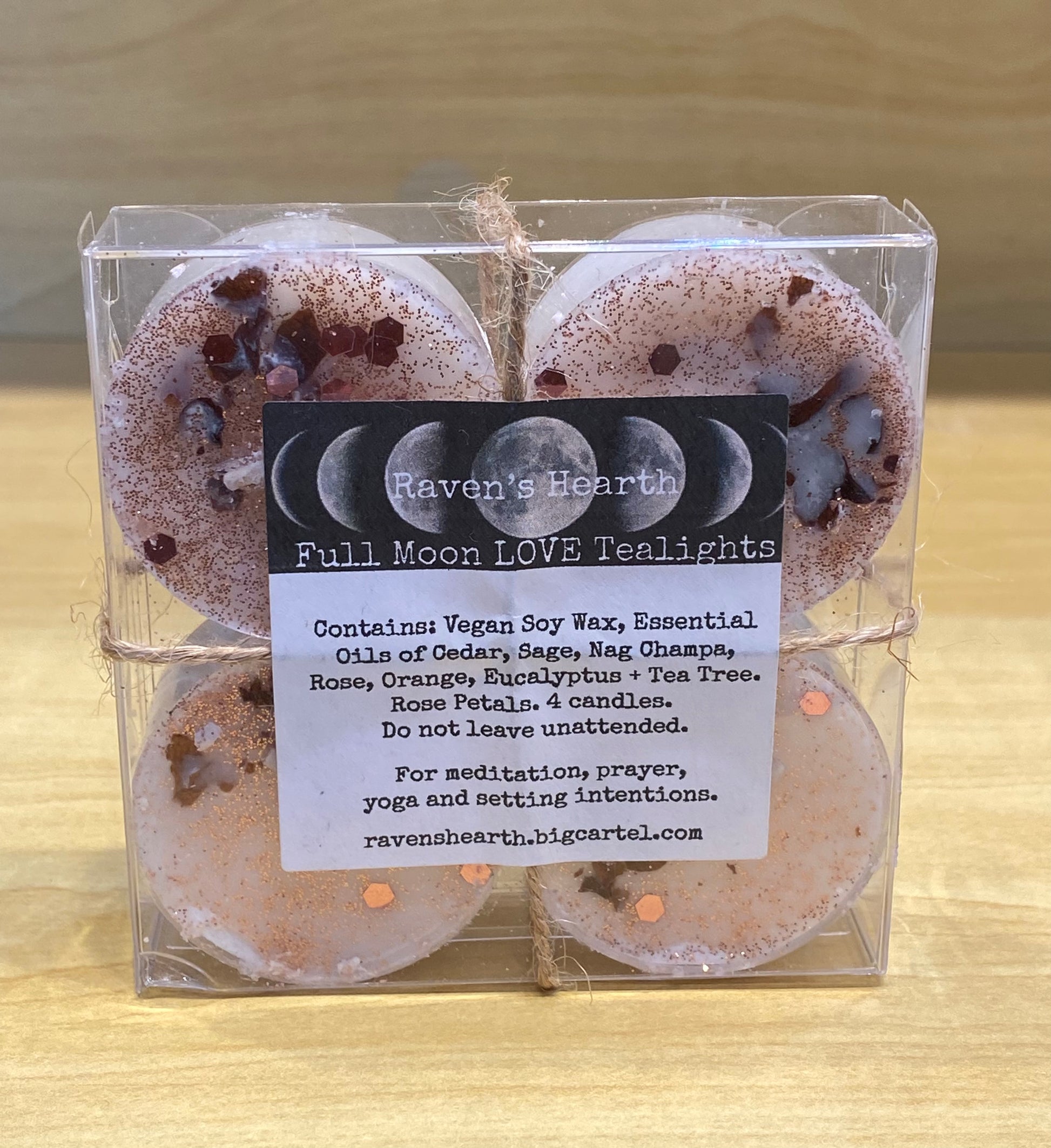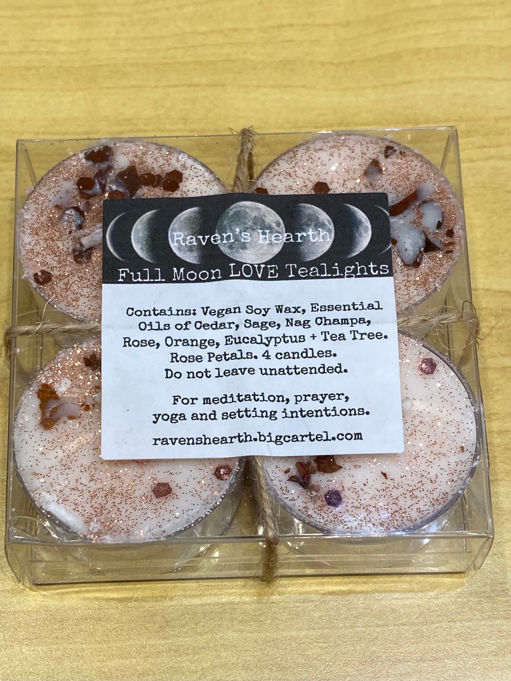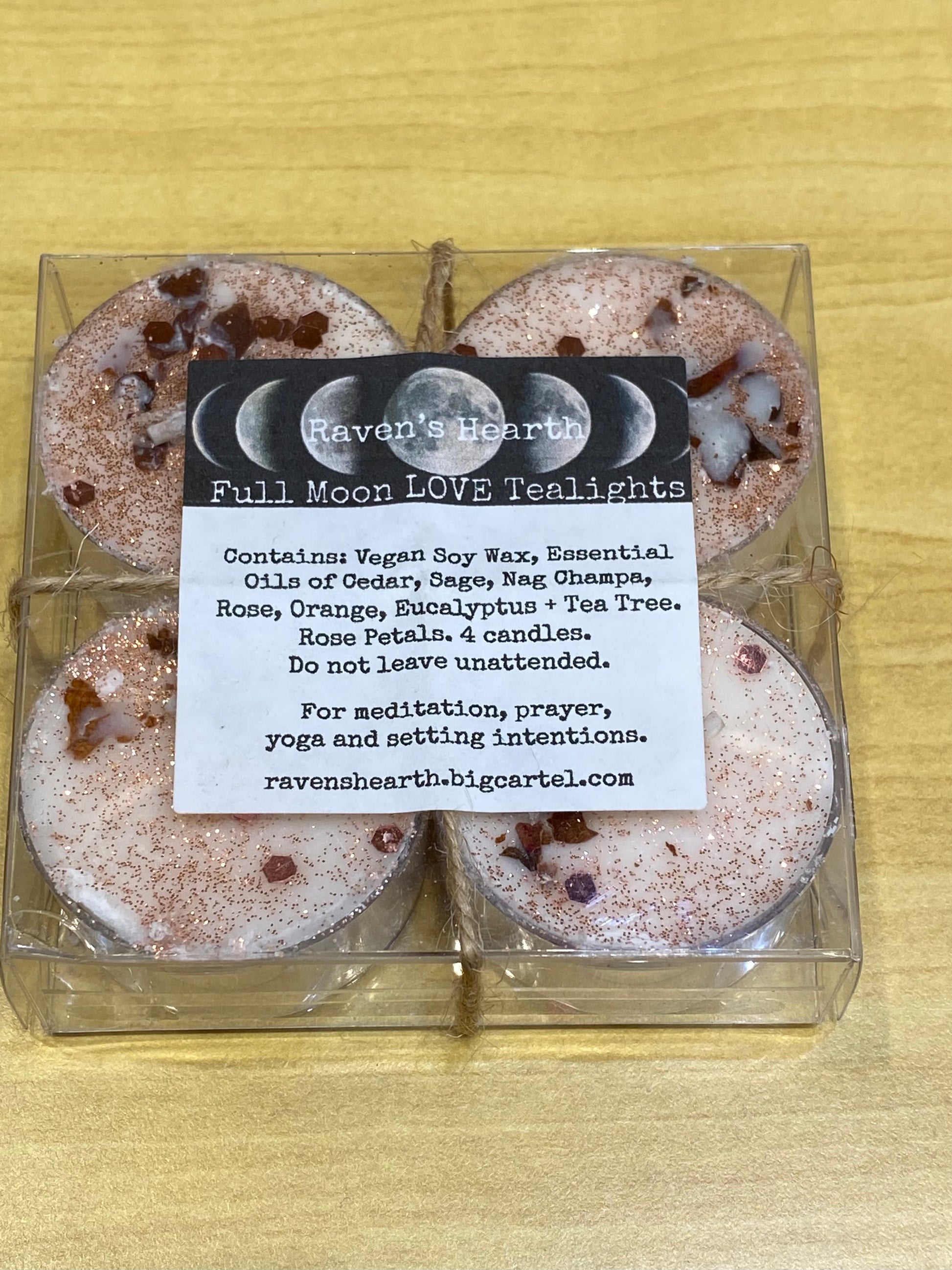 These candles are made by Raven’s Hearth with super-loving intentions for you. Each candle is hand-crafted/hand-poured using vegan soy wax, essential oils and crystals. Contains: Soy Wax, Essential Oils of Cedar, Sage, Nag Champa, Rose, Orange, Eucalyptus + Tea Tree. Rose Petals. (Set of 4) Soy Candles, Tealights, Full Moon, Manifestation, Abundance, Magic, Metaphysical, spiritual, subscription box, astrology, women owned, best seller, high sell through, hand poured