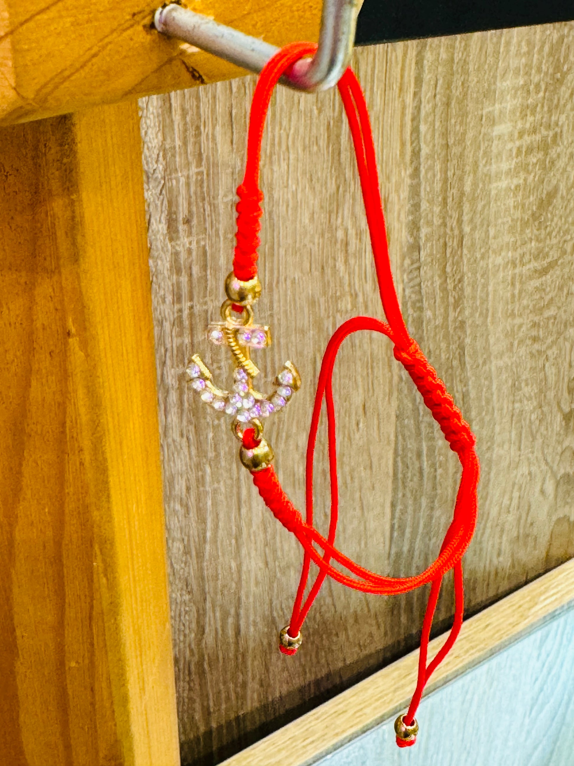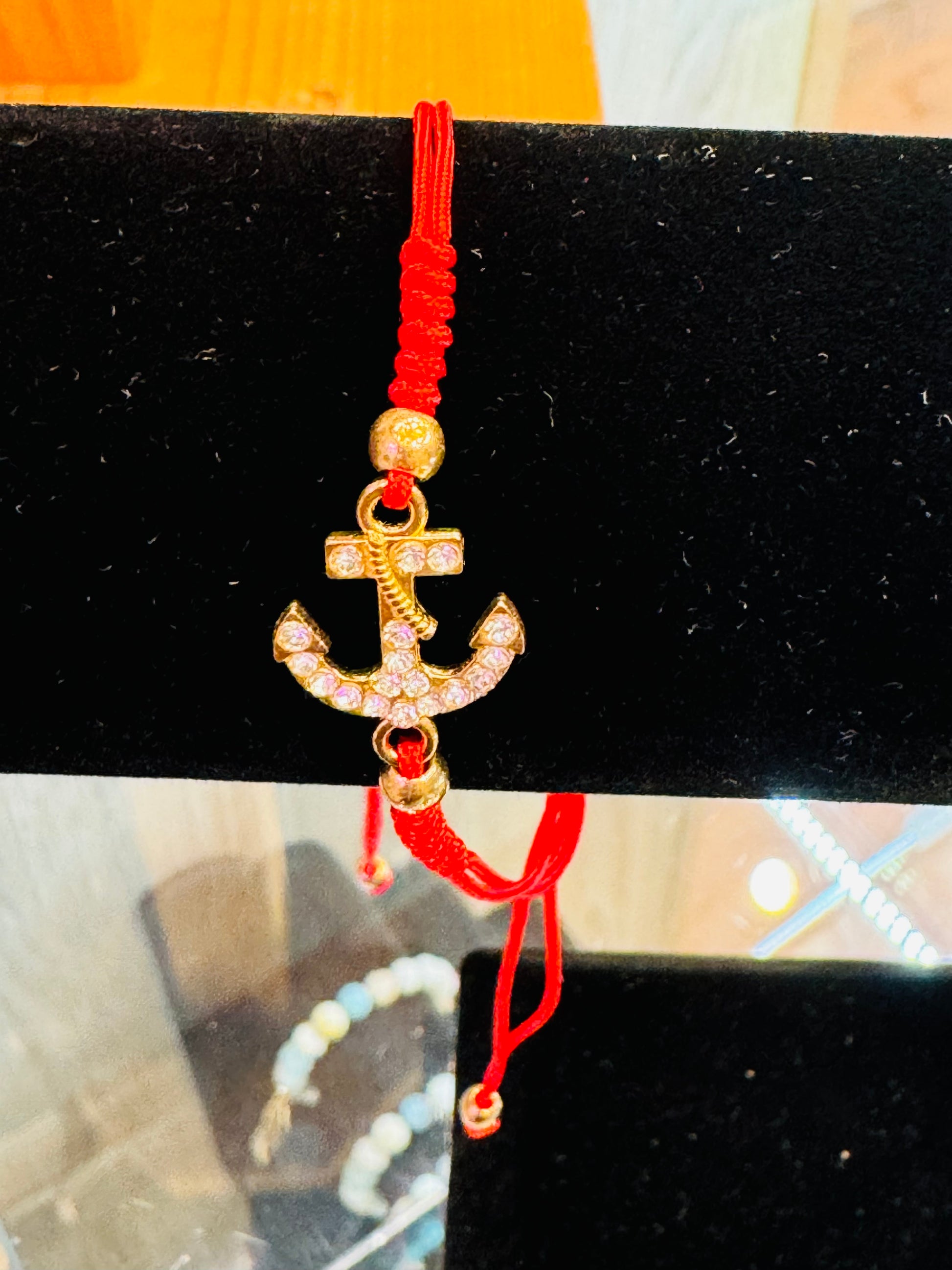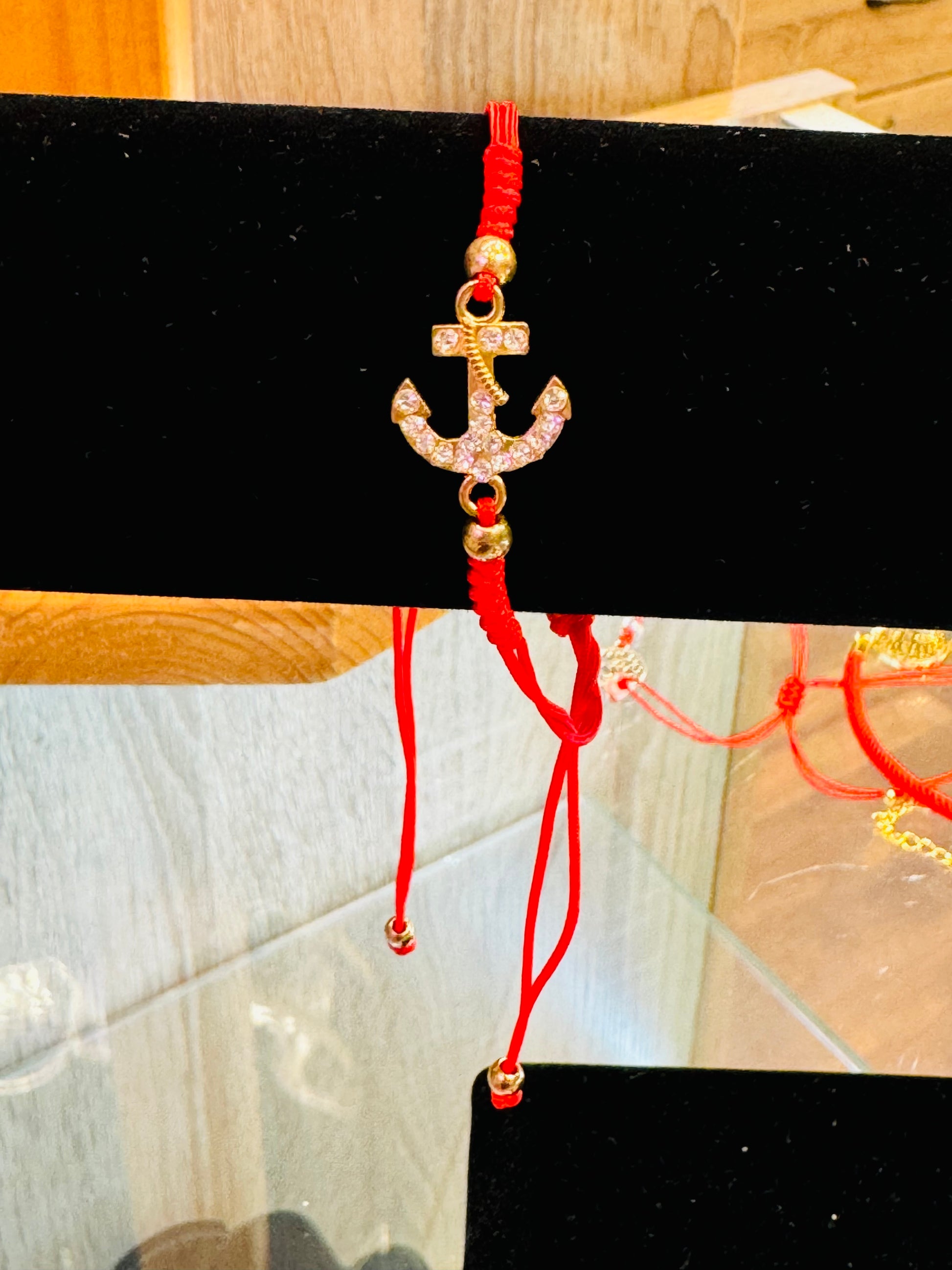Red String Pull Tie Bracelet Rhinestone Anchor Charm and Golden Beads