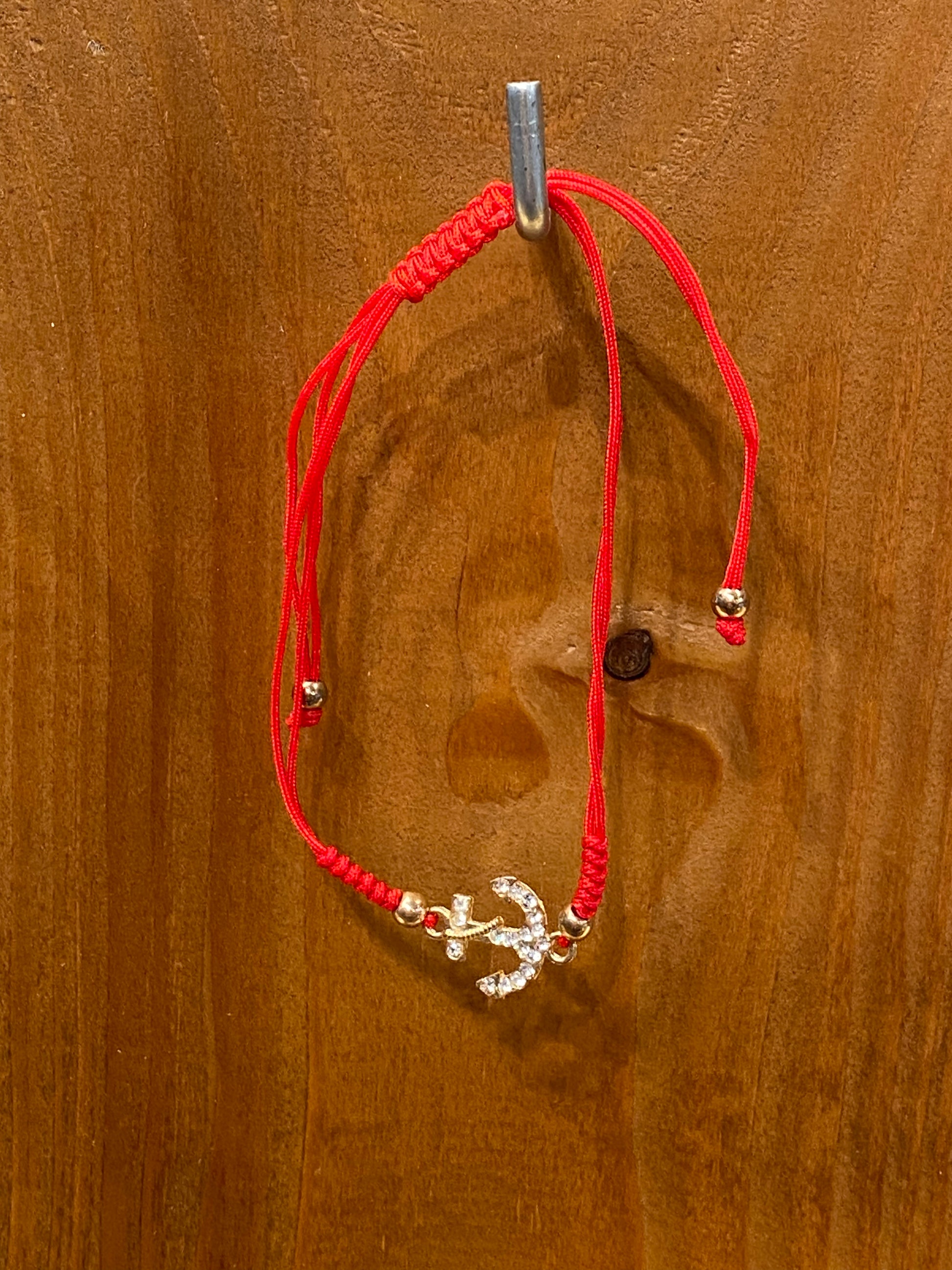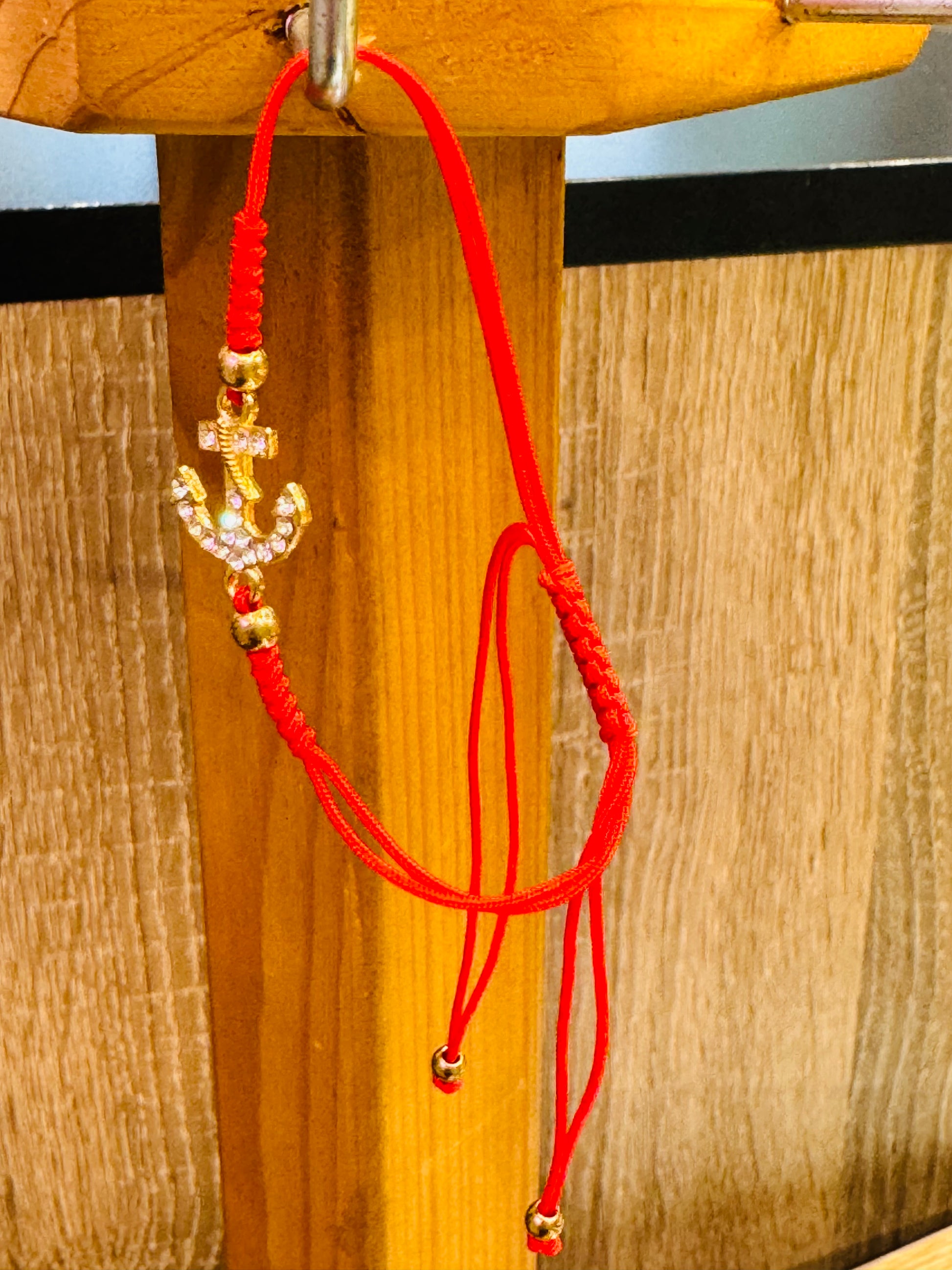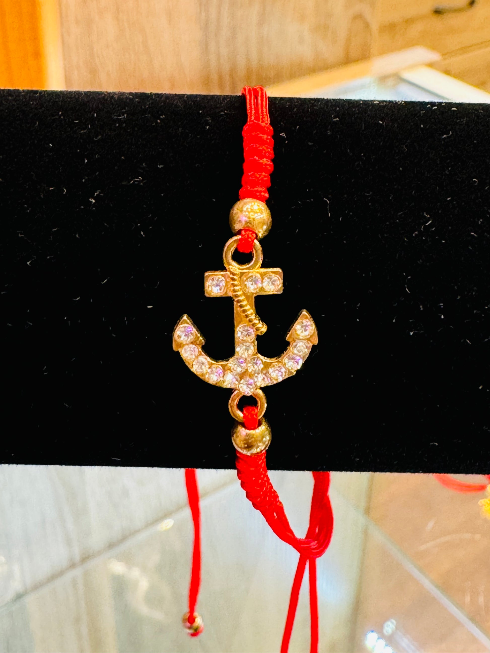 Red String Pull Tie Bracelet Rhinestone Anchor Charm and Golden Beads