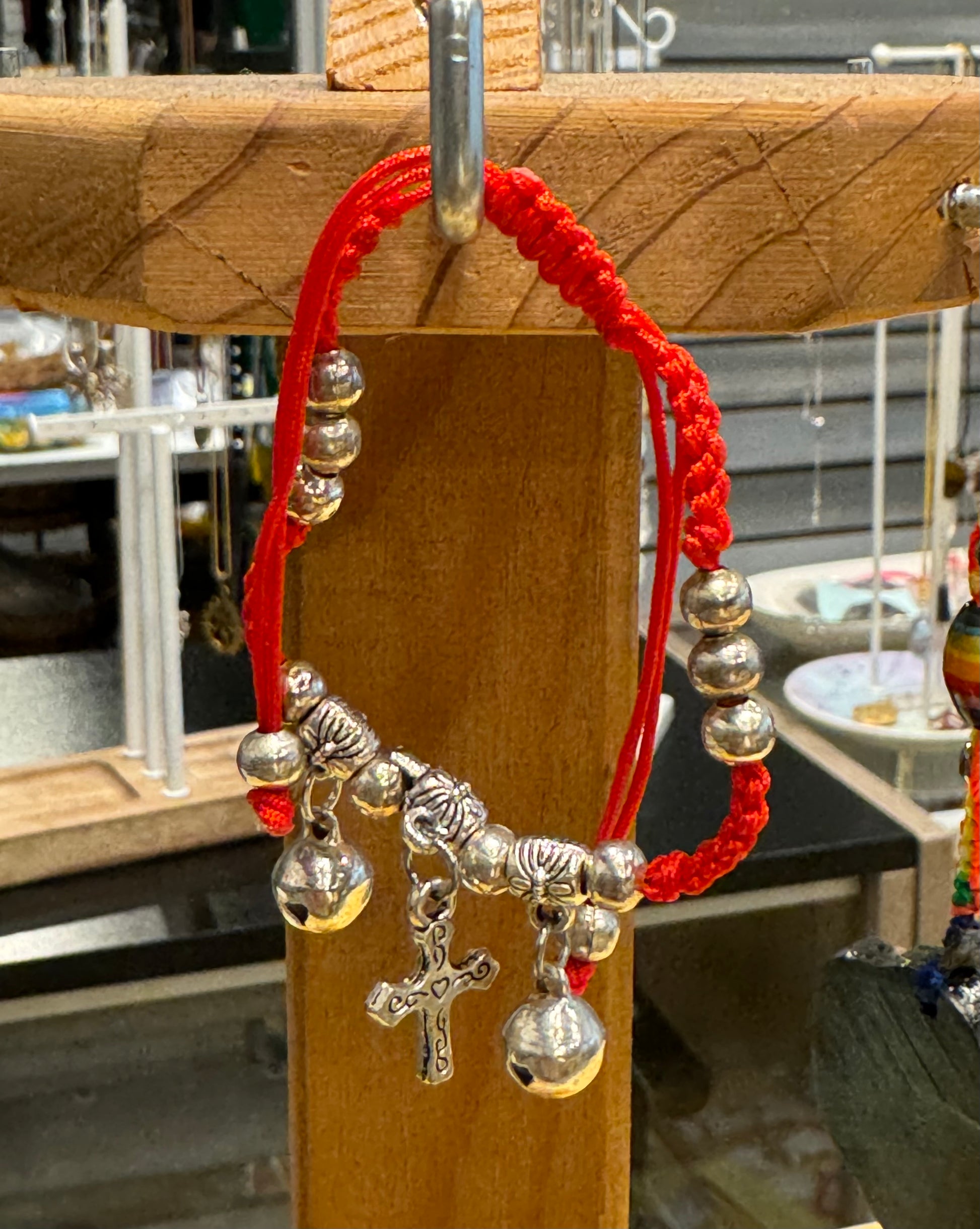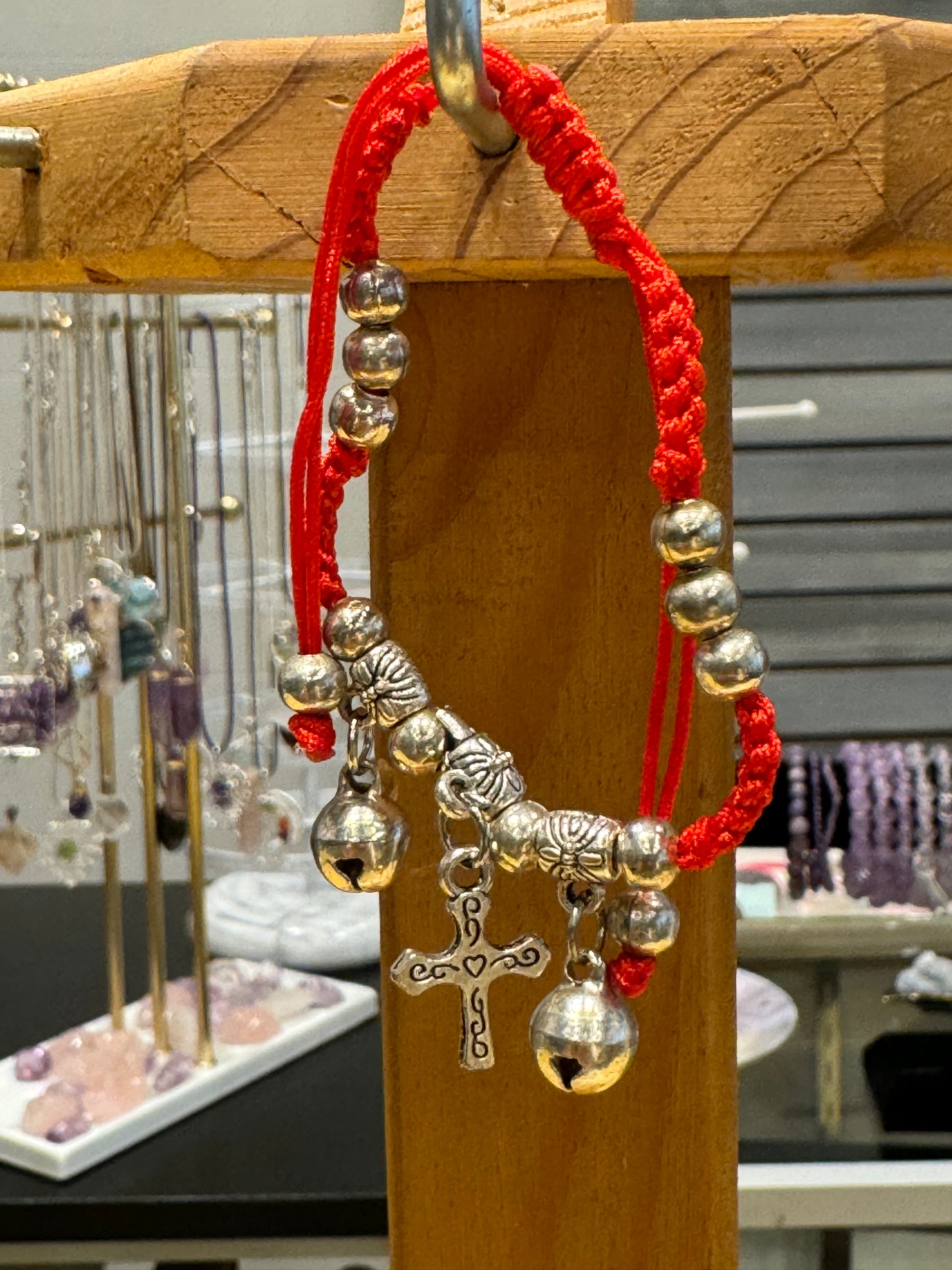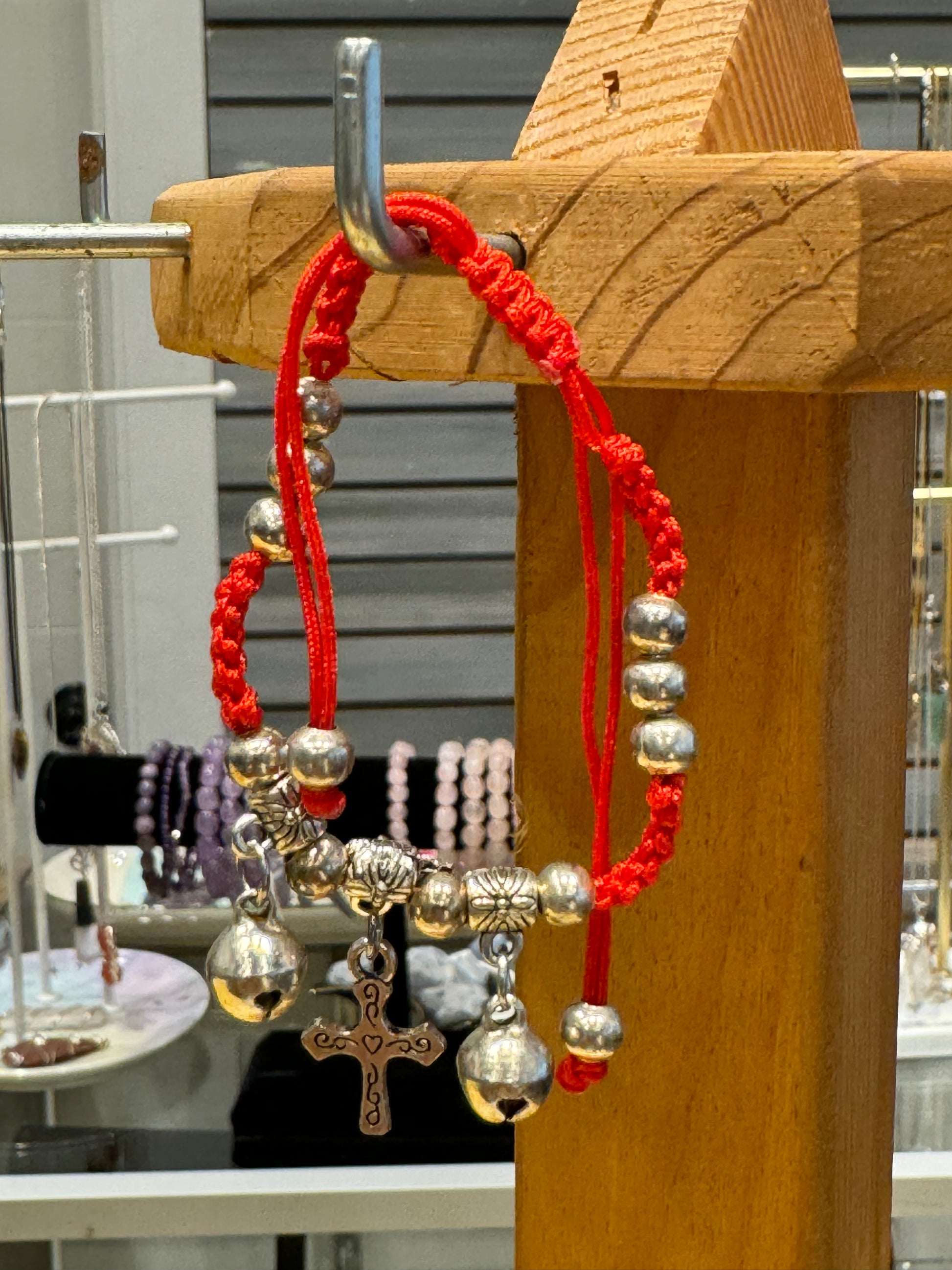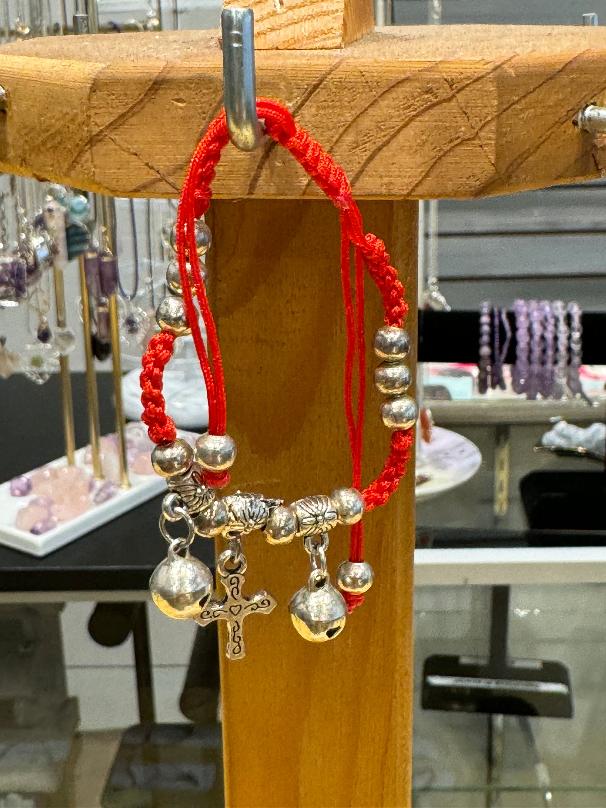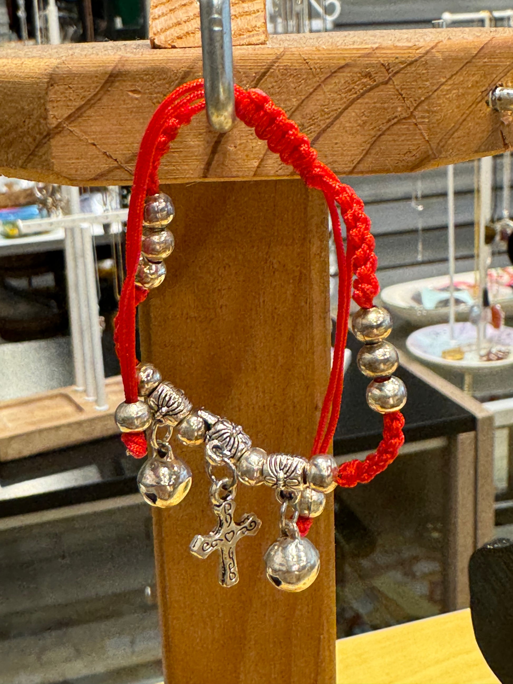 Red String Braided Pull Tie Bracelet Silver Beads, Bells and Etched Heart Cross Charm