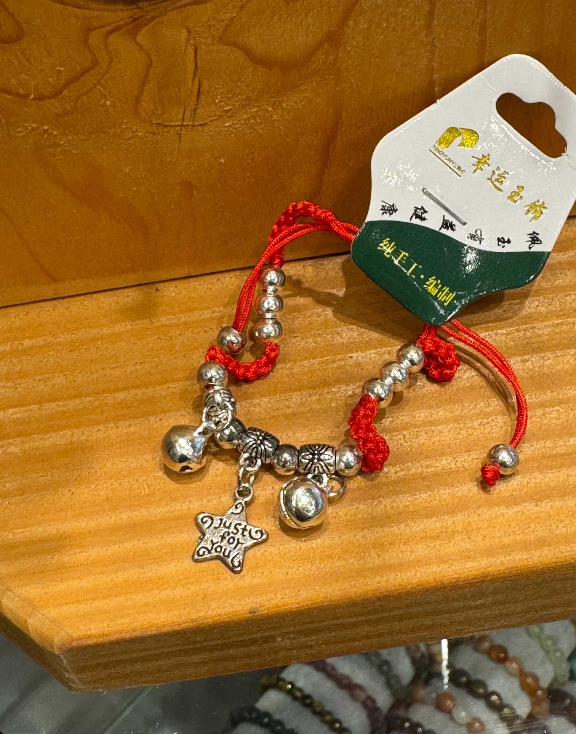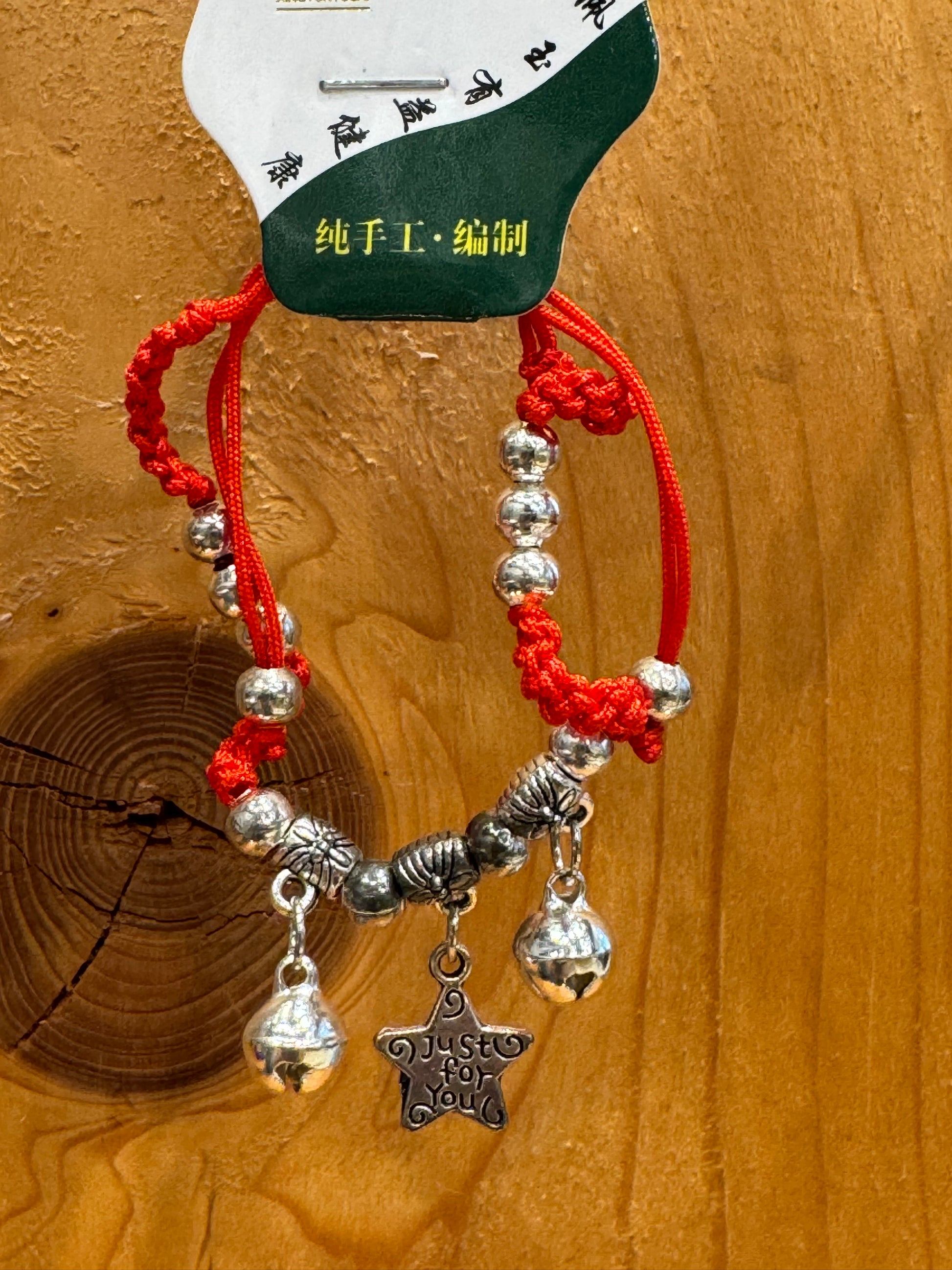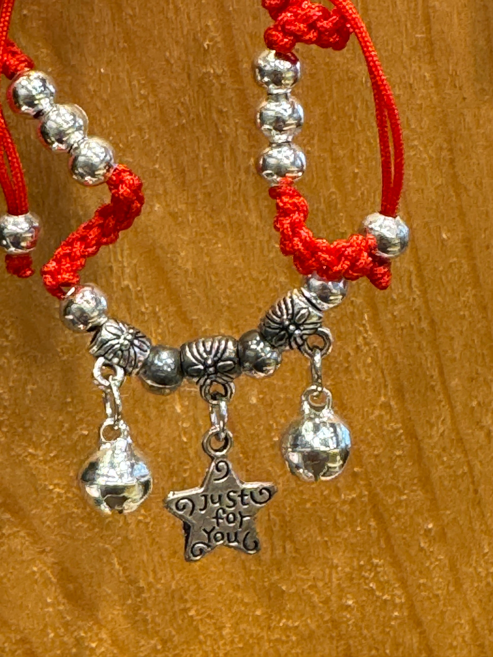 Red String Pull Tie Braided Bracelet Silver Beads,Bells and Star