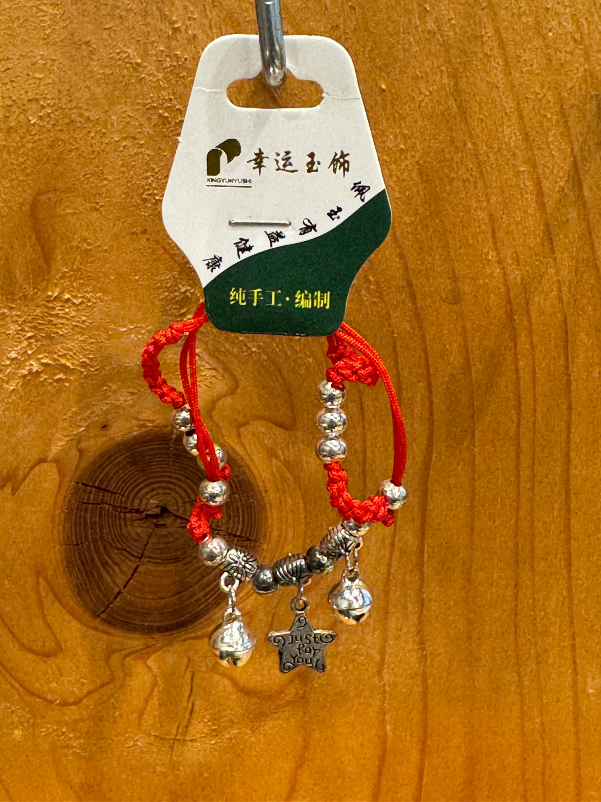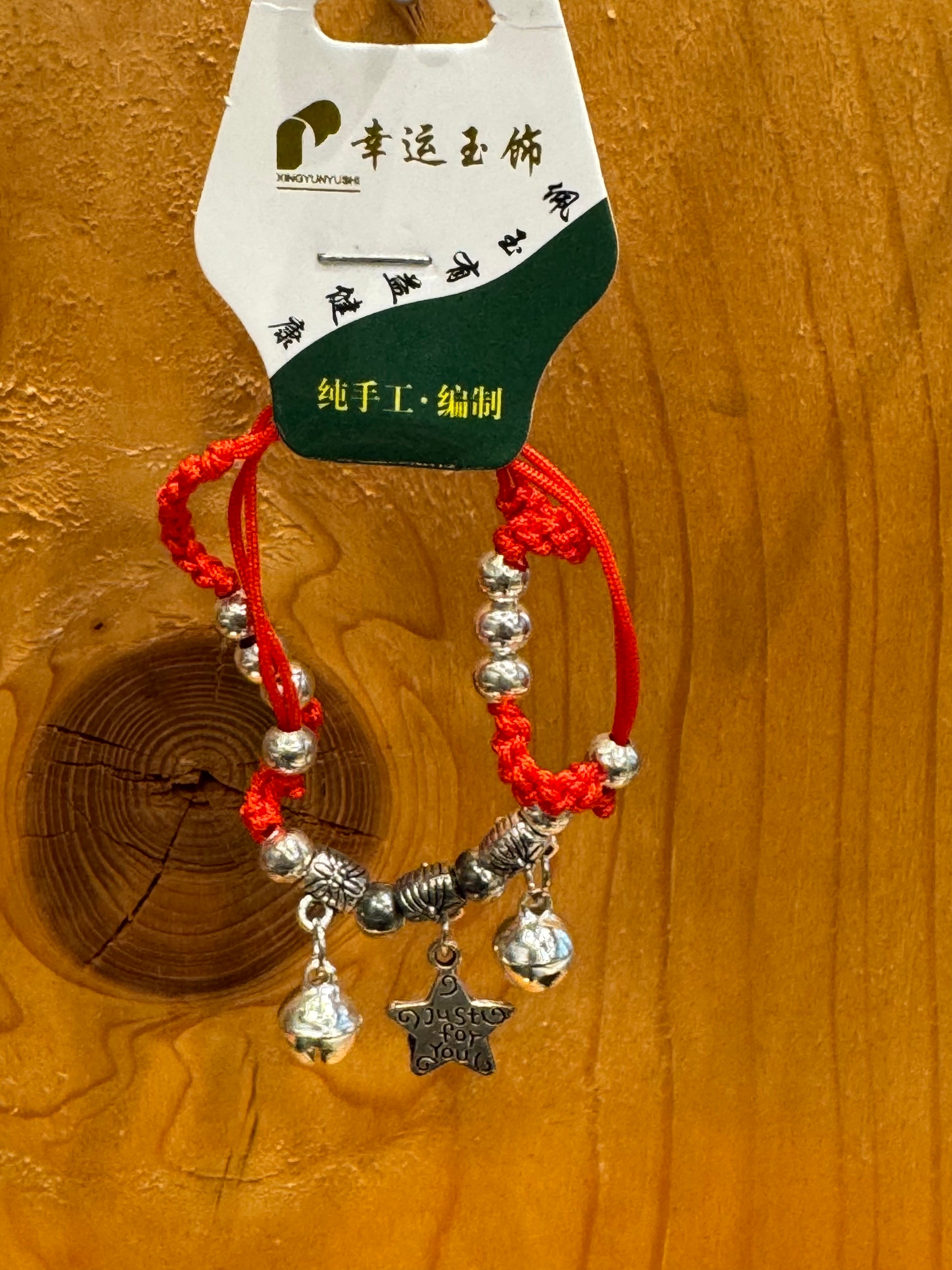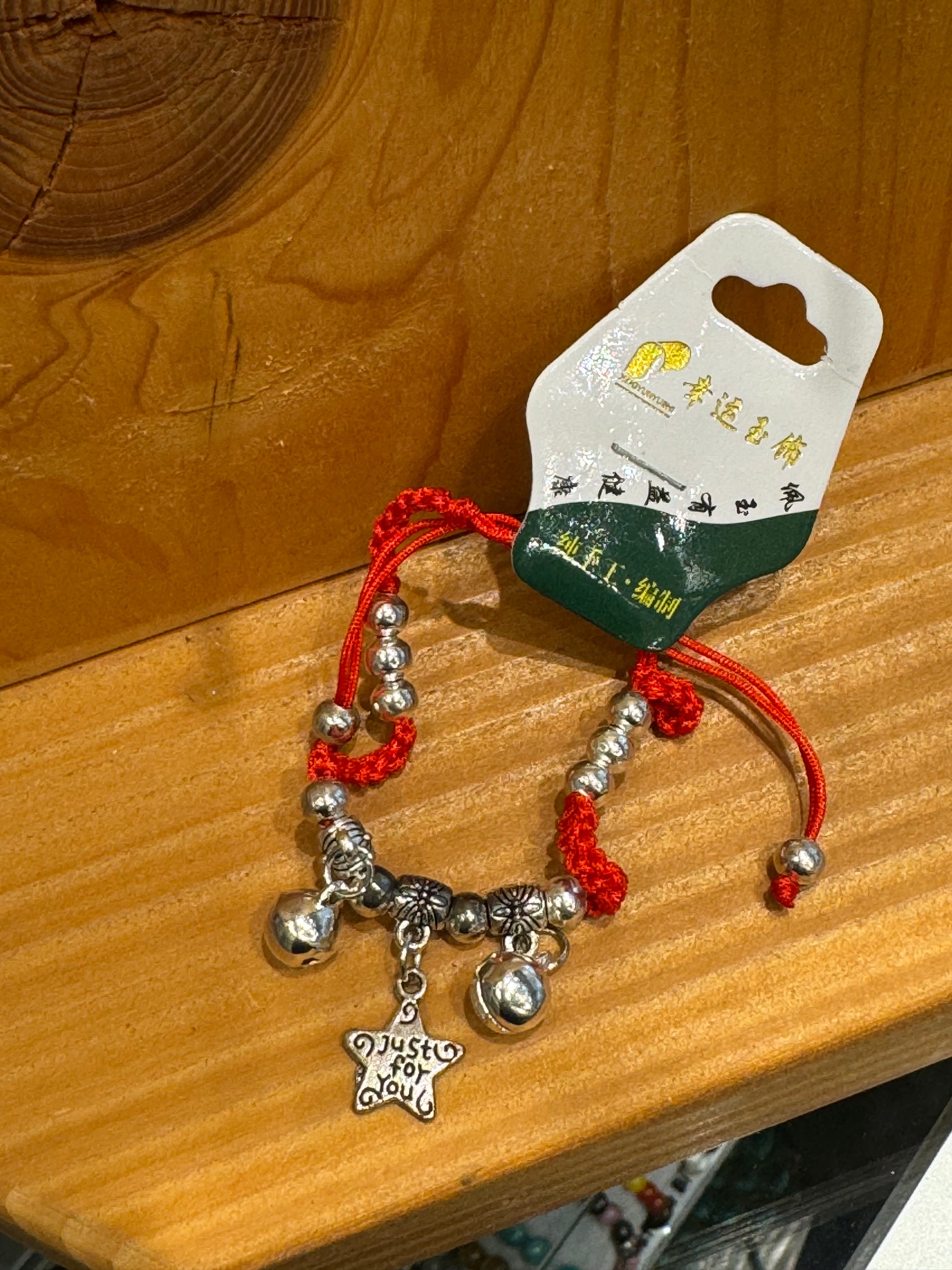 Red String Pull Tie Braided Bracelet Silver Beads,Bells and Star