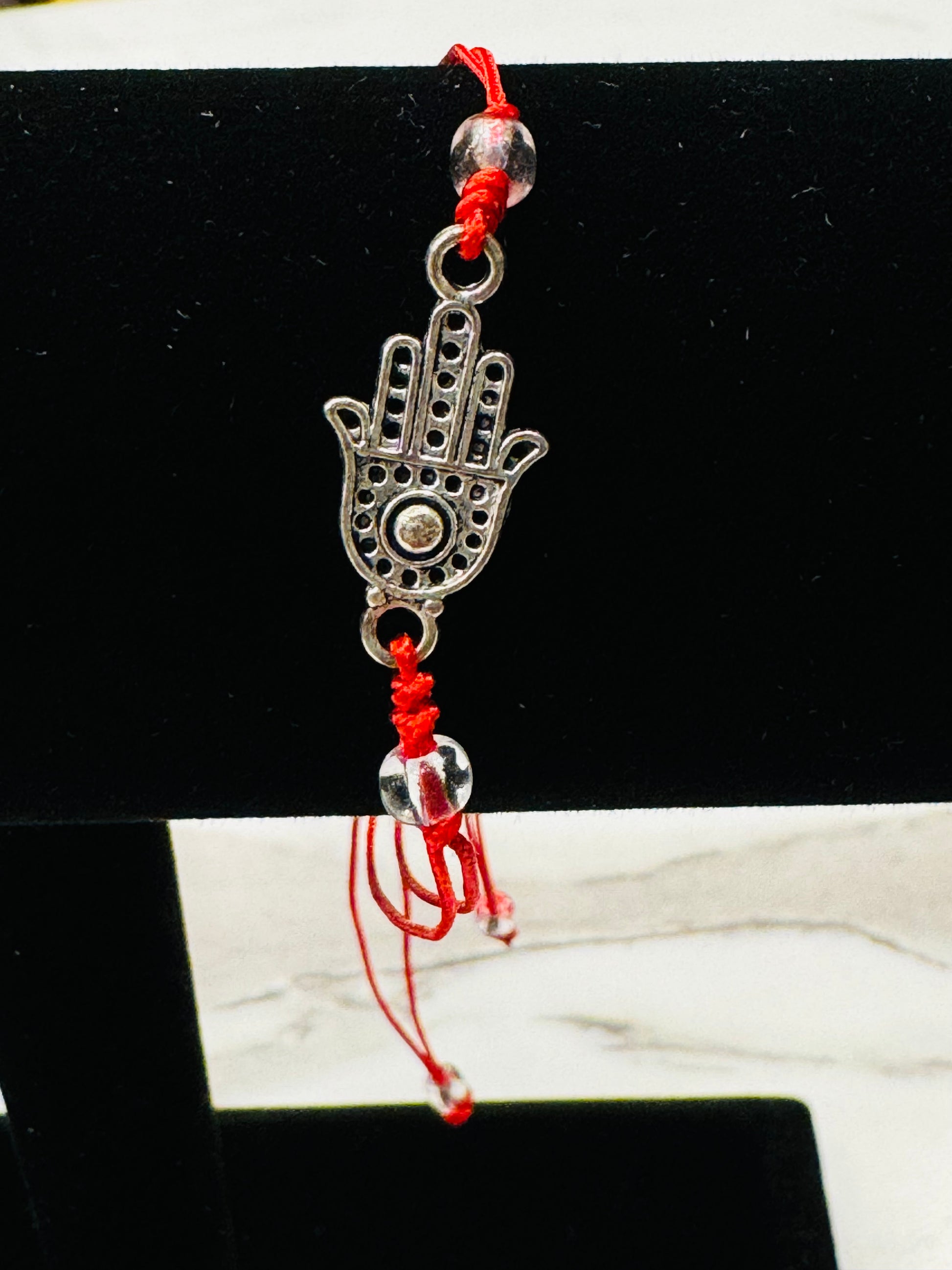 Silver Hamsa Clear Beads Red String Pull Tie Bracelet