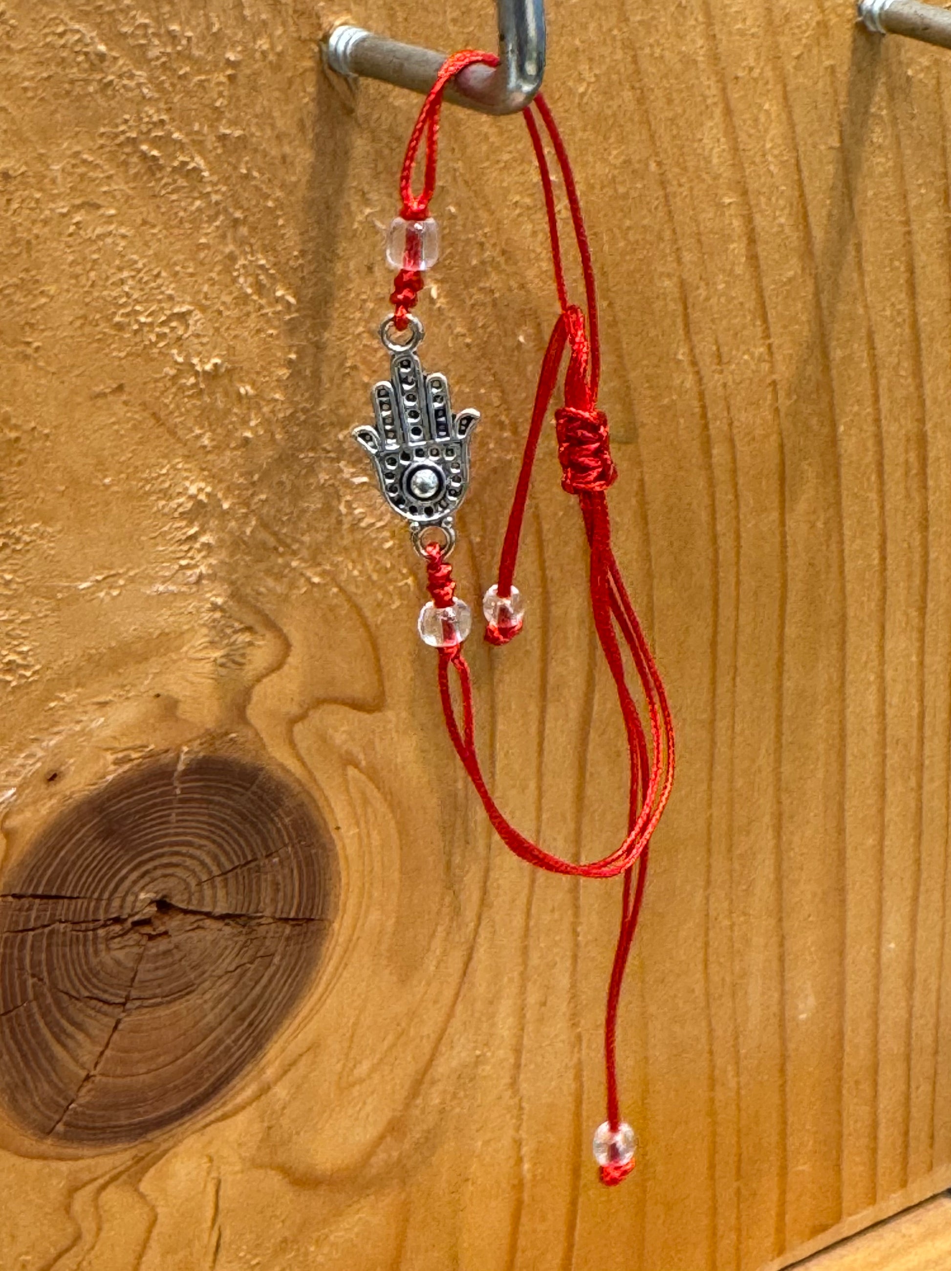 Red String Pull Tie Bracelet Hamsa Charm and Clear Beads