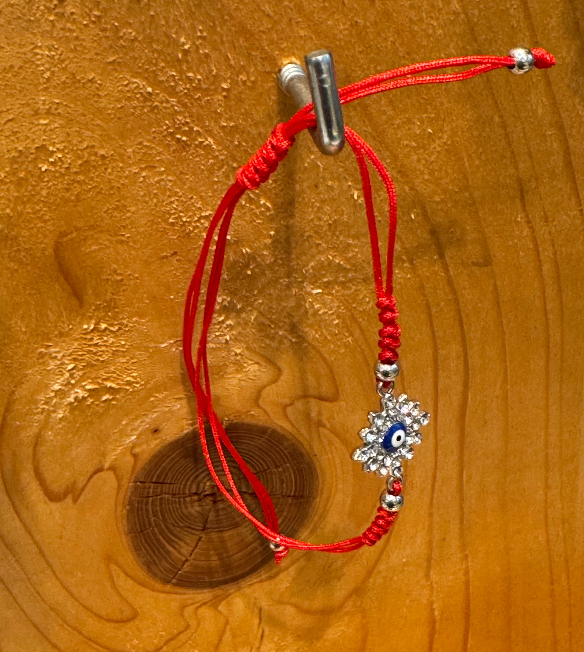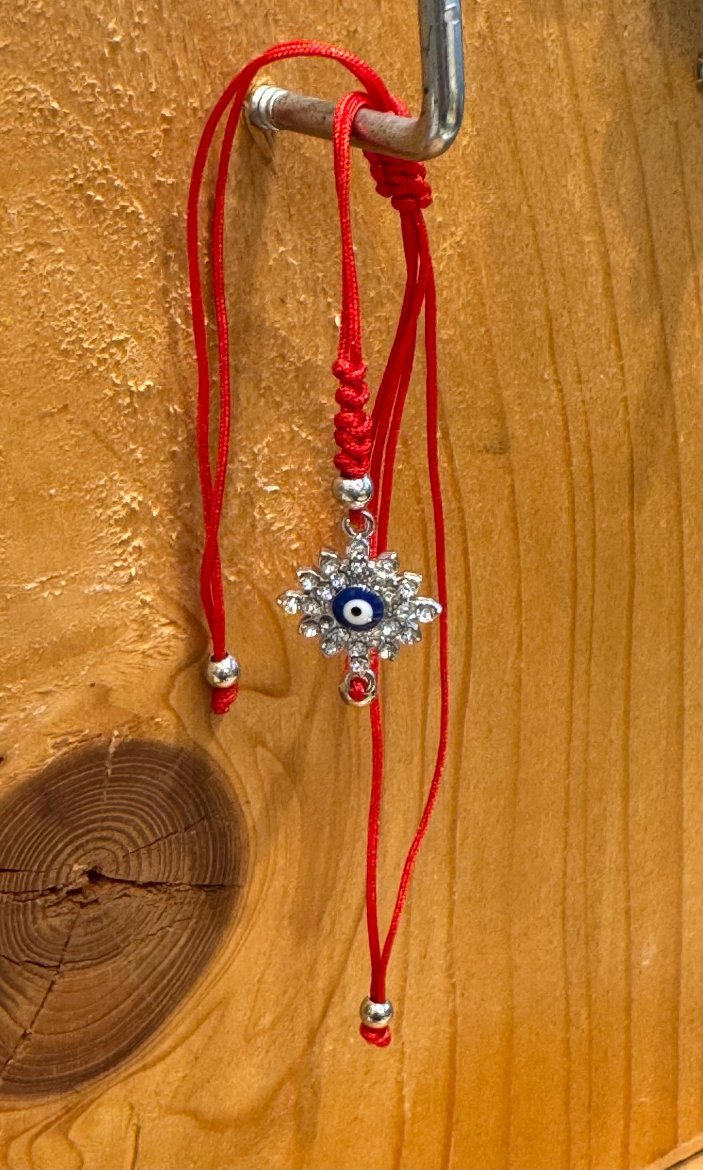Red String Pull Tie Bracelet Silver Flower Blue Evil Eye Charm and Beads