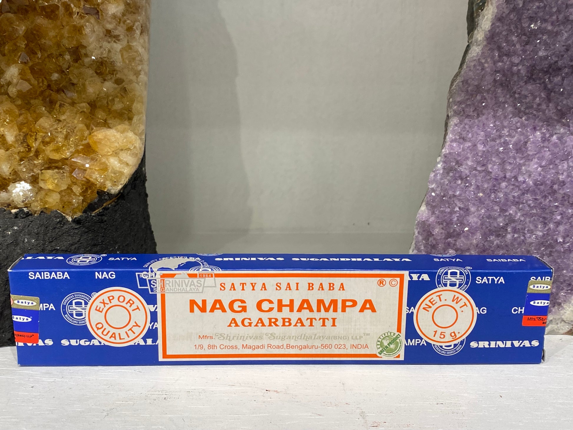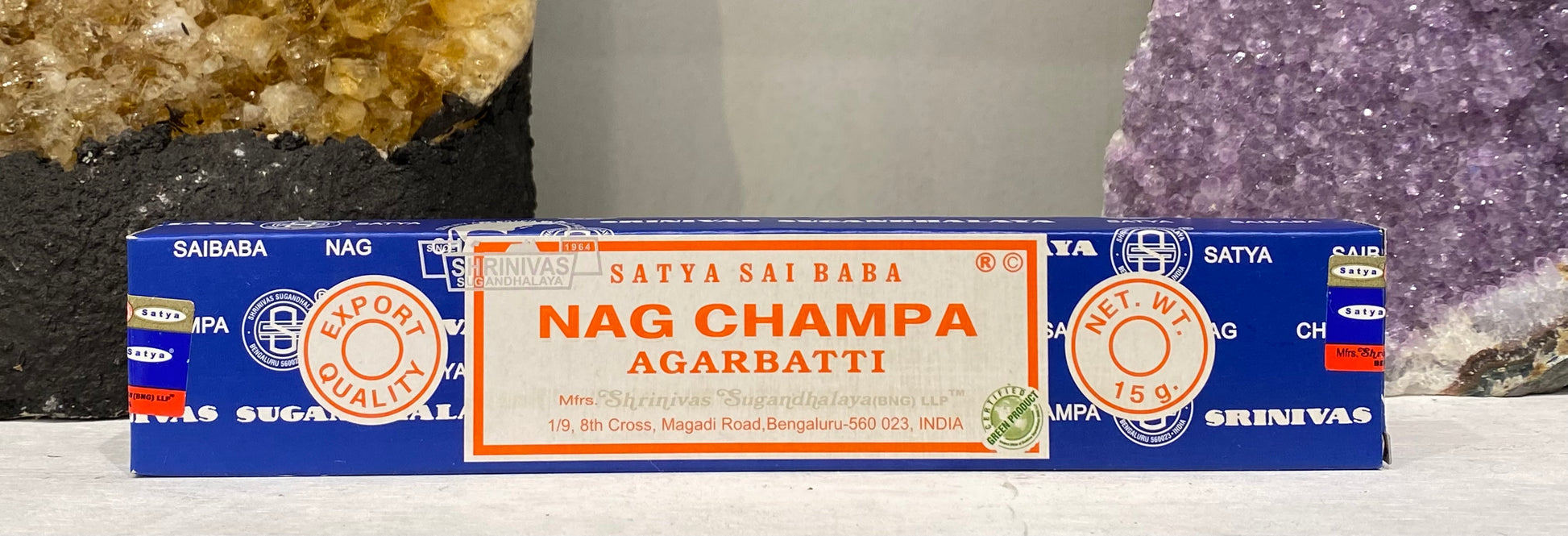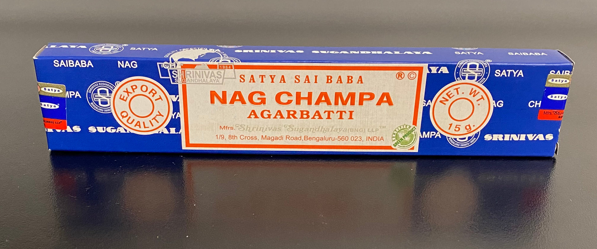 - Satya Sai Baba Nagchampa is a combination of Champa flower, floral, Oriental-Spicy aroma with a base note of wood and patchouli. It is a reminiscent of Jasmine or magnolia flowers.