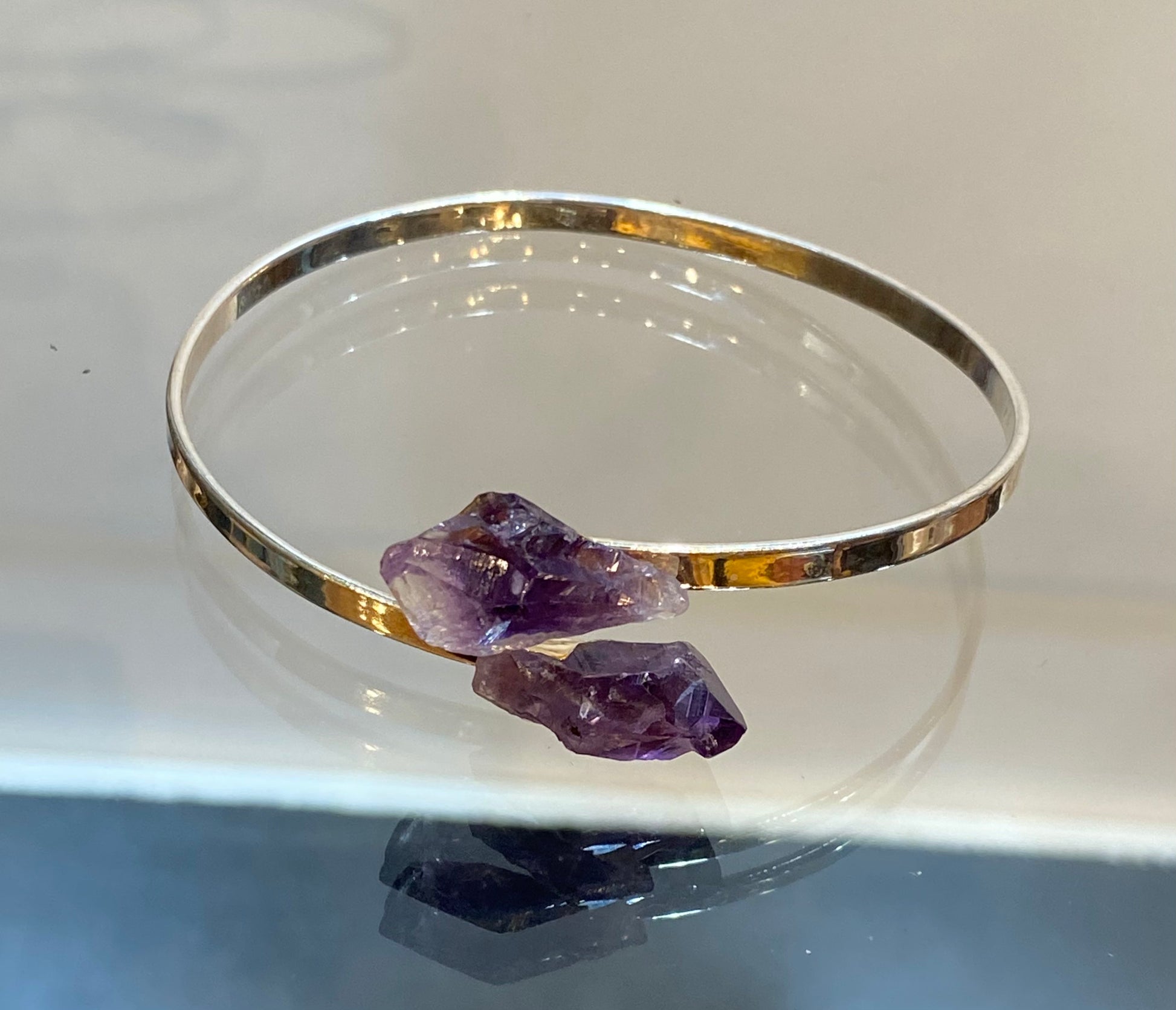 Silver Bracelet Cuff With Two Amethyst Points Crystals