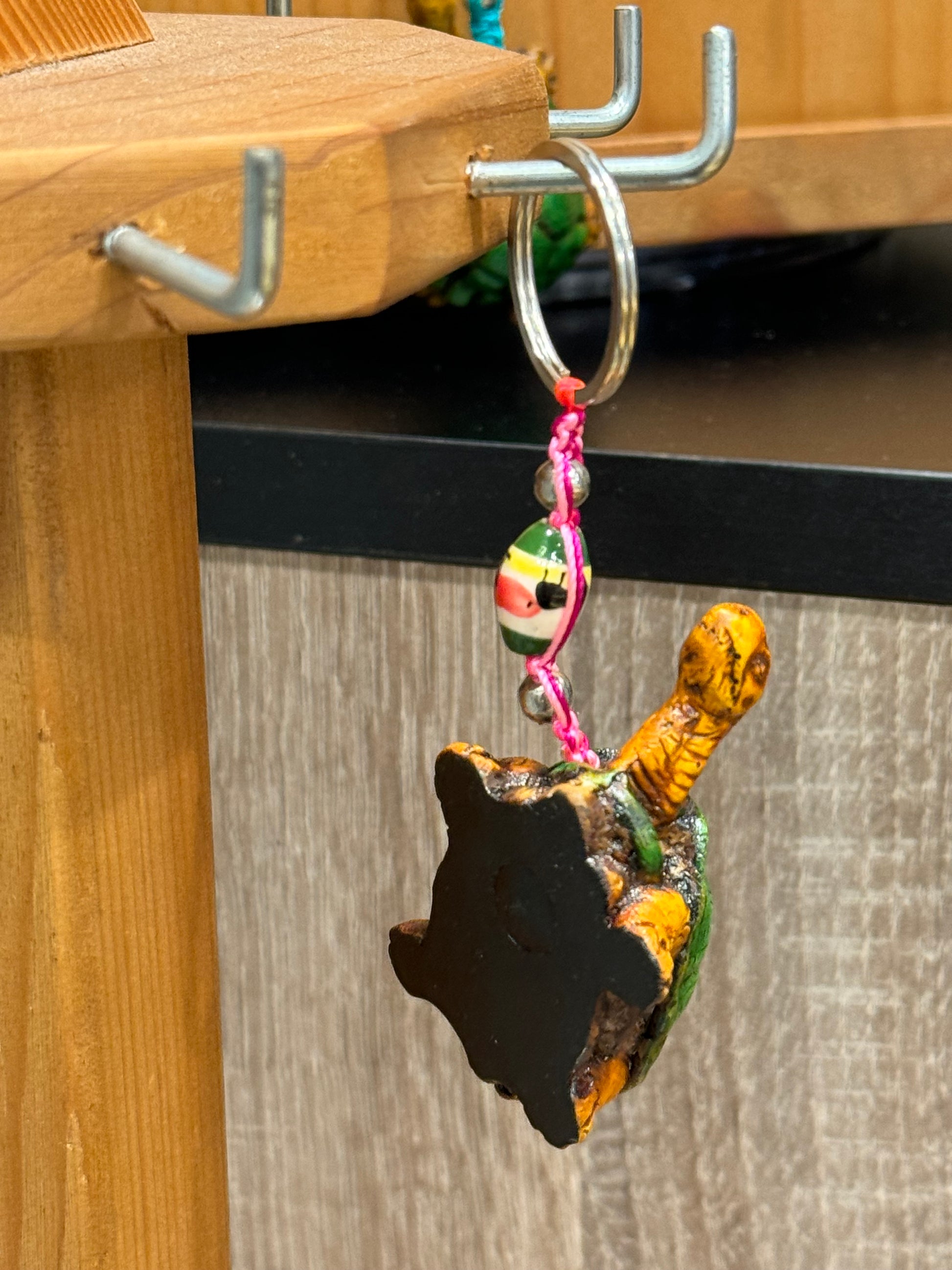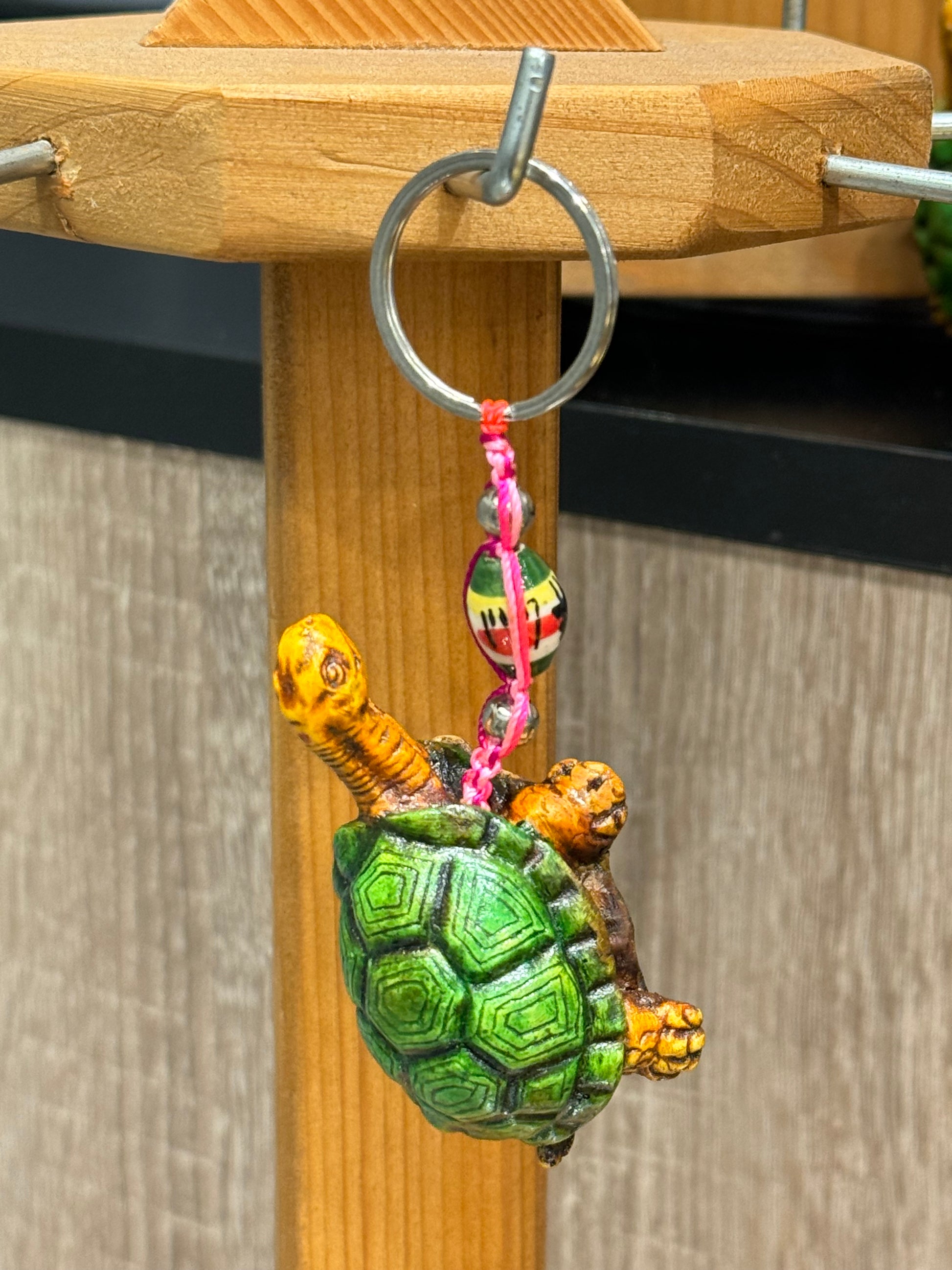Handcrafted durepox resin figurine keychain of a green and brown land turtle. Braided macramé, large bead, and metal keyring attached. Link keychain to your keys, wallet, backpack, or purse!